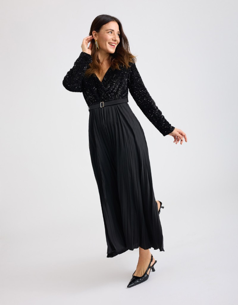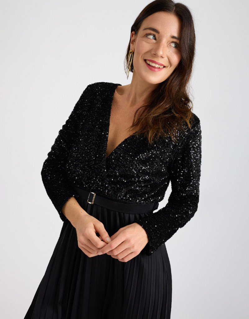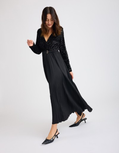 Abito lungo che unisce due materiali diversi. Il top in tessuto floccato con paillettes cucite illumina il look con una brillantezza elegante, mentre la gonna plissé in raso satinato dona movimento e un’allure raffinata. La scollatura incrociata slancia la figura e, insieme all’elastico e alla cinturina regolabile in vita, garantisce una vestibilità comoda e femminile. La fodera interna del top assicura comfort e stabilità.
