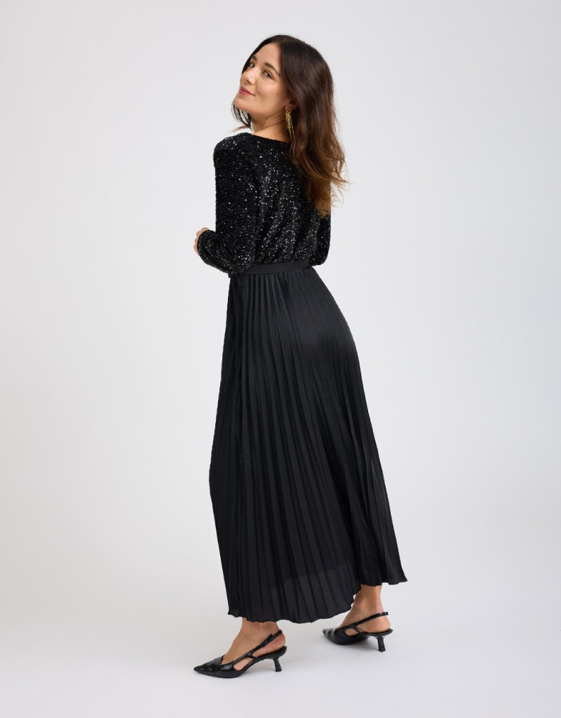 Mix di materiali: top floccato con paillettes + gonna satinata plissé