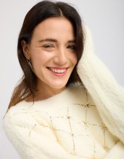 Questo maglione in tessuto “peloso” caldo e morbidissimo diventa subito il protagonista del look grazie alle paillettes dorate cucite a formare eleganti rombi. La vestibilità morbida lo rende accogliente senza rinunciare allo stile, perfetto per aggiungere un tocco luminoso alle giornate fredde della stagione.
