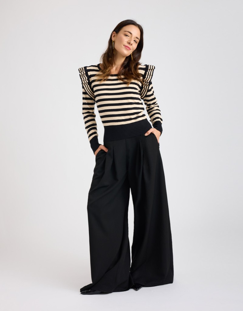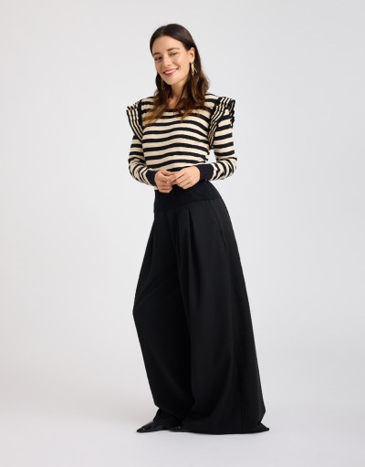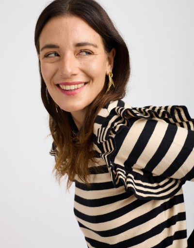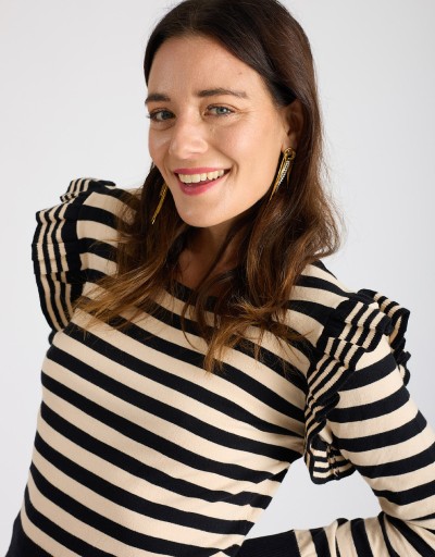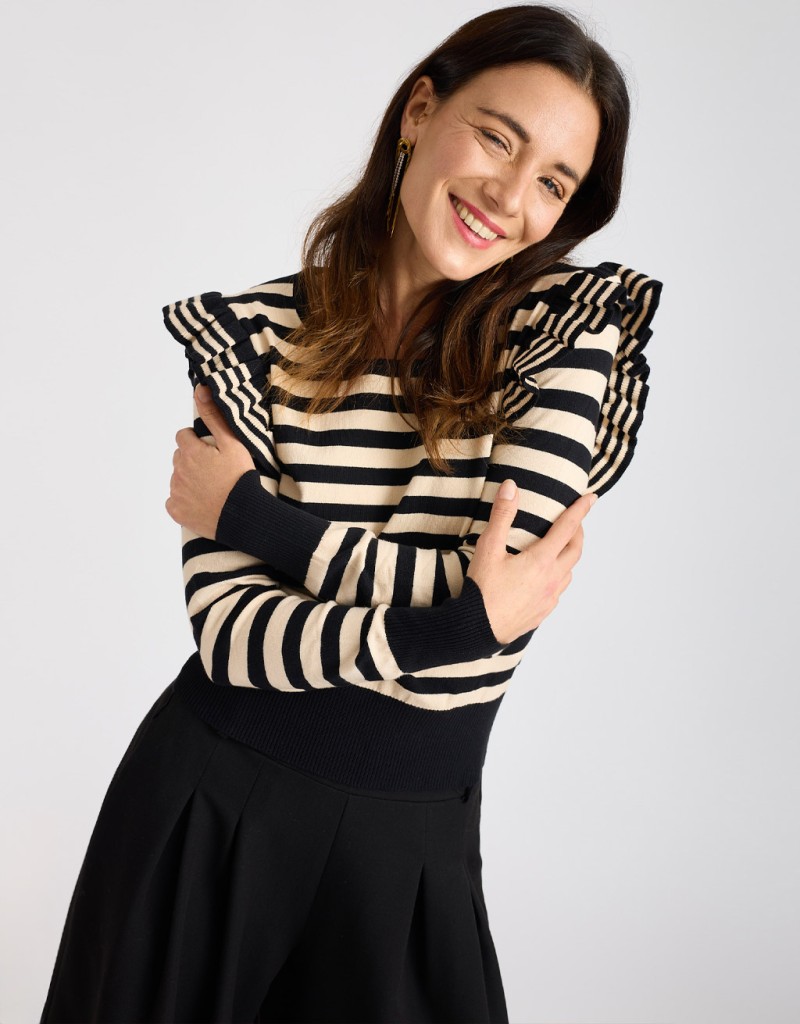 Questo maglioncino in tessuto caldo ed elasticizzato unisce la freschezza della fantasia a righe a un dettaglio super femminile: il volant che incornicia il giromanica. La vestibilità slim valorizza la silhouette senza rinunciare al comfort, rendendolo il capo ideale per aggiungere un tocco trendy e delicato ai look di stagione.