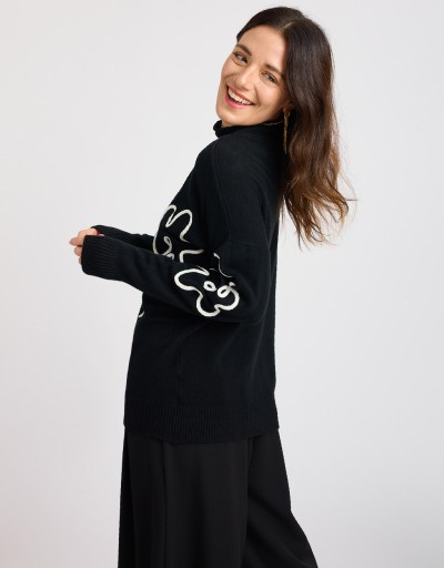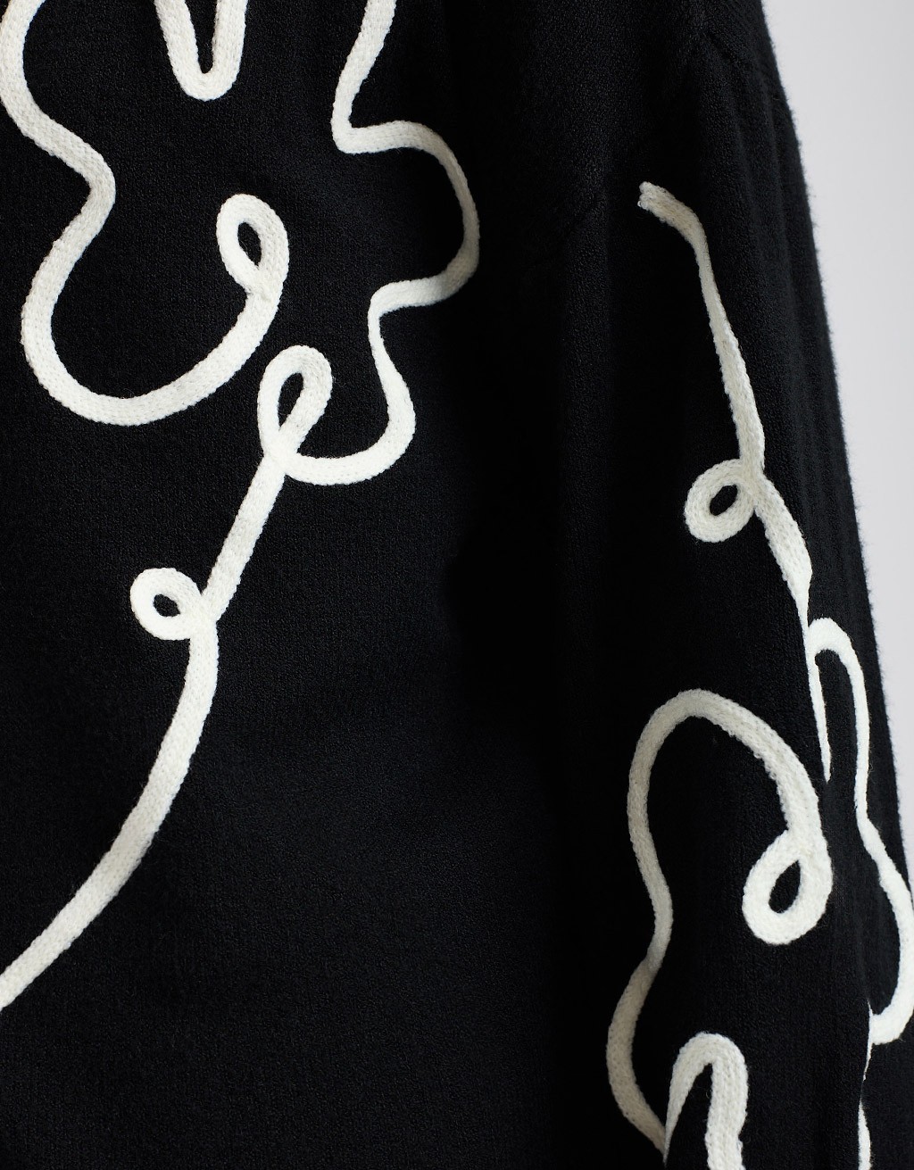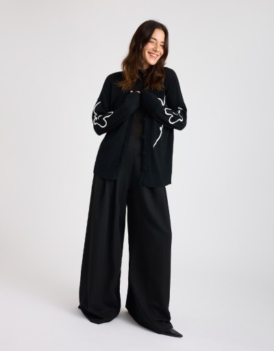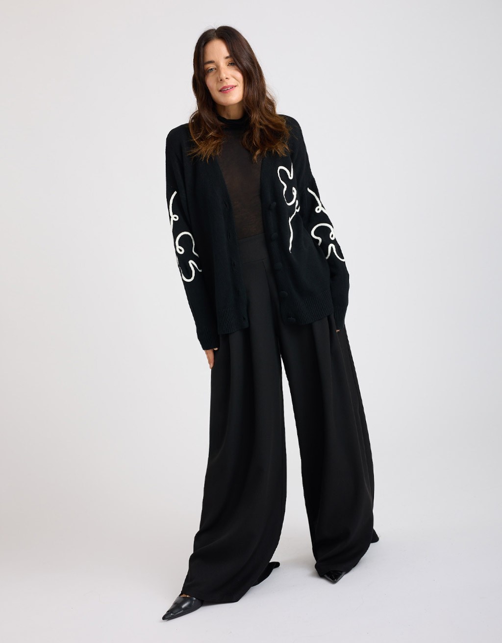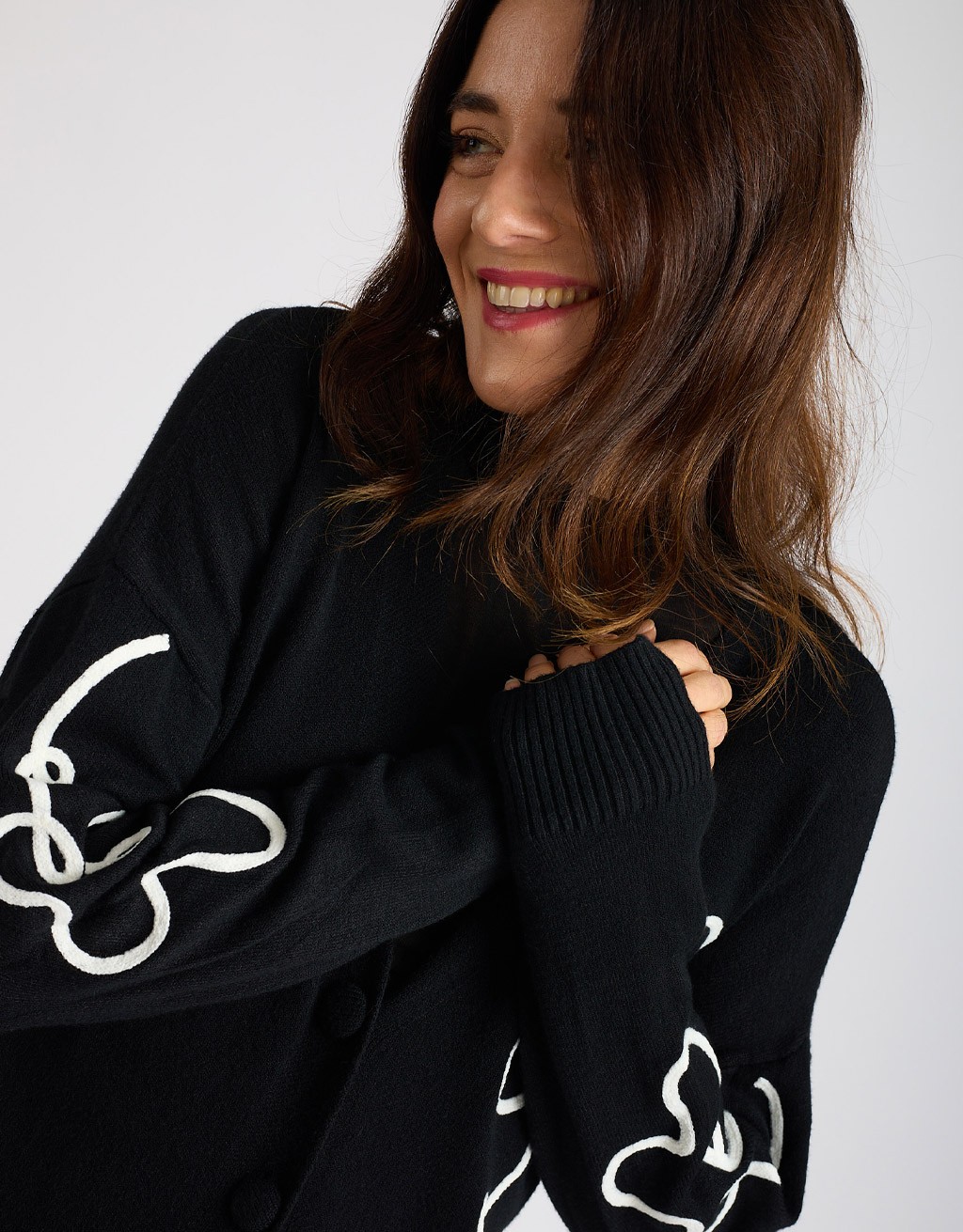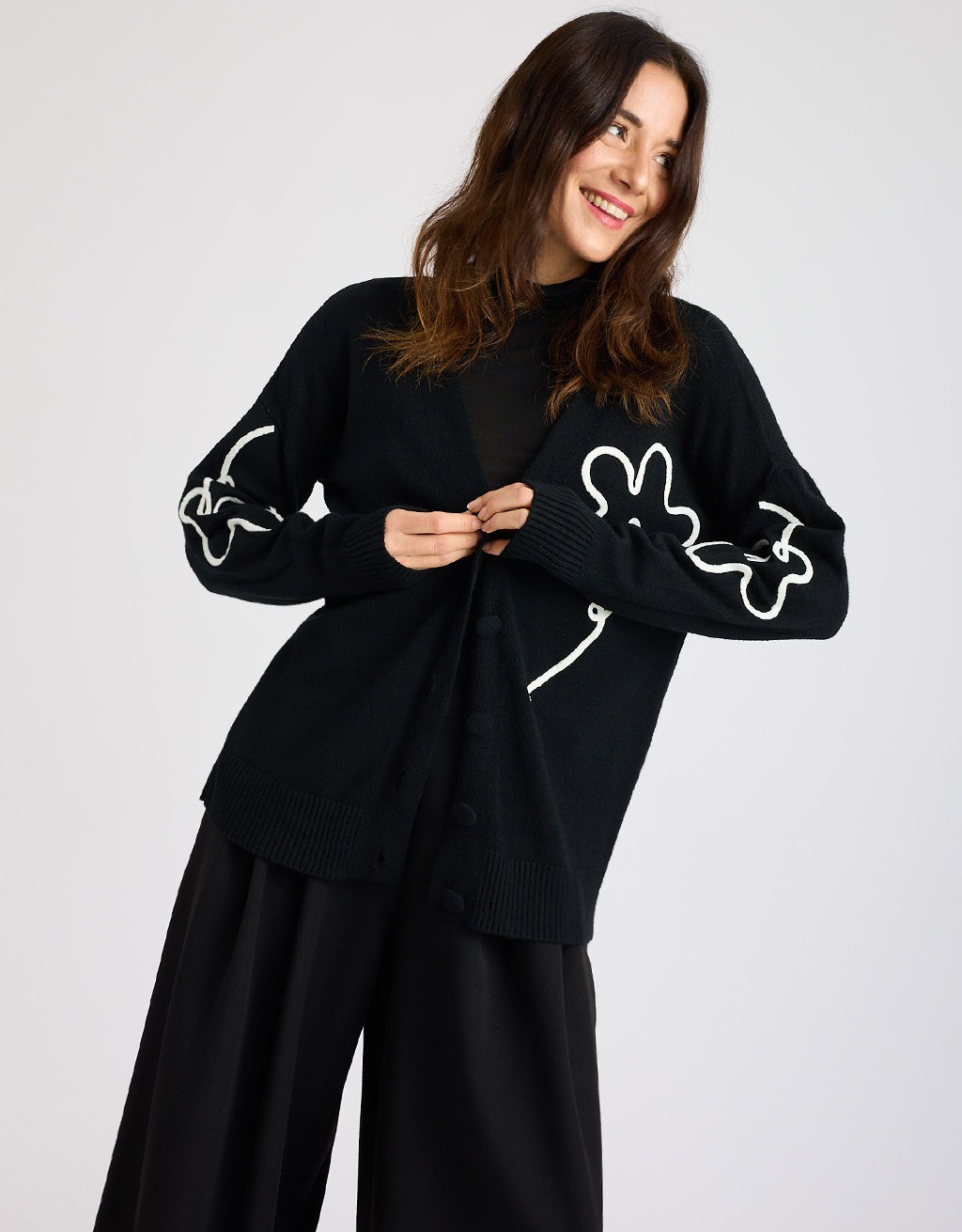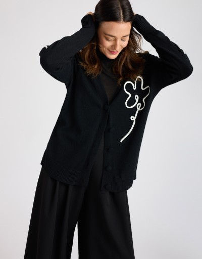Questo cardigan in morbida maglia tinta unita conquista con i suoi ricami a contrasto, un dettaglio che dona personalità e un tocco romantico al capo. La scollatura a V e la vestibilità over lo rendono comodo, versatile e perfetto per i look di stagione, ideale da indossare nelle giornate fresche per aggiungere calore e stile senza sforzo.