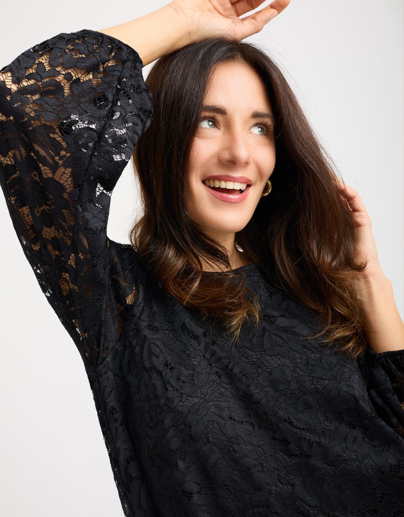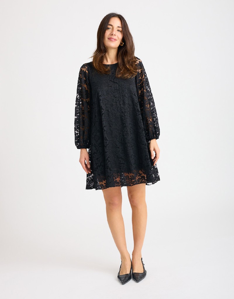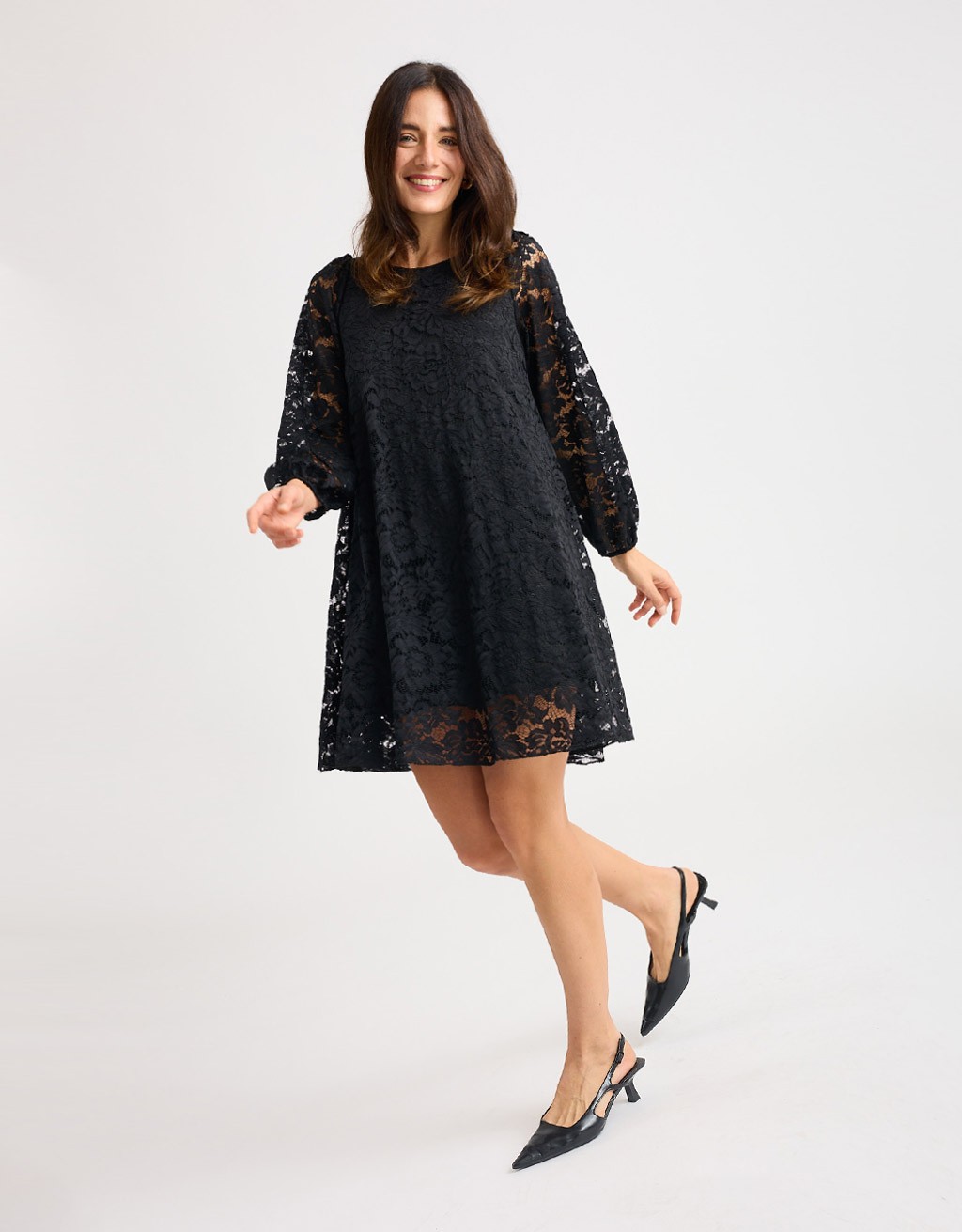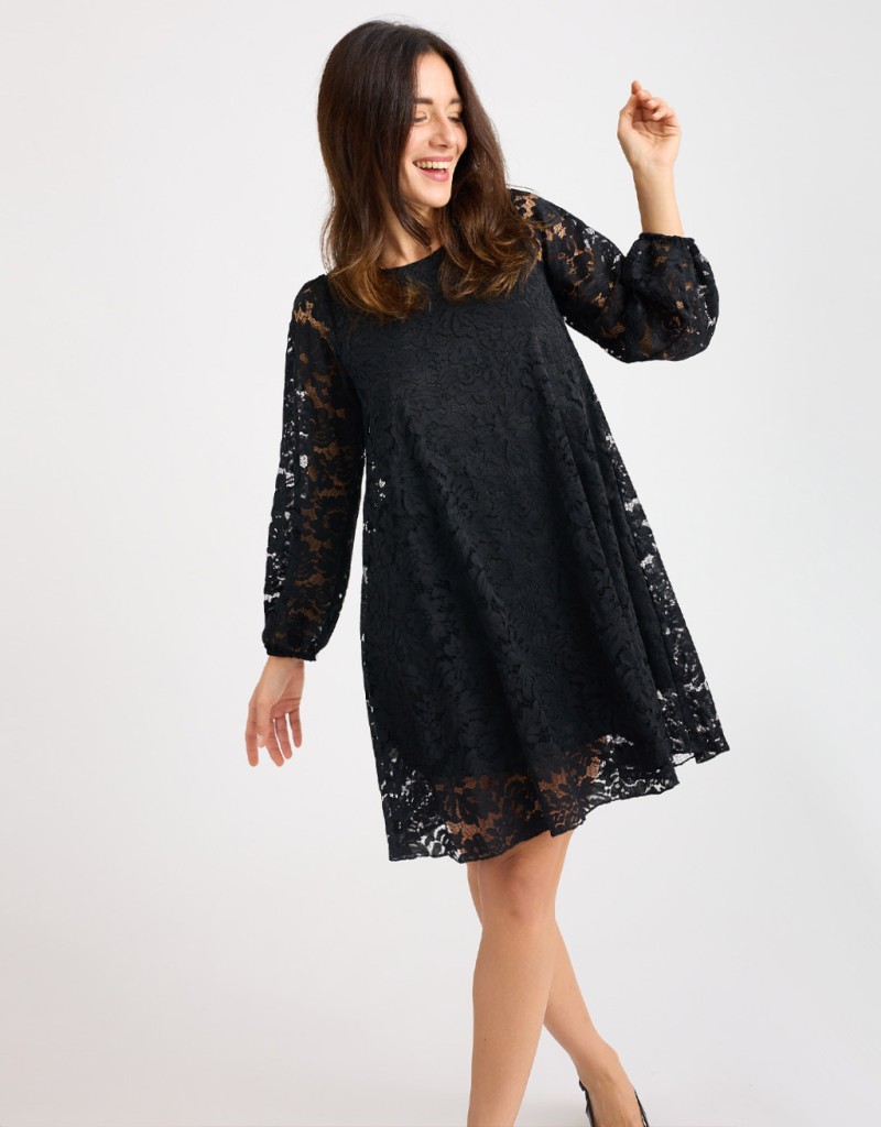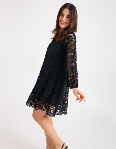 Un abito corto in pizzo dal fascino delicato e senza tempo. La vestibilità morbida e leggermente svasata dona comfort e movimento naturale, mentre la scollatura a giro mantiene il look pulito e raffinato. La chiusura con bottoncino sul collo aggiunge un tocco romantico, completato dalla fodera interna che assicura comodità e una caduta impeccabile.