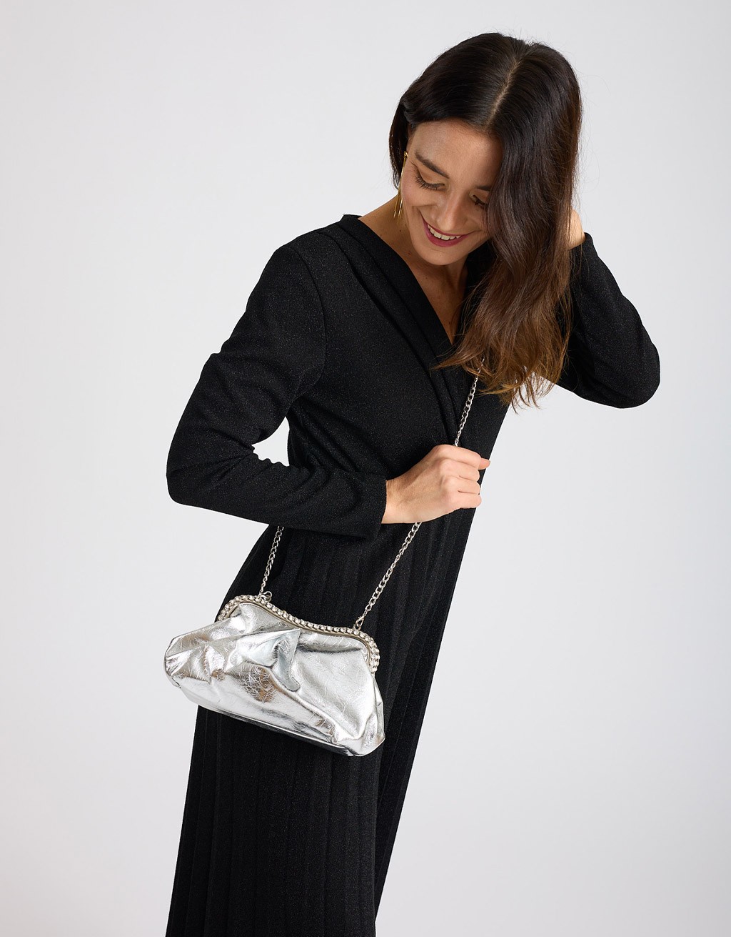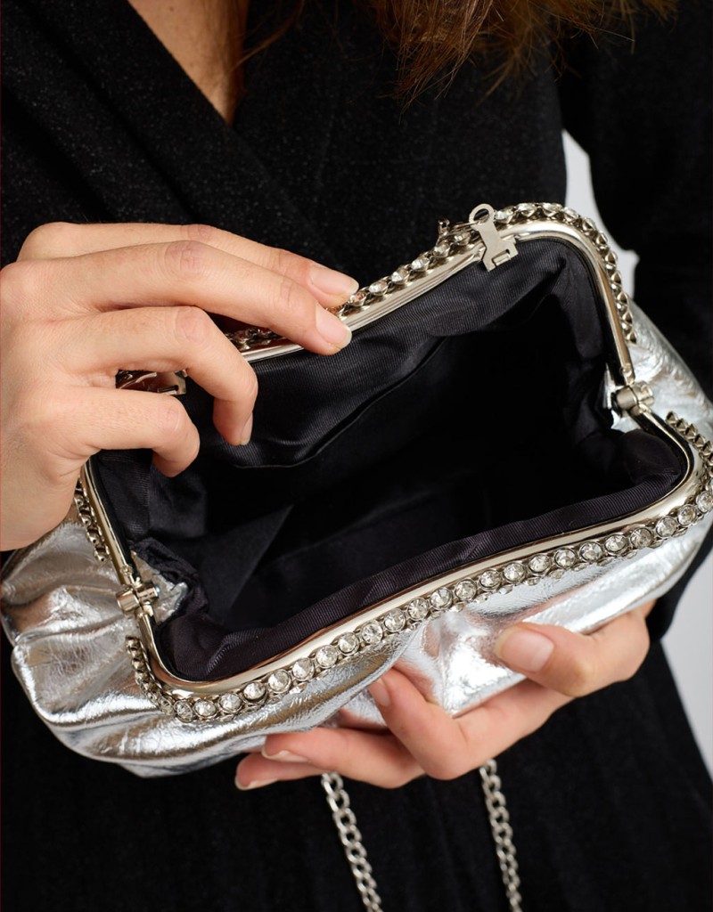 La catena in metallo dal design elegante permette di portarla comodamente a spalla o a tracolla oppure rimossa ed essere portata a mano, unendo stile e praticità. Compatta ma funzionale, è ideale per custodire l’essenziale durante eventi, cene e occasioni speciali.