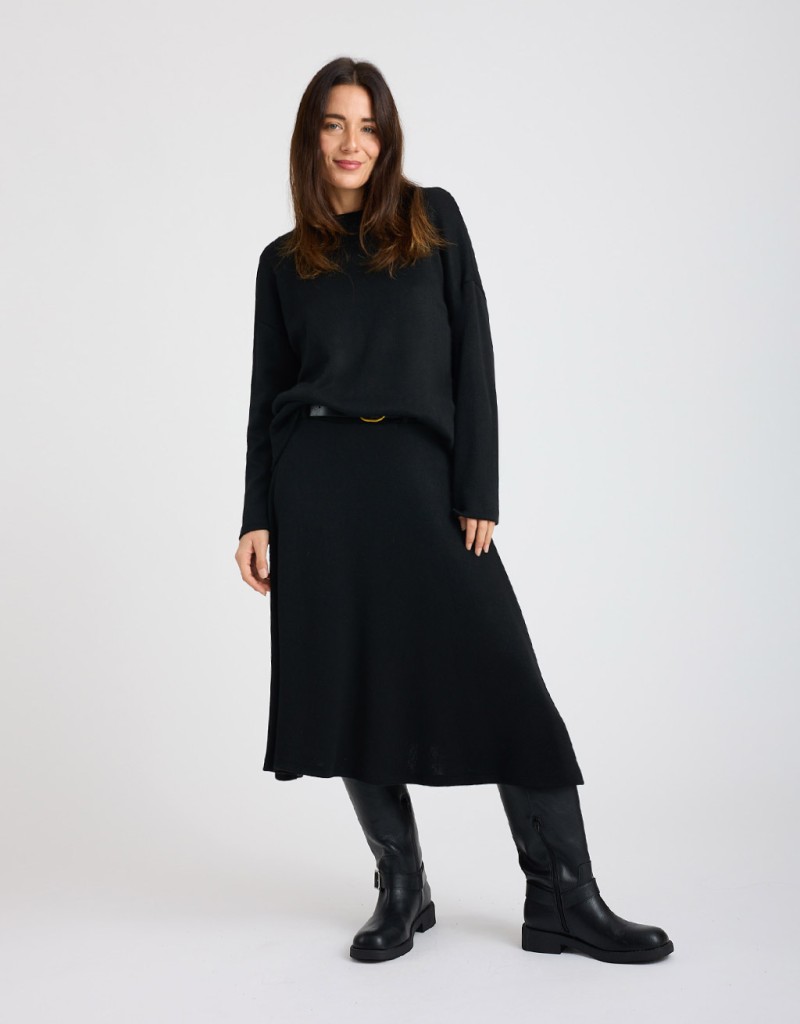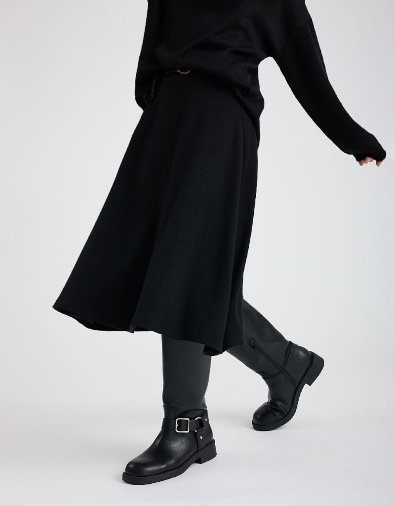 Questa gonna midi unisce calore e femminilità in un capo facile da indossare tutti i giorni. Il tessuto morbido e caldo crea una silhouette fluida, mentre la linea svasata dona movimento e leggerezza. L’elastico in vita assicura una vestibilità comoda e adattabile, perfetta per accompagnarti nelle giornate fresche con stile.