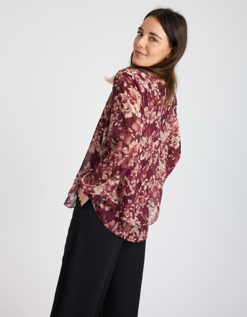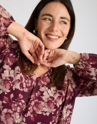 Questa camicetta over in georgette fantasia ha una scollatura a V morbida e femminile, è composta da due strati sovrapposti che coprono le trasparenze e creano una lieve balza. Il fit ampio dona movimento e comfort, rendendola ideale per aggiungere un tocco elegante ma disinvolto ai look di tutti i giorni.