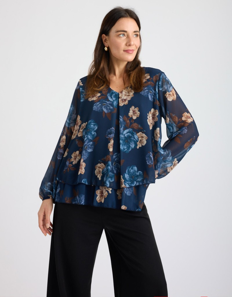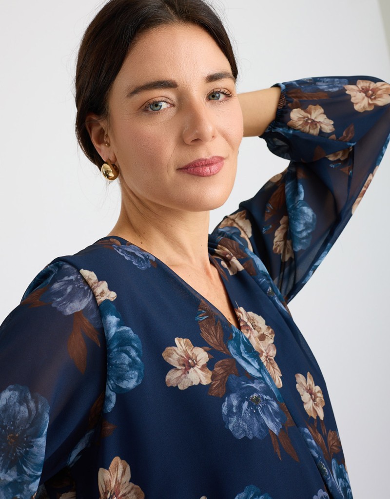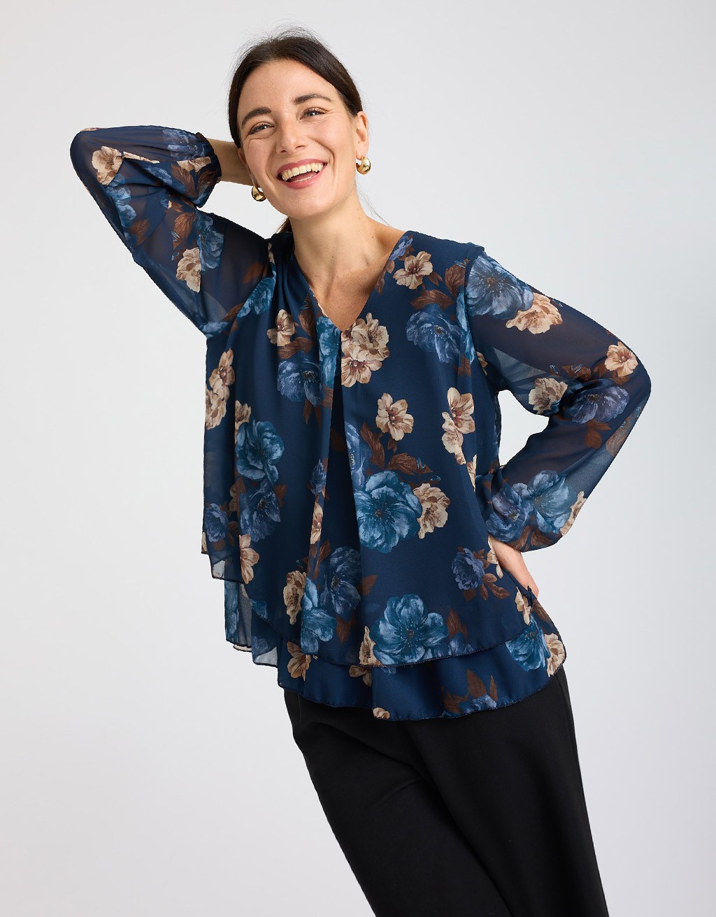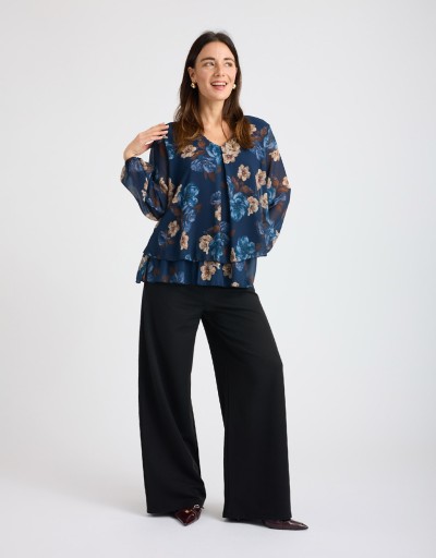Questa camicetta over in georgette fantasia ha una scollatura a V morbida e femminile, è composta da due strati sovrapposti che coprono le trasparenze e creano una lieve balza. Il fit ampio dona movimento e comfort, rendendola ideale per aggiungere un tocco elegante ma disinvolto ai look di tutti i giorni.