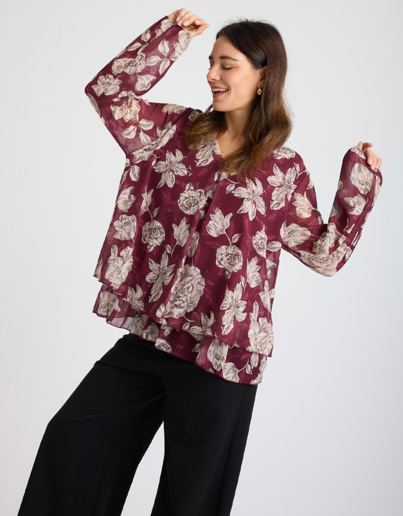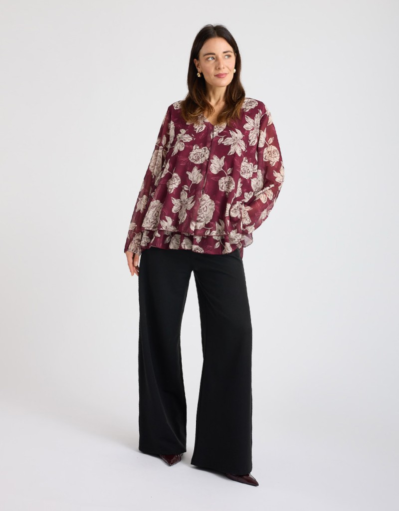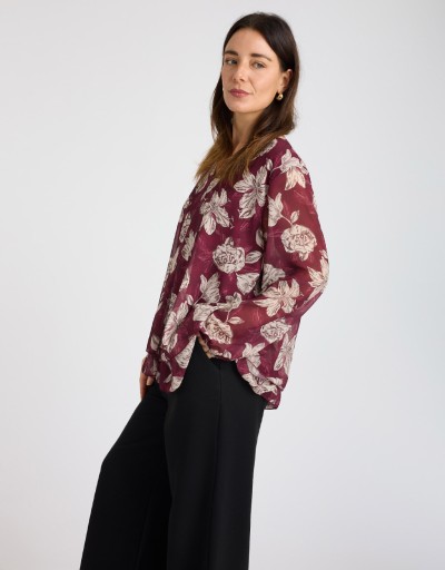 Questa camicetta over in georgette fantasia ha una scollatura a V morbida e femminile, è composta da due strati sovrapposti che coprono le trasparenze e creano una lieve balza. Il fit ampio dona movimento e comfort, rendendola ideale per aggiungere un tocco elegante ma disinvolto ai look di tutti i giorni.