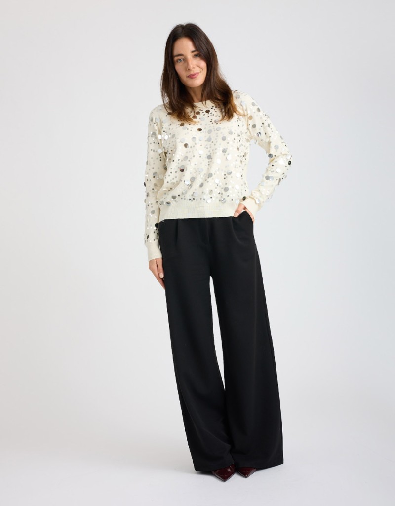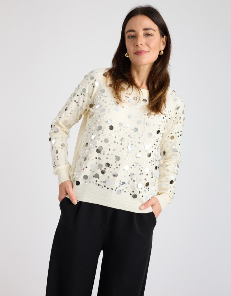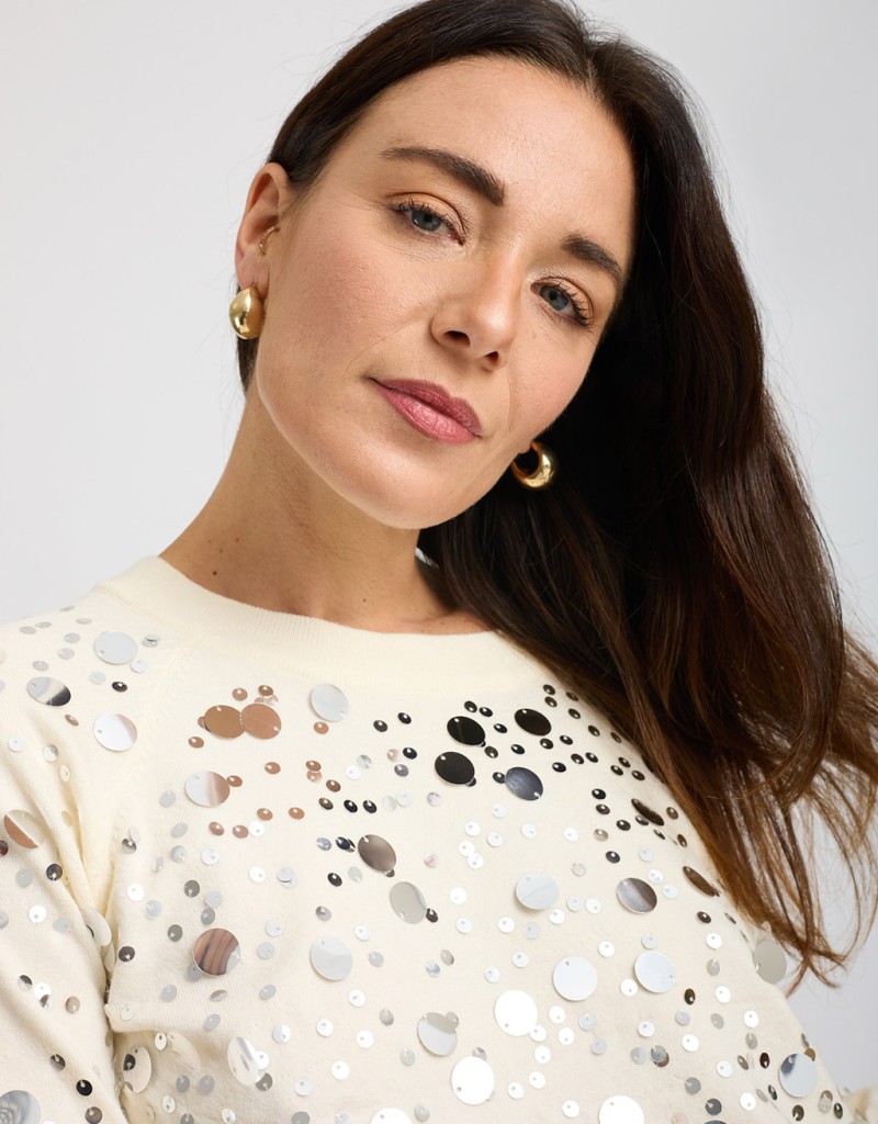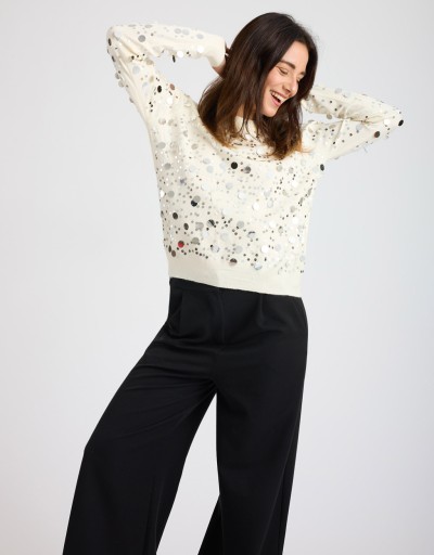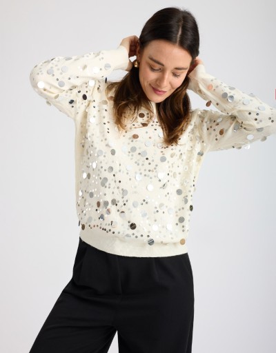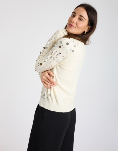 Maglione elasticizzato con paillettes applicate nella parte frontale, perfetto per le feste.