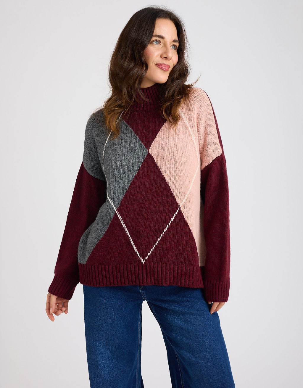 (Ogni 1,00 € speso = 1 punto)Caldo maglione dal fit over con lavorazione frontale a rombi e collo con coste a vulcano. Tessuto misto con lana e alpaca.