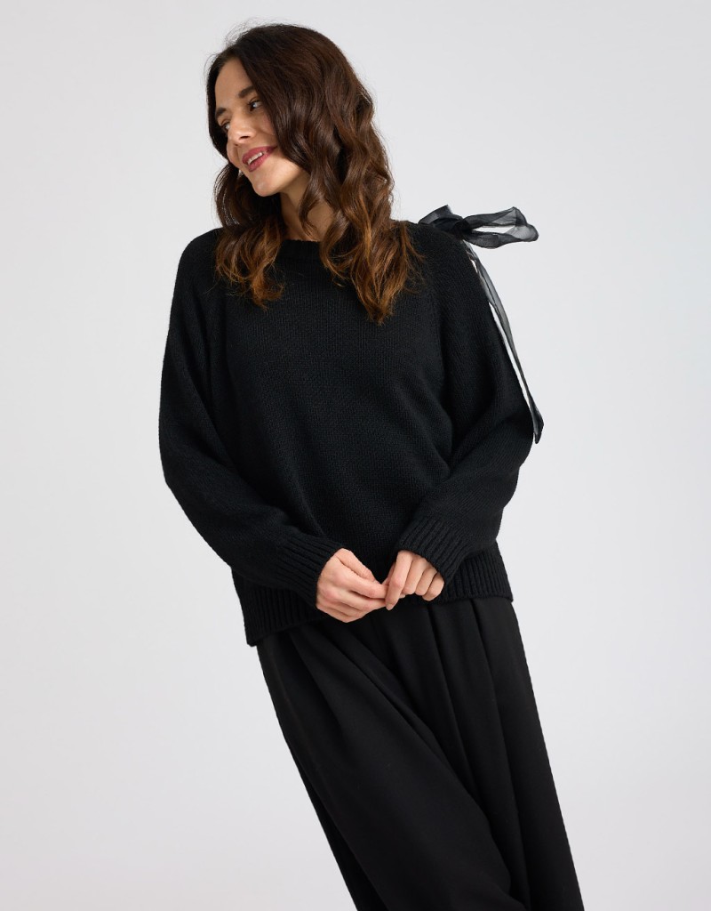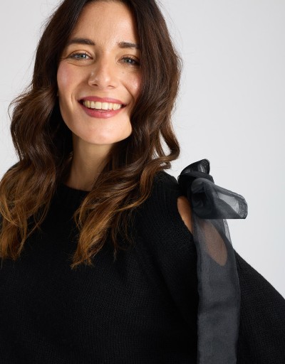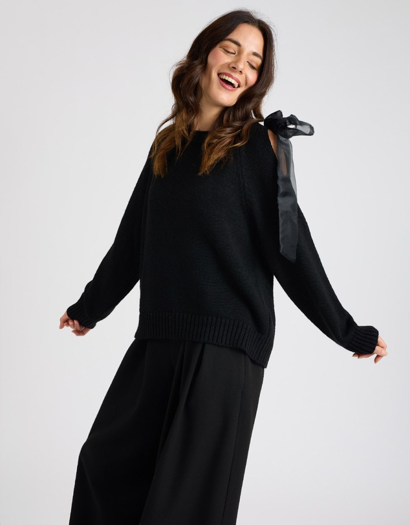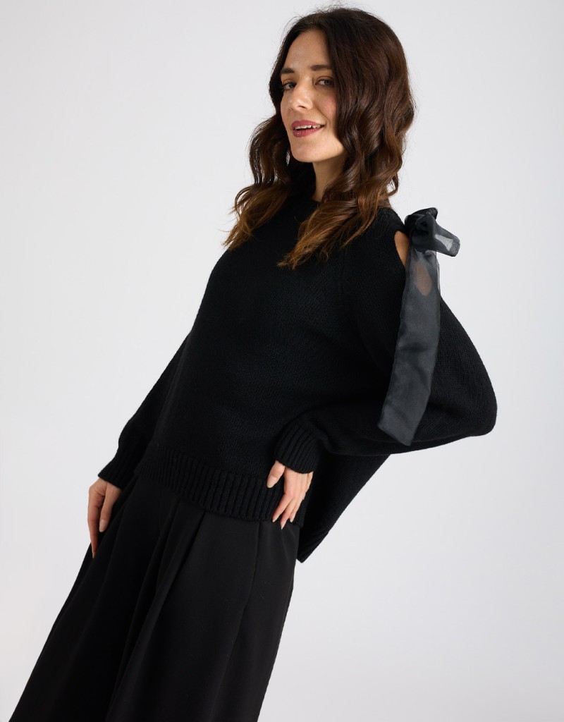 Caldo maglione in misto lana ed alpaca con fiocco sulla spalla.