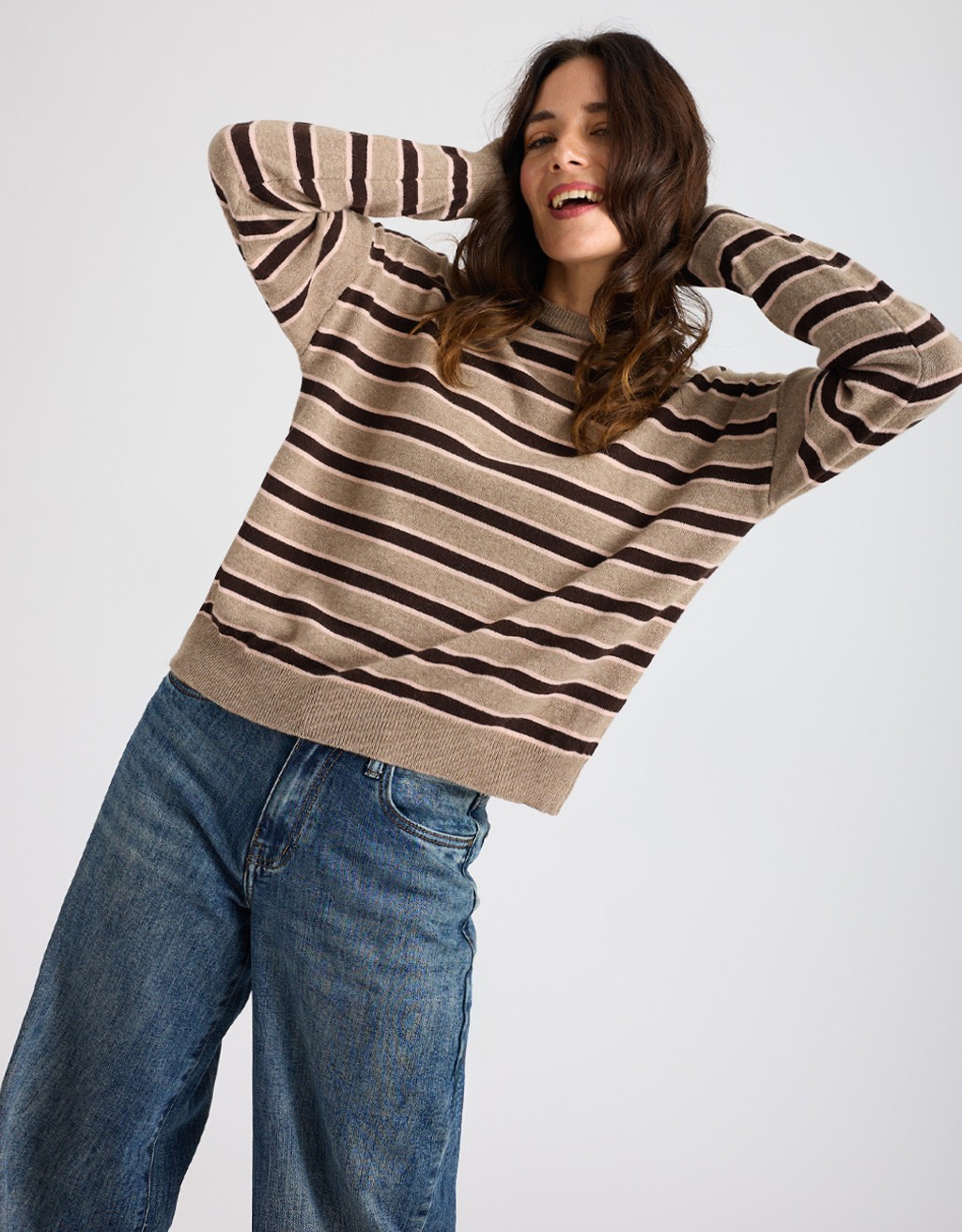 Caldo maglioncino a girocollo in misto lana e cashmere in fantasia a righe.