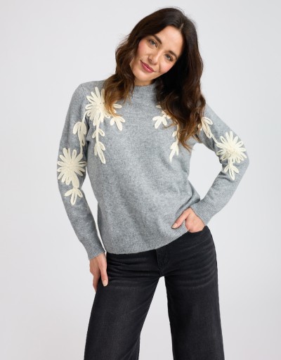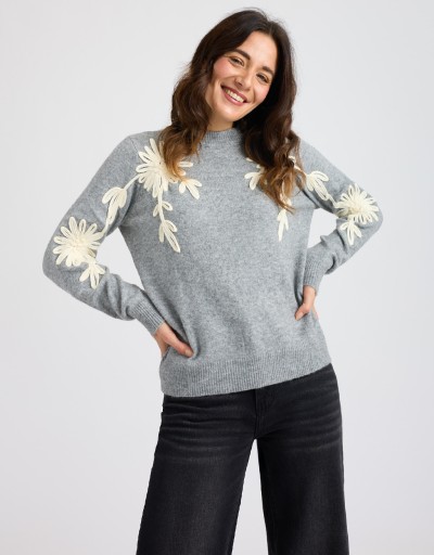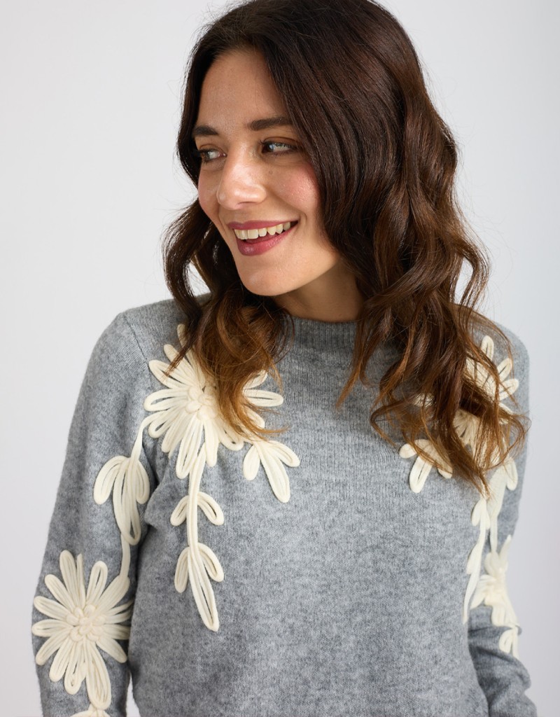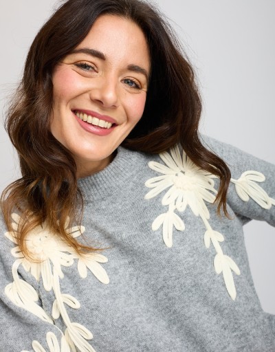 Caldo maglione in misto lana con scollatura a giro ed eleganti ricami floreali davanti e sulle maniche.