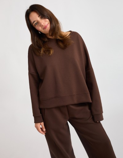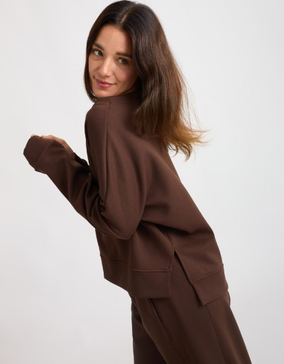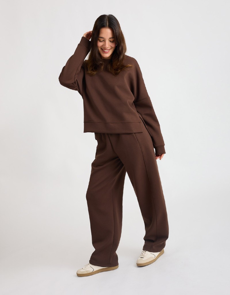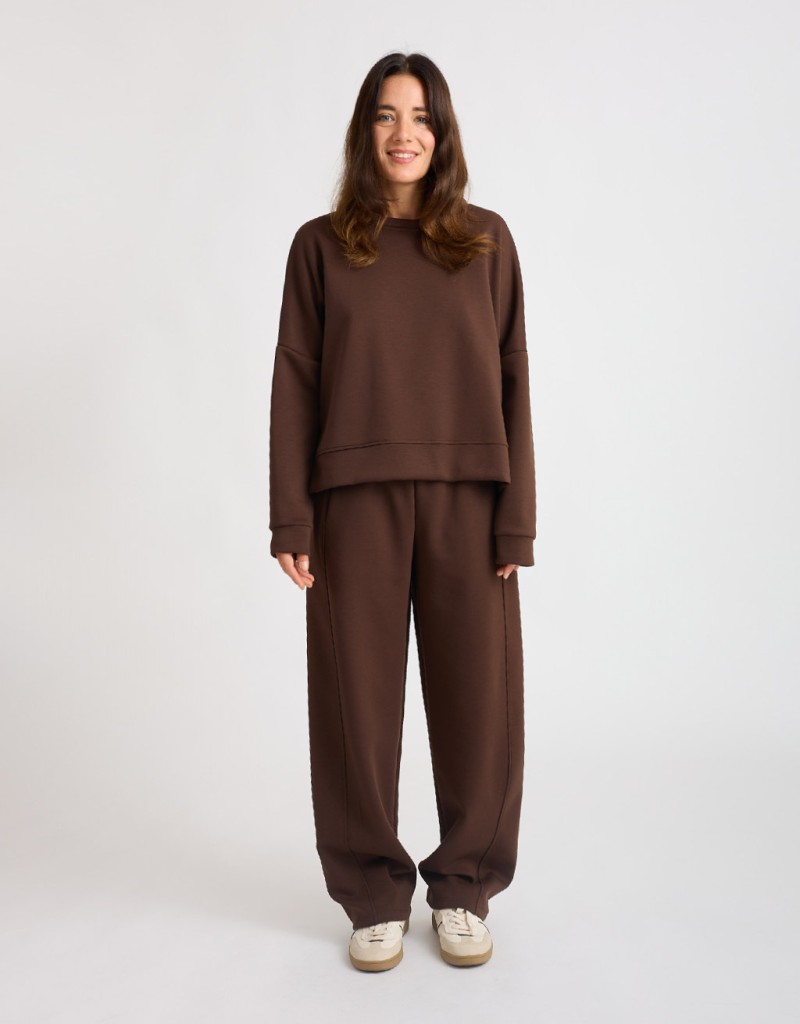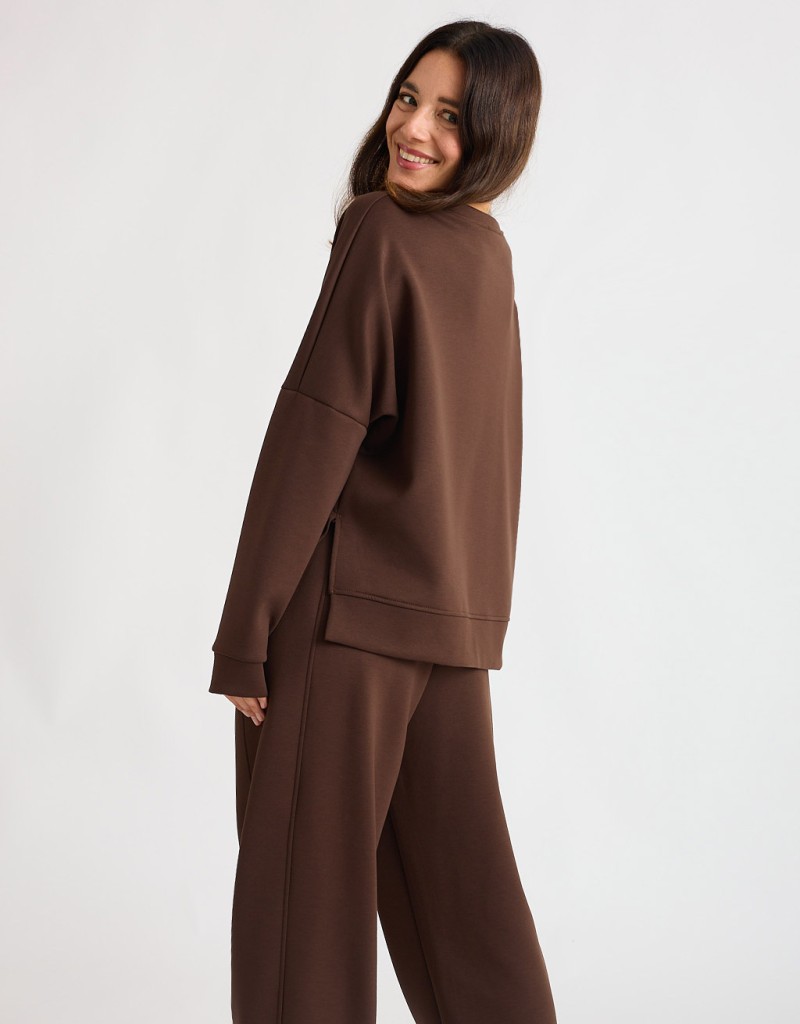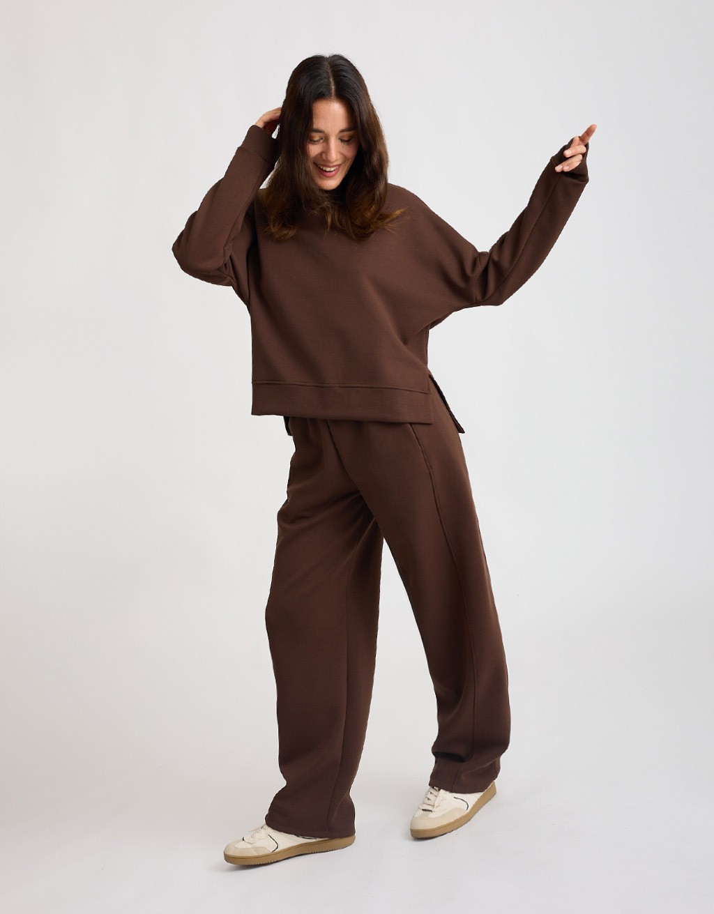 Comodo ma super trendy: questo completo in scuba felpato è la coccola perfetta per affrontare le giornate più fresche con stile. La maglia dal taglio morbido e gli spacchetti laterali regala movimento e femminilità, mentre il pantalone modello barrel dona un tocco contemporaneo e rilassato. Ideale per chi ama sentirsi curata anche nei look casual.