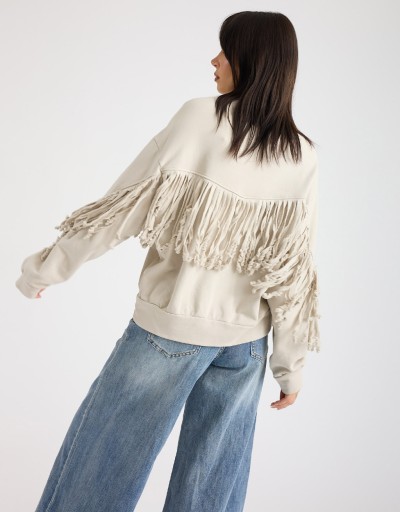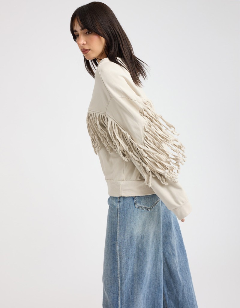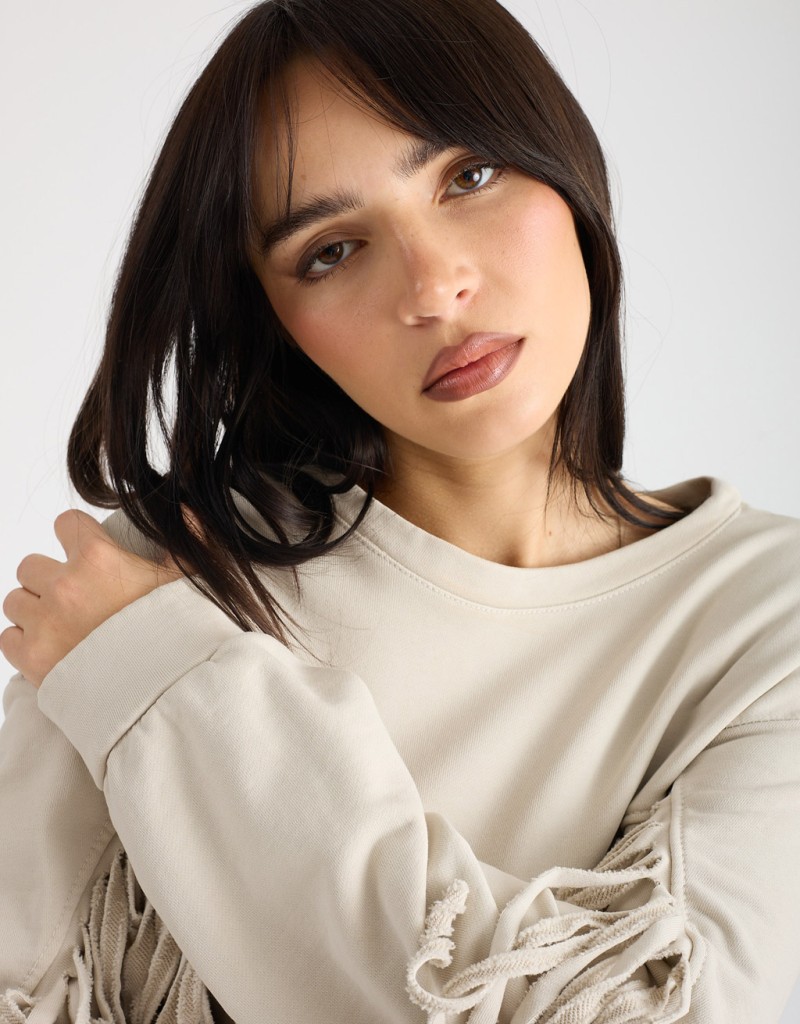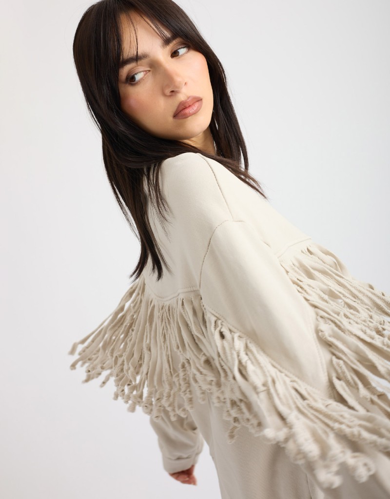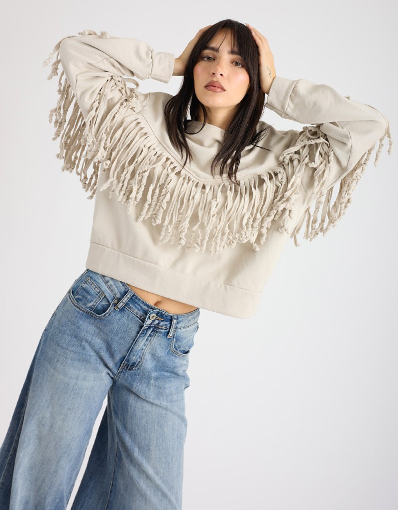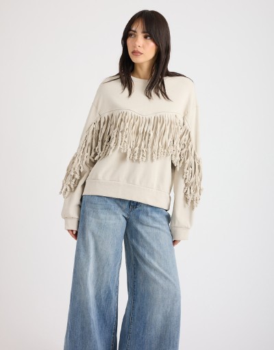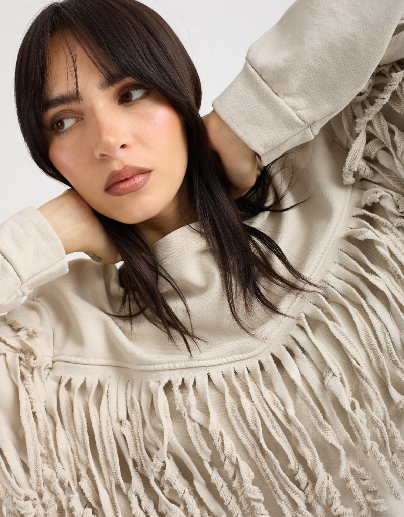 Felpa basica con scollatura a giro, arricchita da frange che le conferiscono un carattere fresco e originale. La vestibilità comoda la rende perfetta per affrontare le giornate primaverili con stile senza rinunciare al comfort, ideale da indossare in qualsiasi occasione casual.