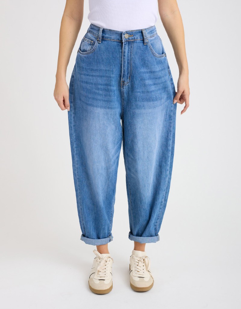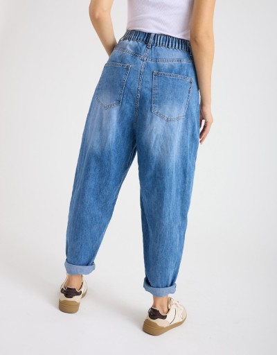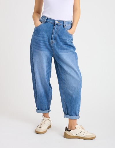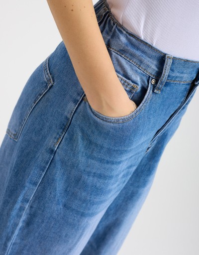 Pantalone in jeans leggero dal mood casual e moderno, modello baggy che garantisce comfort e libertà di movimento. La chiusura frontale con bottone e cerniera si abbina all’elastico in vita sul retro. Ideale per creare look primaverili rilassati senza rinunciare allo stile.