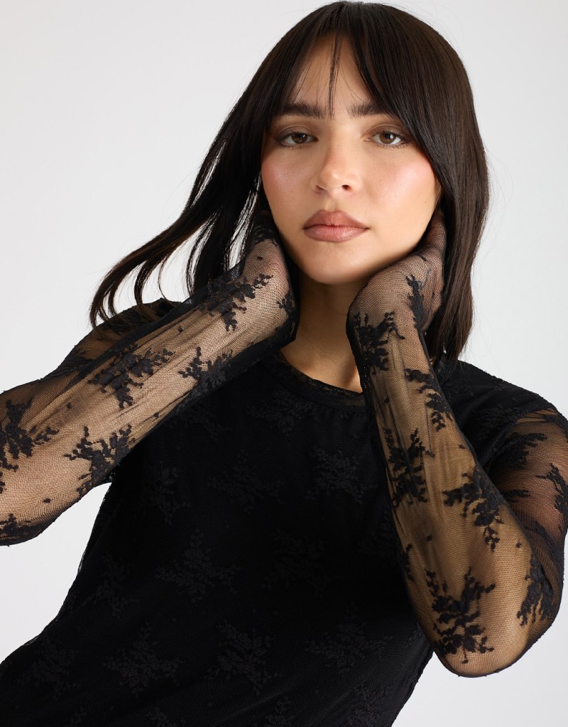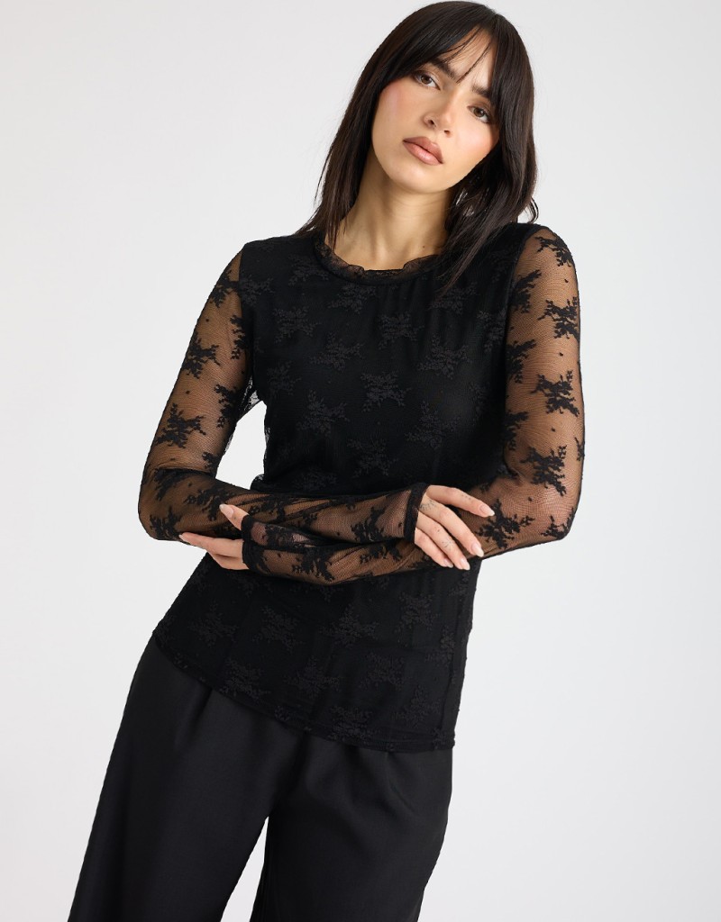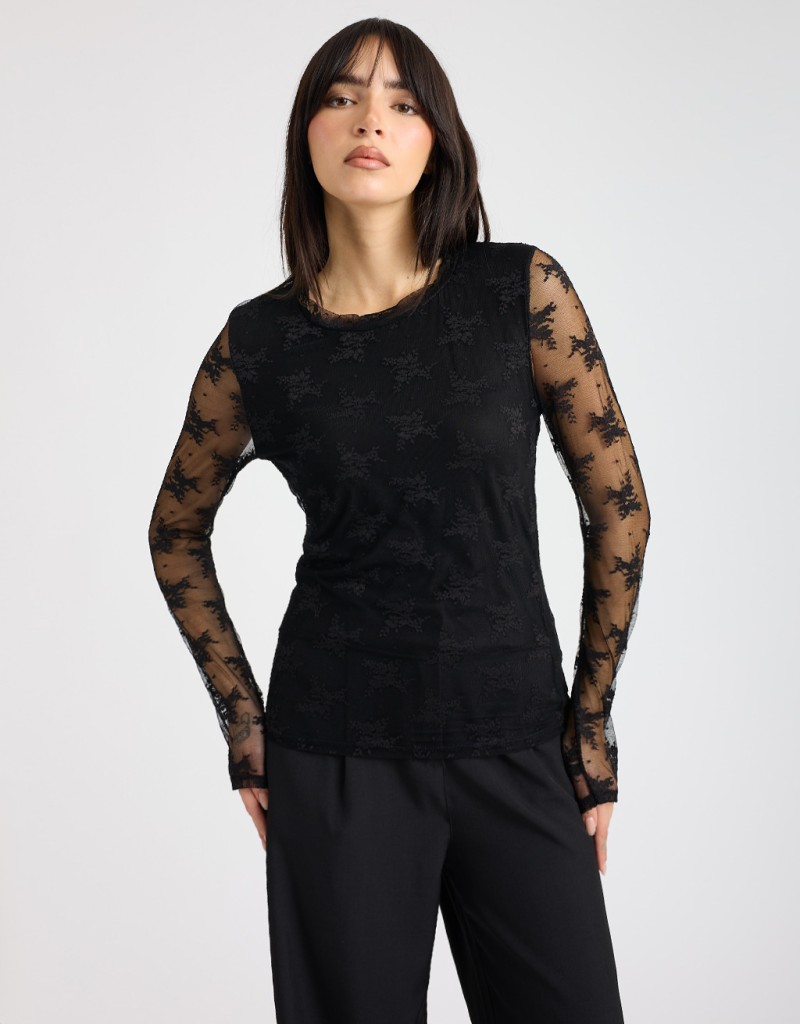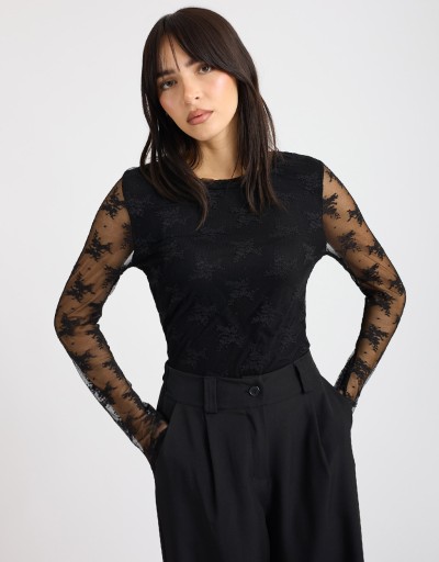 Maglietta basica in pizzo ricamato con fodera interna in morbida viscosa, che garantisce comfort e leggerezza. Il modello aderente valorizza la silhouette senza rinunciare a un tocco femminile e sofisticato. Perfetta per look primaverili o serate casual-chic, da abbinare facilmente a diversi outfit.