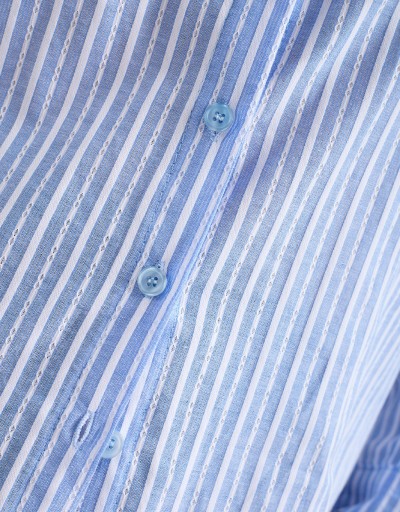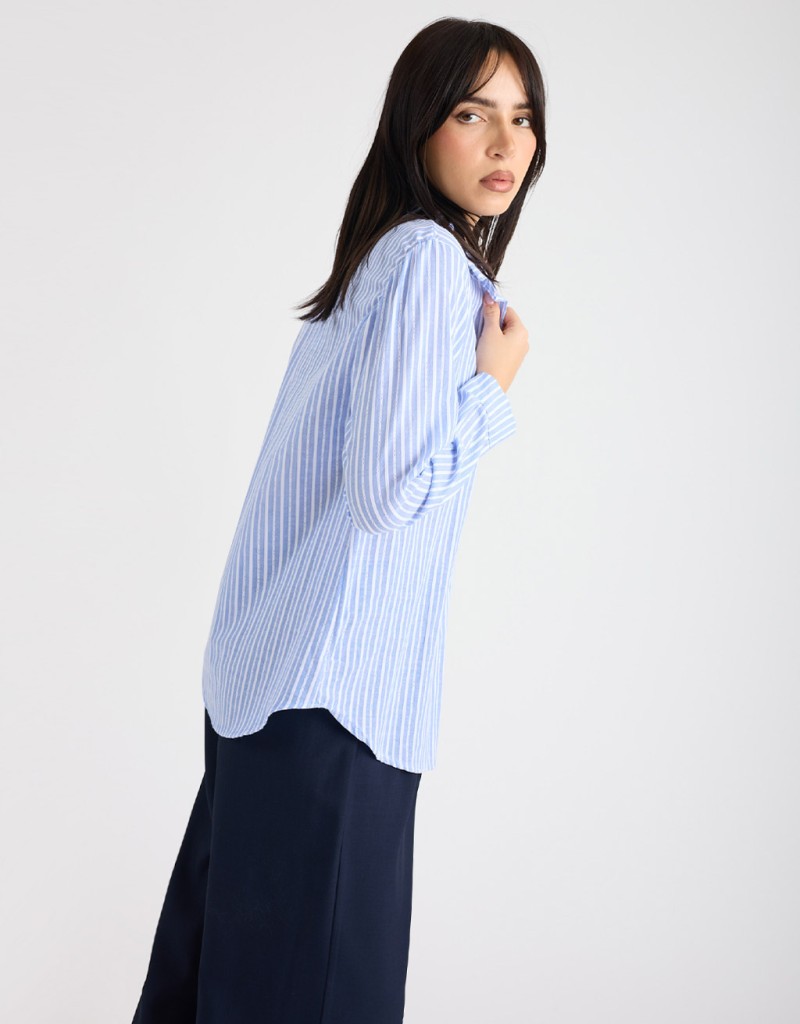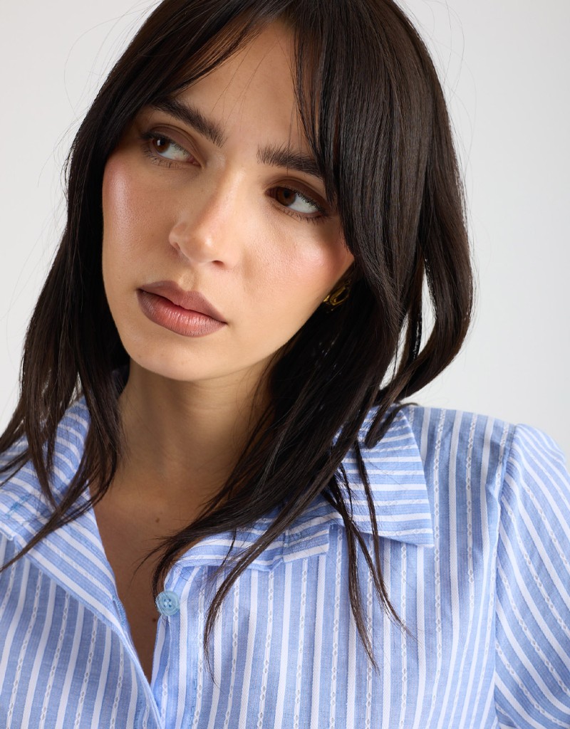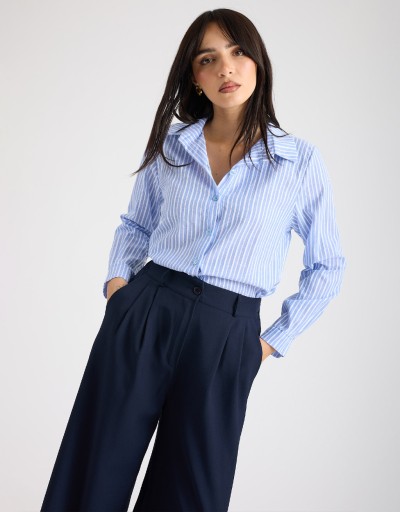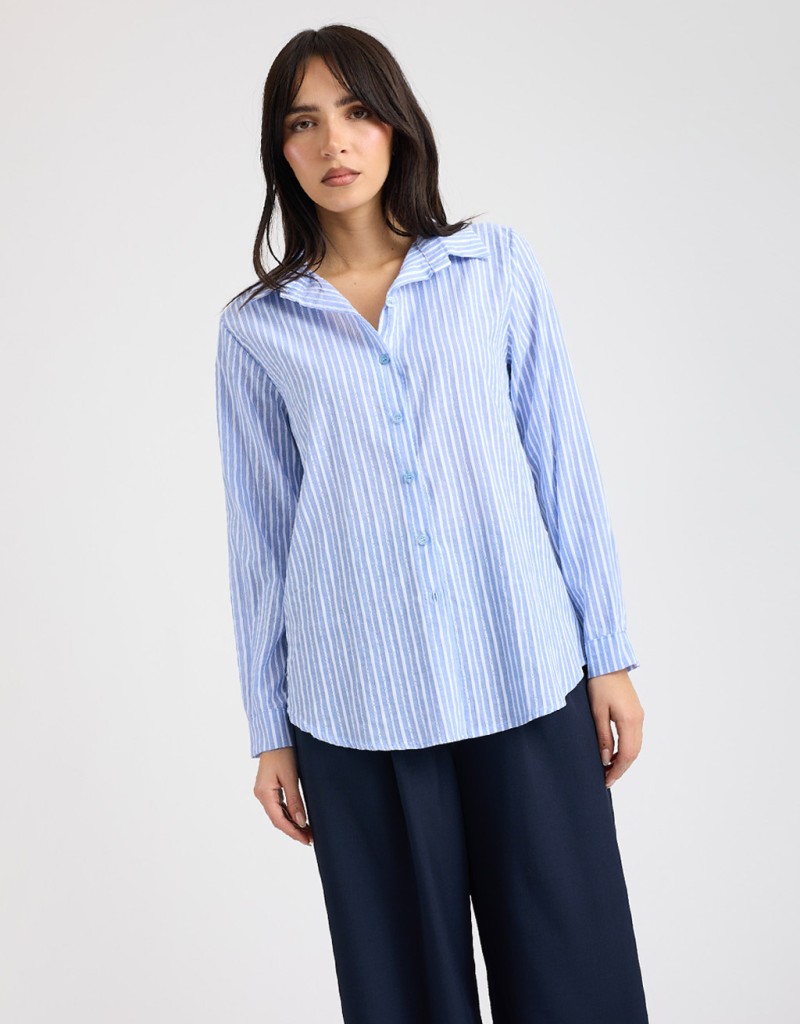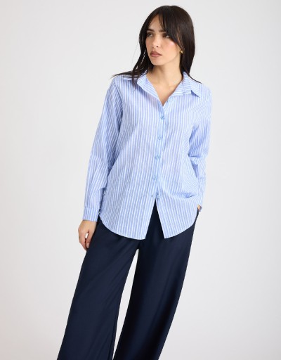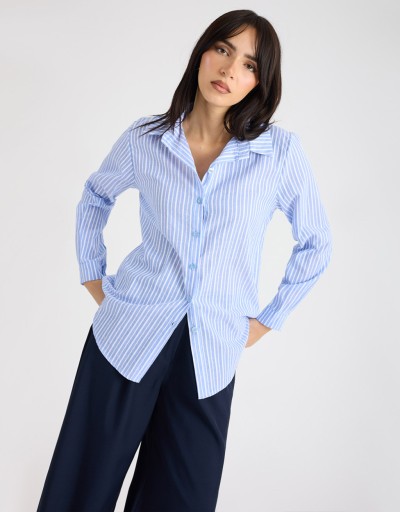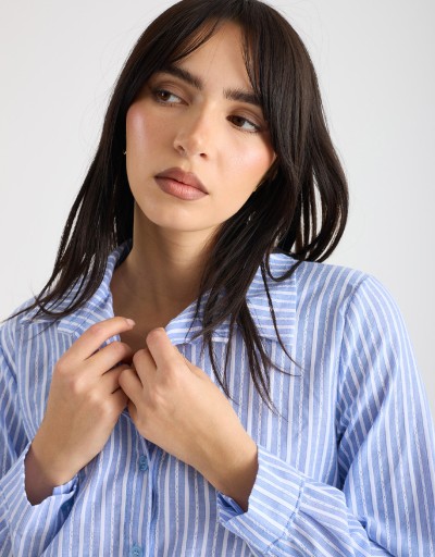 Camicia in morbido e leggero cotone, con fantasia a righe e delicati ricami che le donano un tocco femminile e raffinato. Il collo a revers e la chiusura frontale con bottoni completano il capo, rendendolo versatile e perfetto per look casual o più curati, ideale per giornate primaverili o estive.