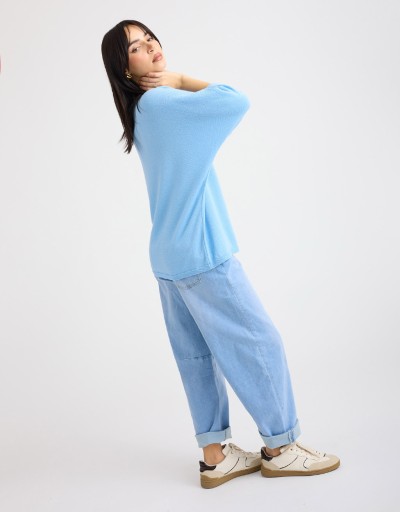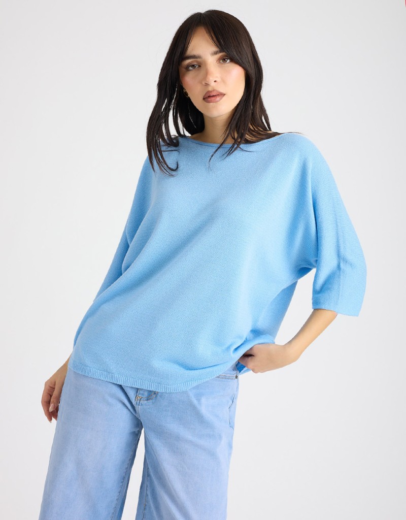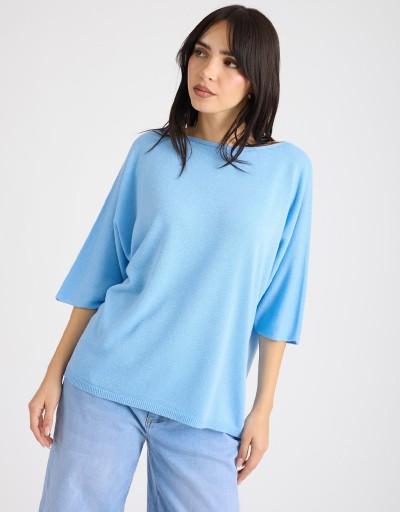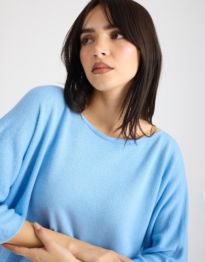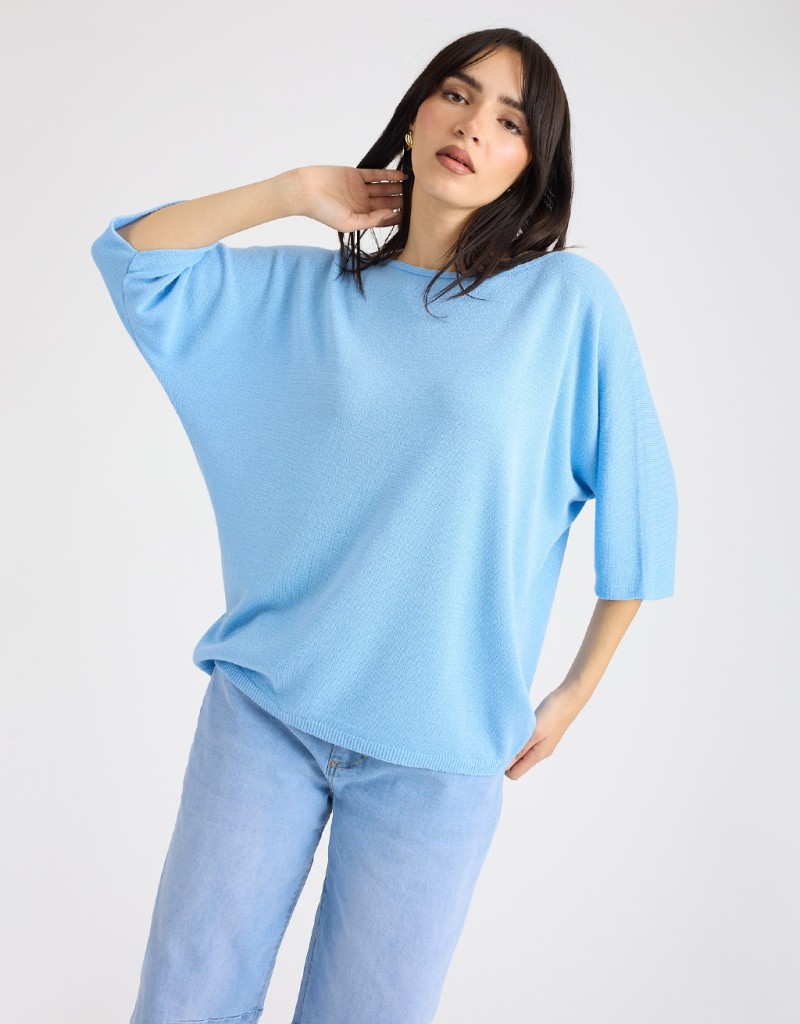 Maglioncino dal morbido tessuto in filo con lurex, che dona un delicato effetto luminoso. La scollatura a giro e le maniche 3/4 completano il capo, mentre la vestibilità over assicura comfort e stile rilassato. Perfetto per look primaverili o serate casual-chic, da abbinare facilmente a diversi outfit.