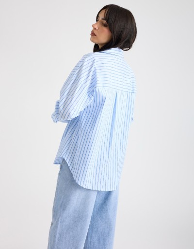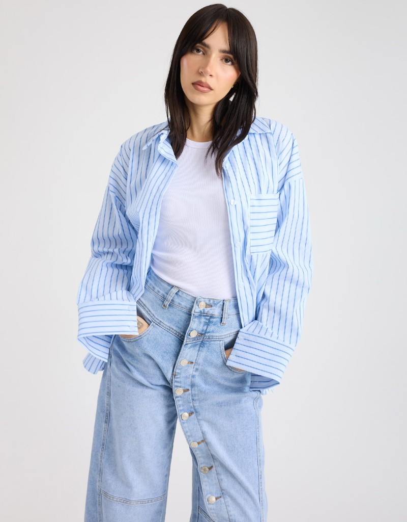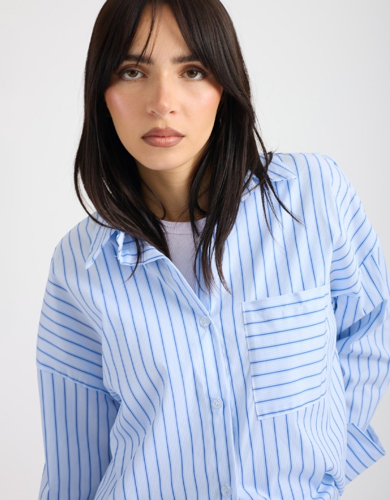Camicia in misto cotone leggero e fresco, con fantasia a righe e taglio morbido che regala comfort tutto il giorno. Il collo a revers e la chiusura frontale con bottoni assicurano uno stile curato, mentre la tasca applicata sul davanti aggiunge un dettaglio pratico e moderno. Perfetta per look quotidiani primaverili, dal mood casual ma ricercato.