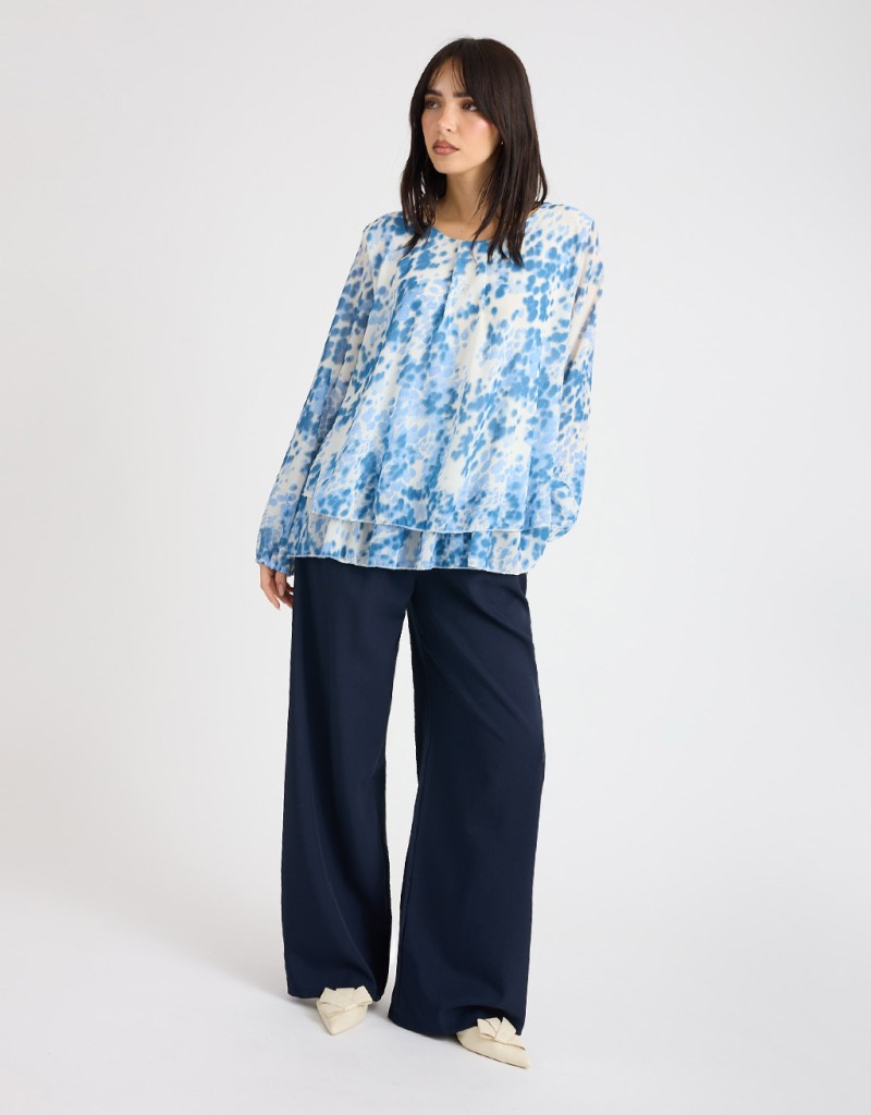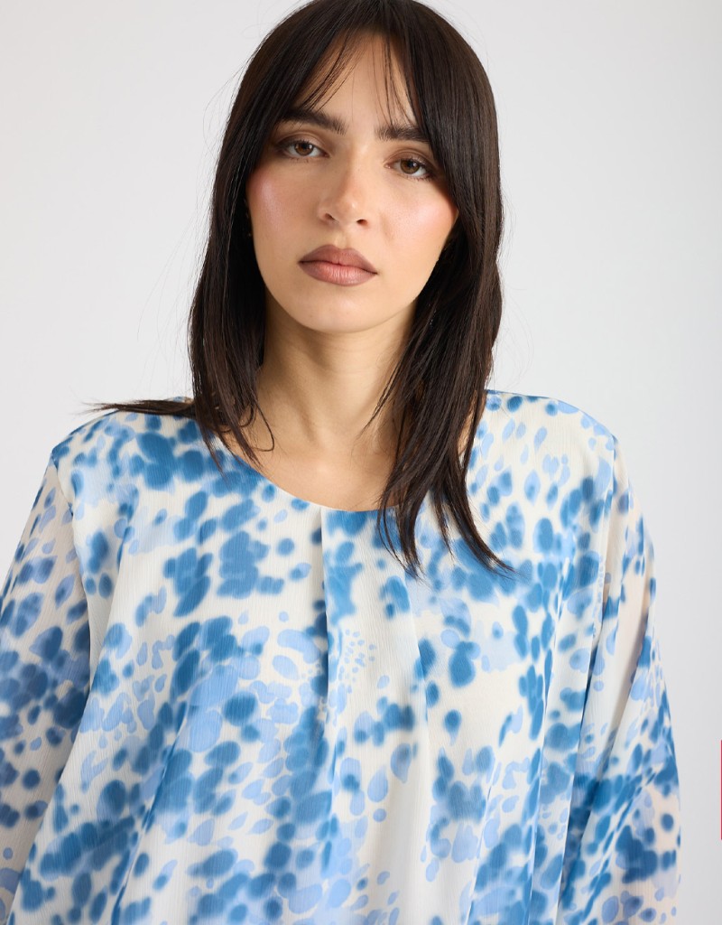 Leggera e versatile, questa camicetta in georgette fantasia presenta un modello over dal fascino rilassato. La scollatura a giro e il doppio strato sovrapposto, con l’interno leggermente più lungo, creano un elegante doppio fondo che nasconde le trasparenze, rendendola perfetta per le giornate primaverili ed estive.