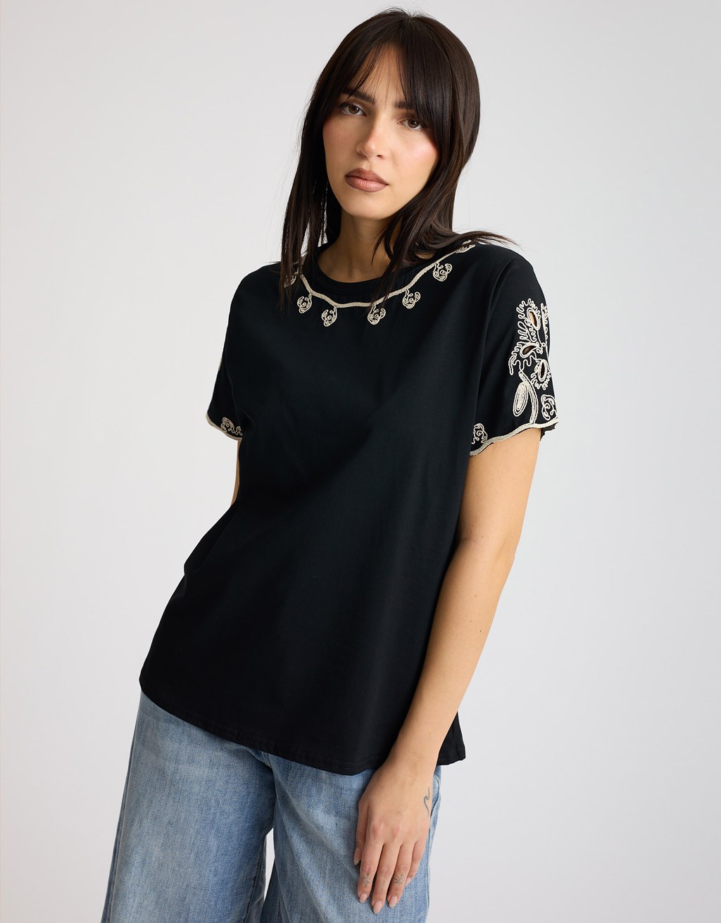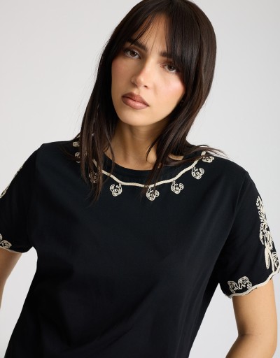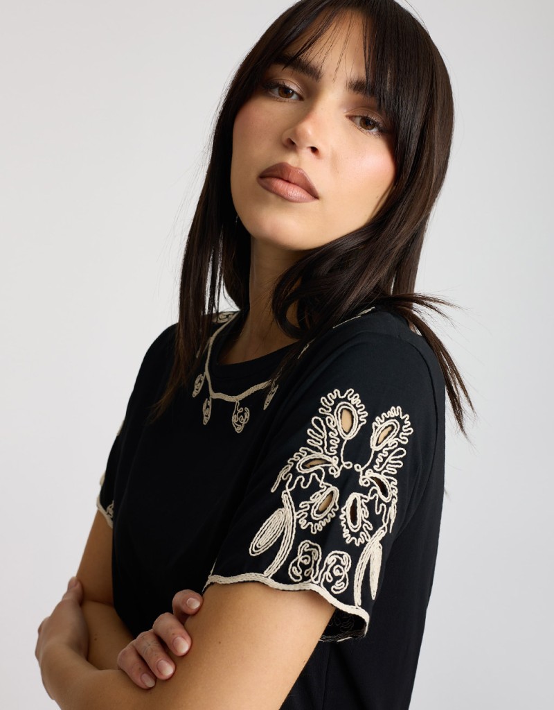 T-shirt dal mood romantico e contemporaneo, realizzata in morbido cotone elasticizzato che accompagna i movimenti con comfort. Il taglio regular, non aderente, la rende facile da indossare ogni giorno, mentre i ricami in crochet cuciti sul girocollo e spalle aggiungono un tocco artigianale e femminile che illumina anche i look più semplici.