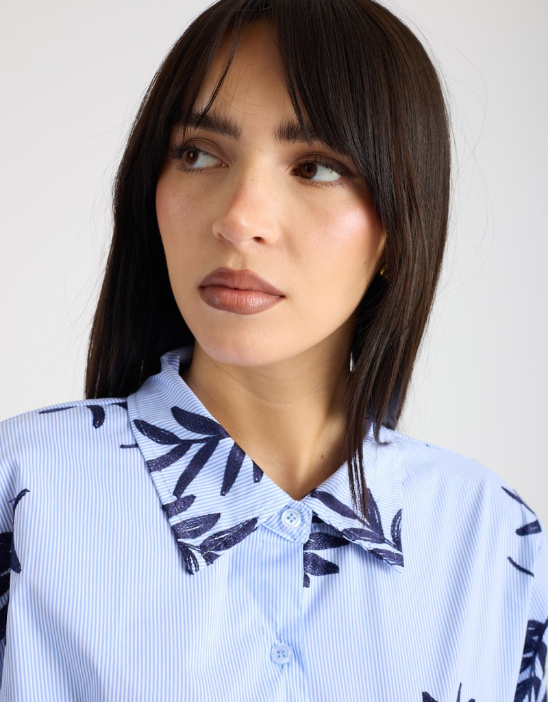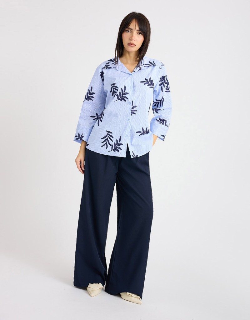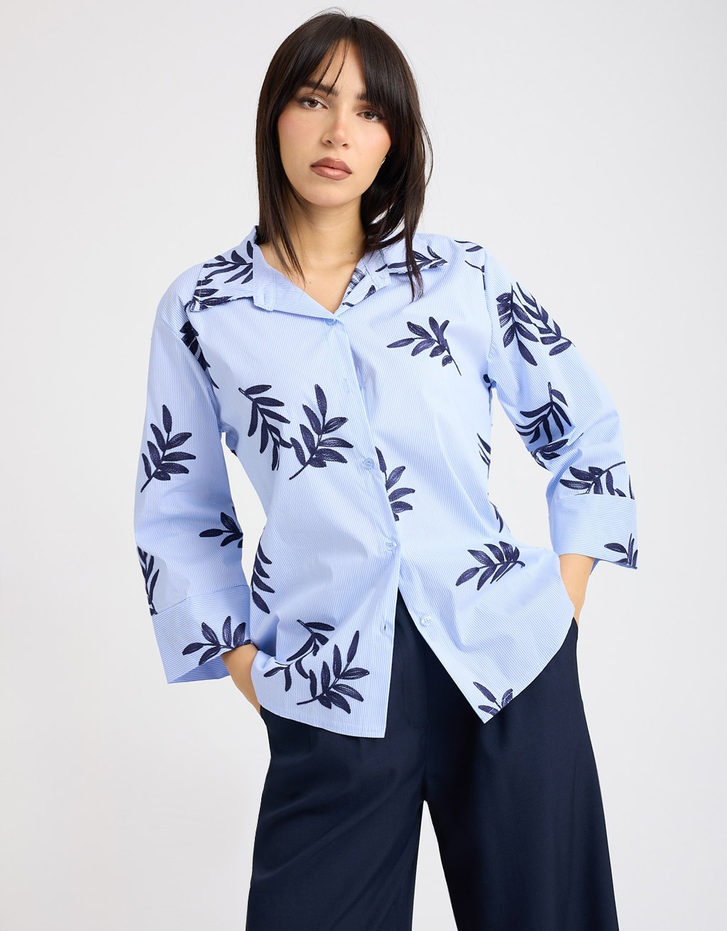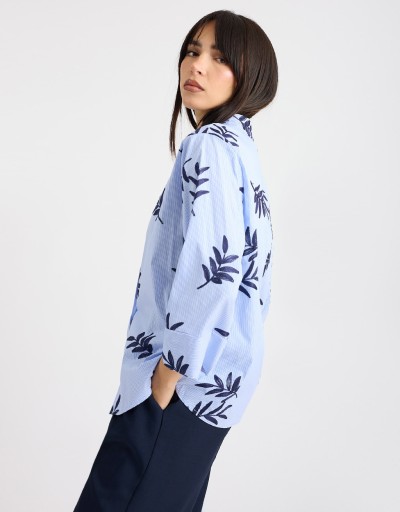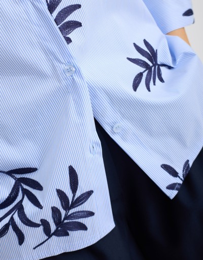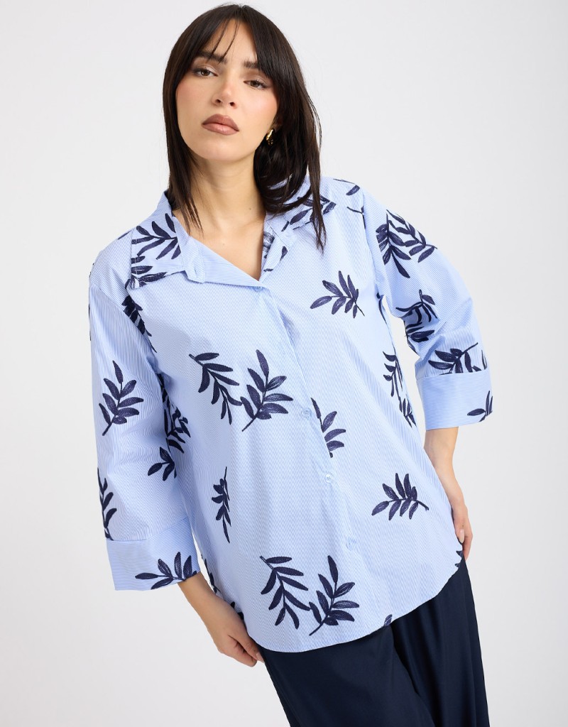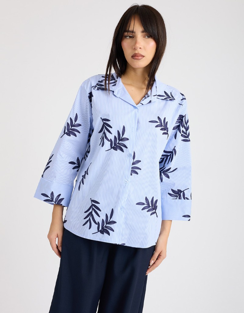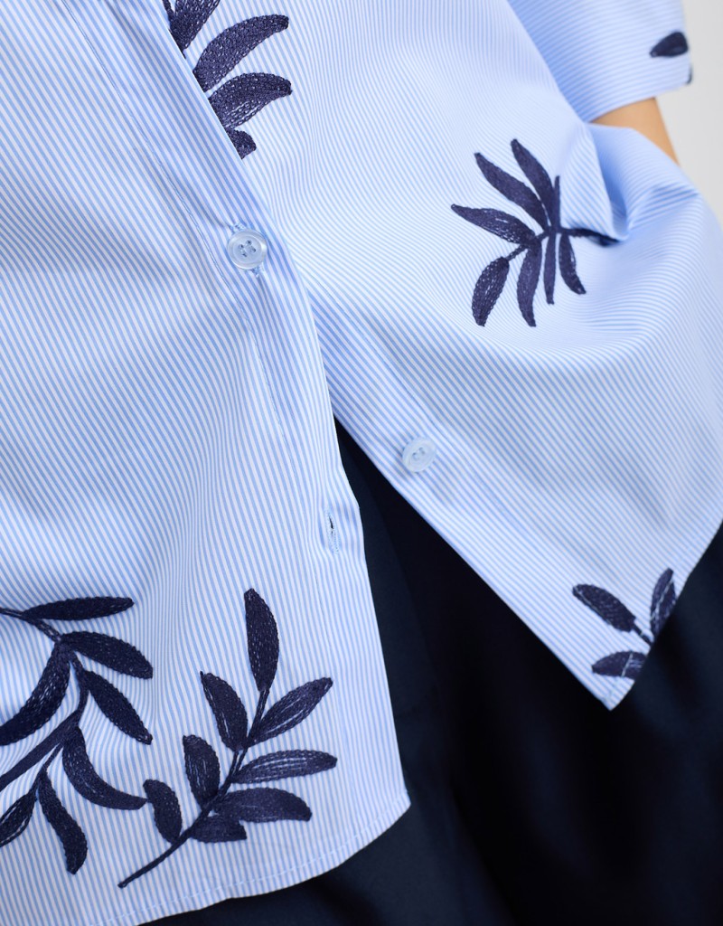 Leggera e raffinata, questa camicia in misto cotone a righe unisce comfort e stile primaverile. Il collo a revers e la chiusura frontale con bottoni creano una linea classica, mentre i ricami a contrasto aggiungono un tocco femminile. Il taglio morbido e le maniche 3/4 larghe garantiscono comodità e movimento.
