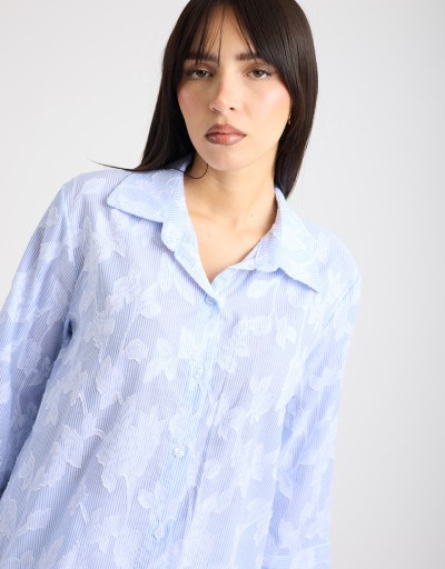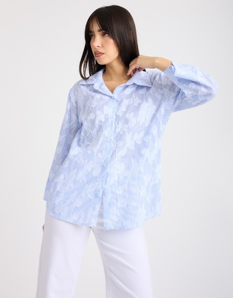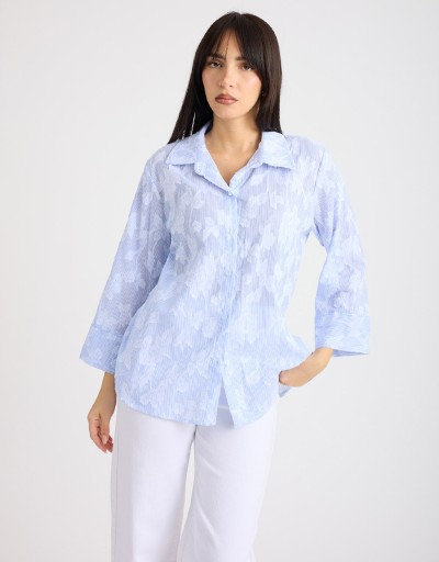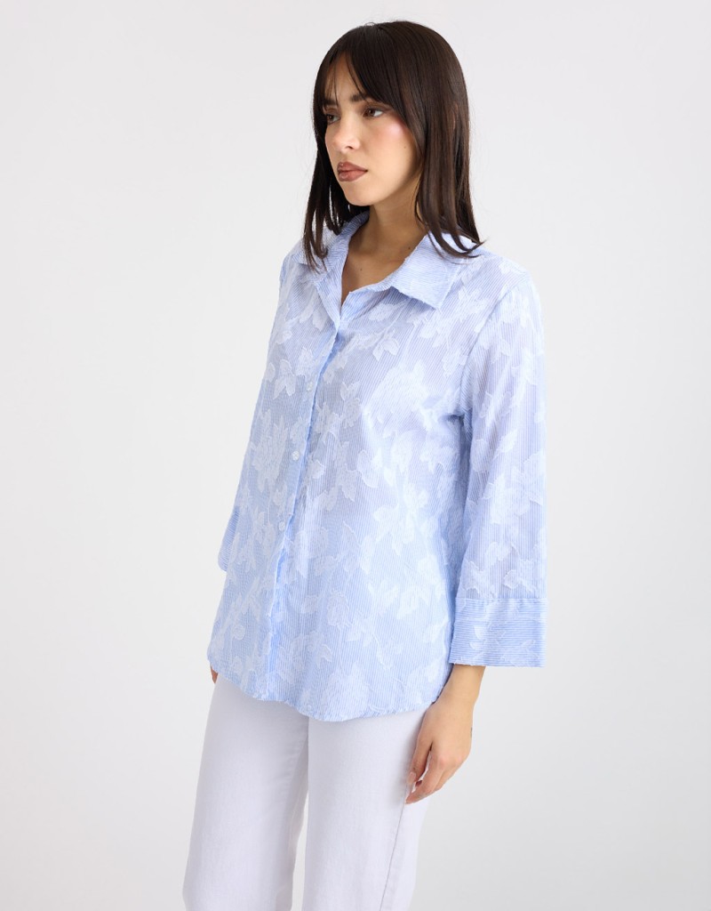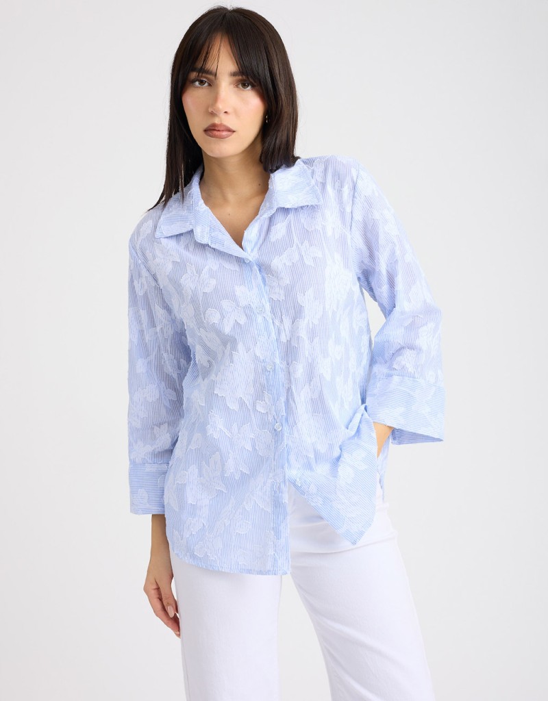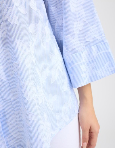 Leggera e raffinata, questa camicia in cotone a righe è perfetta per i look primaverili. Il collo a revers e la chiusura con bottoni definiscono una linea classica, mentre i ricami aggiungono un dettaglio femminile. Il taglio morbido e le maniche larghe 3/4 garantiscono comfort e libertà di movimento.