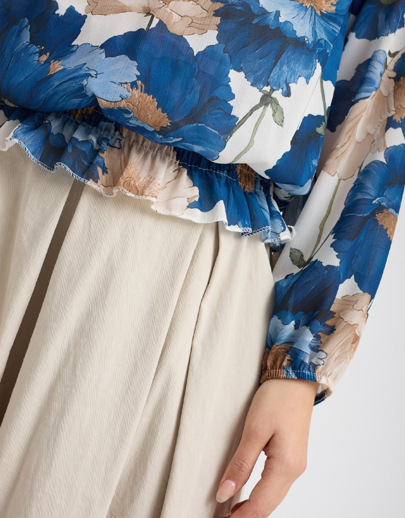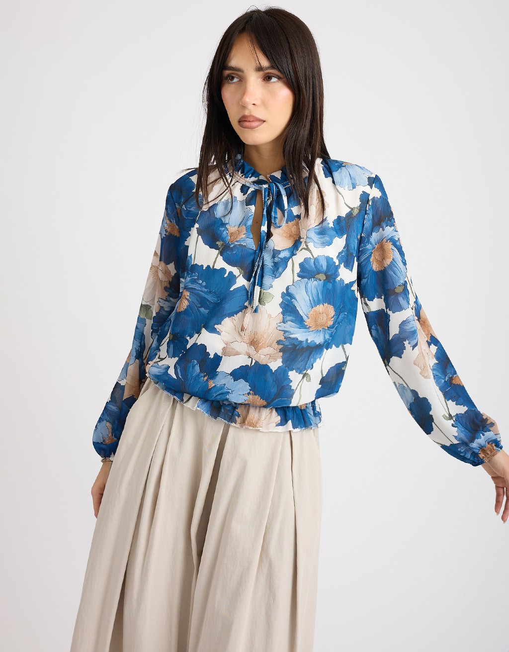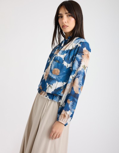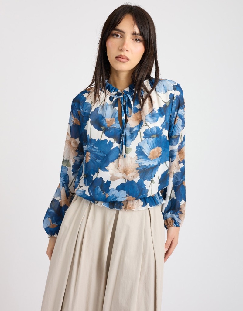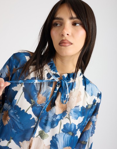 Camicetta romantica e sofisticata in georgette fantasia, dal taglio morbido e leggero. Il collo con rouches e il laccio sul collo che crea una delicata scollatura a goccia donano femminilità, mentre l’elastico a punto smock sul fondo definisce un effetto leggermente sborsato, valorizzando ogni movimento con naturalezza. Fodera interna per massimo comfort.