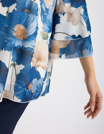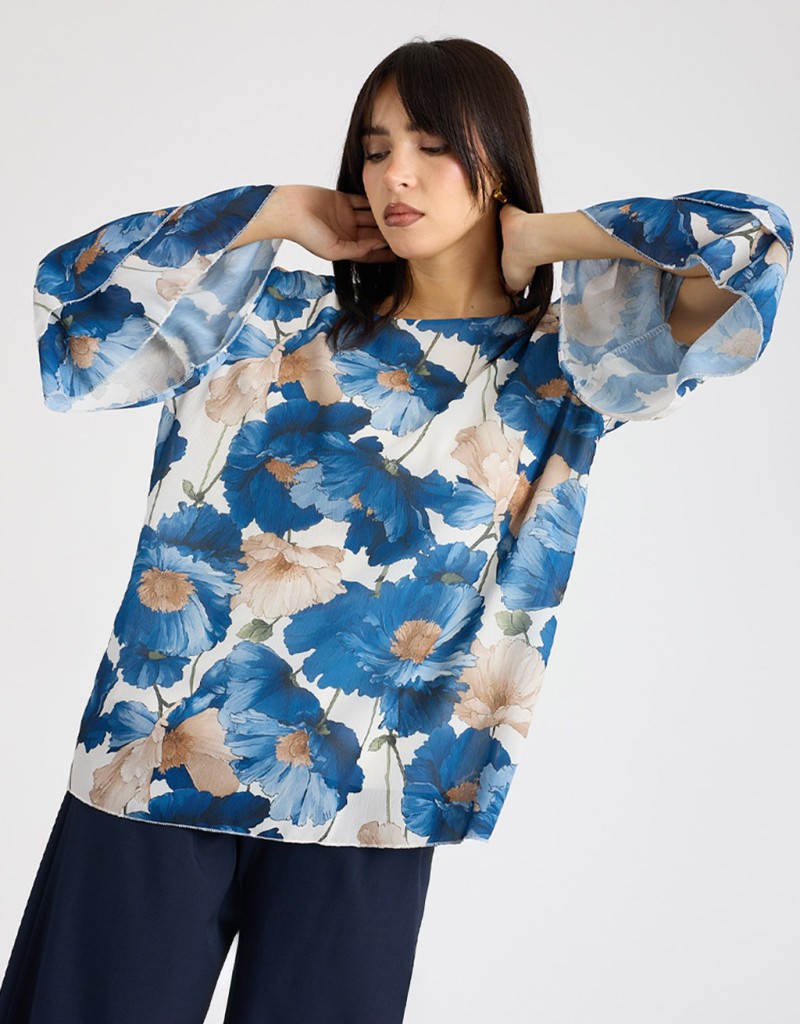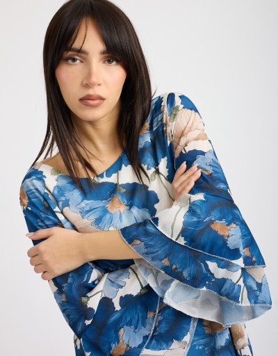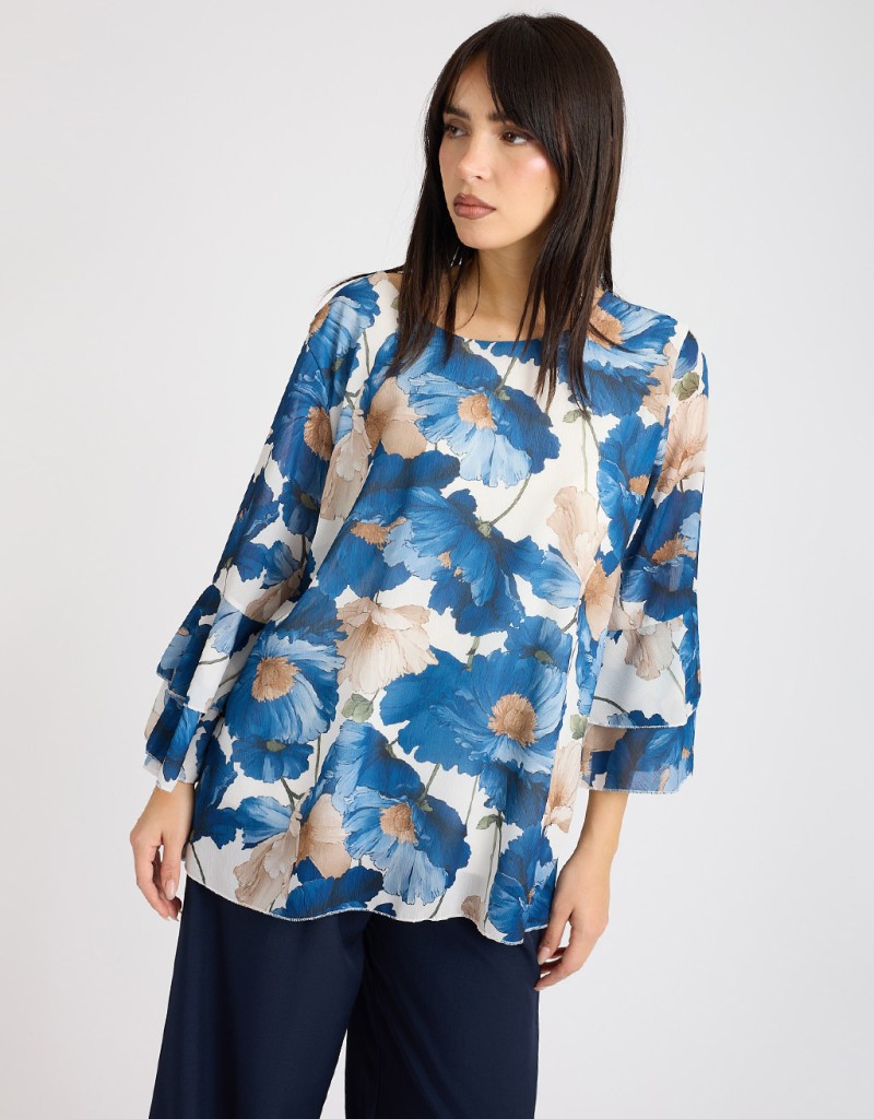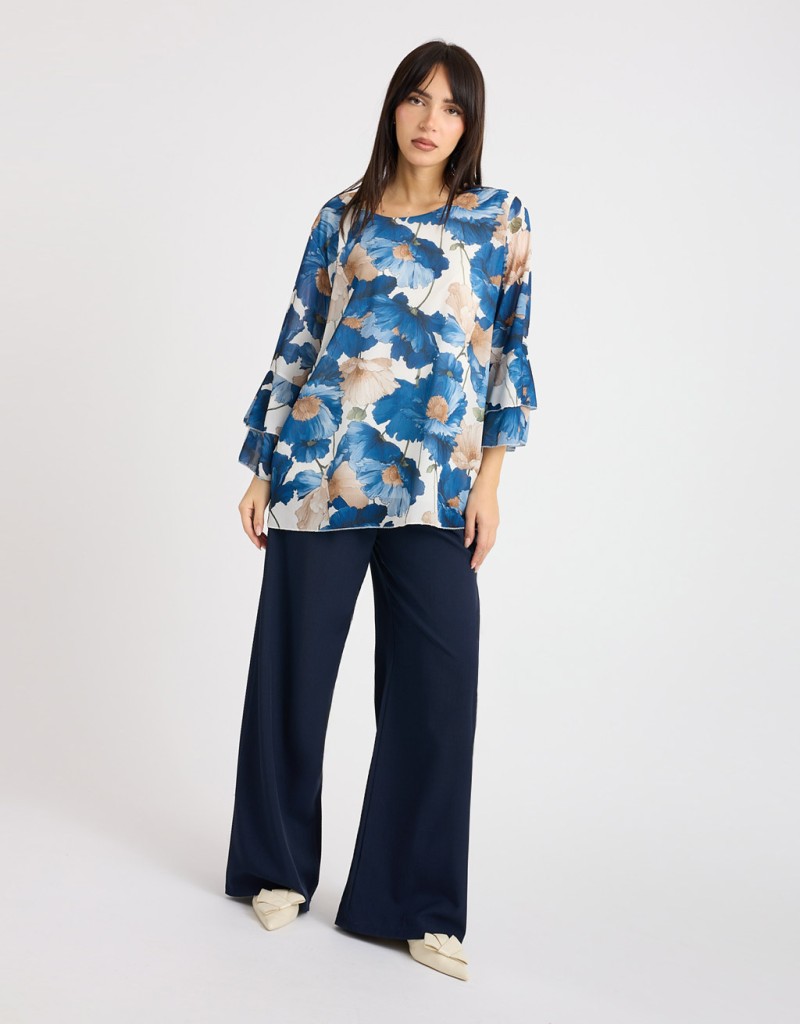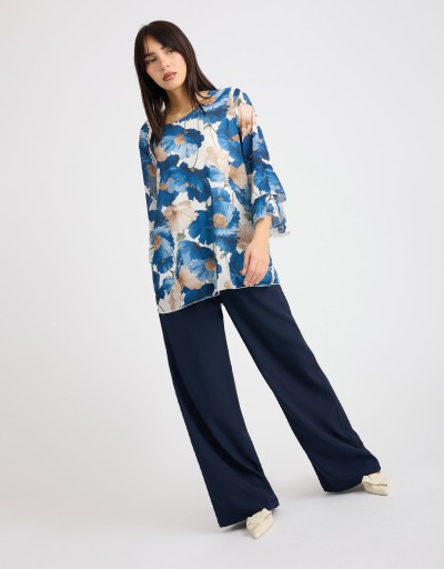 Leggera e versatile, questa camicetta in georgette fantasia dal taglio morbido è perfetta per i look primaverili ed estivi. La scollatura a giro e le ampie maniche a campana donano movimento e femminilità, mentre la fodera cucita all’interno garantisce comfort e copertura.