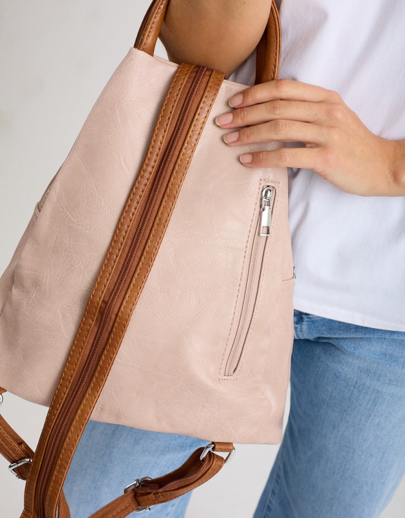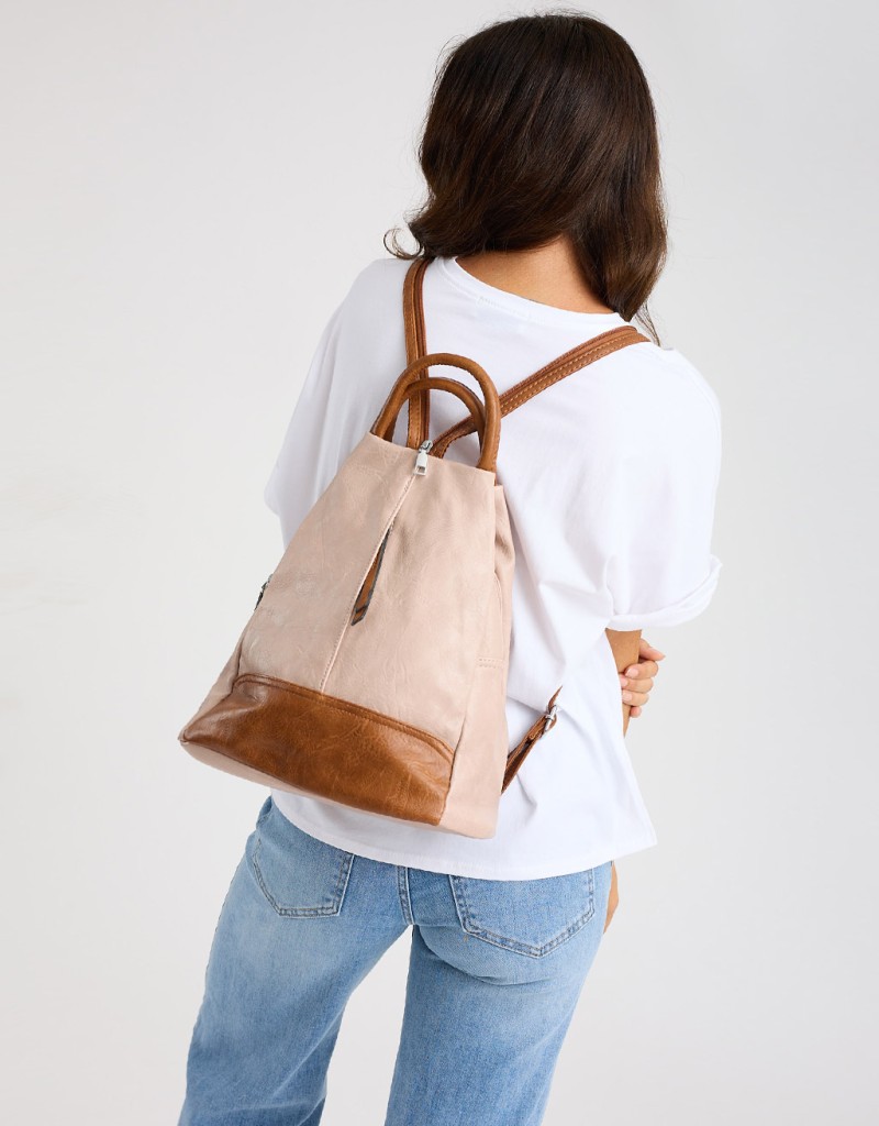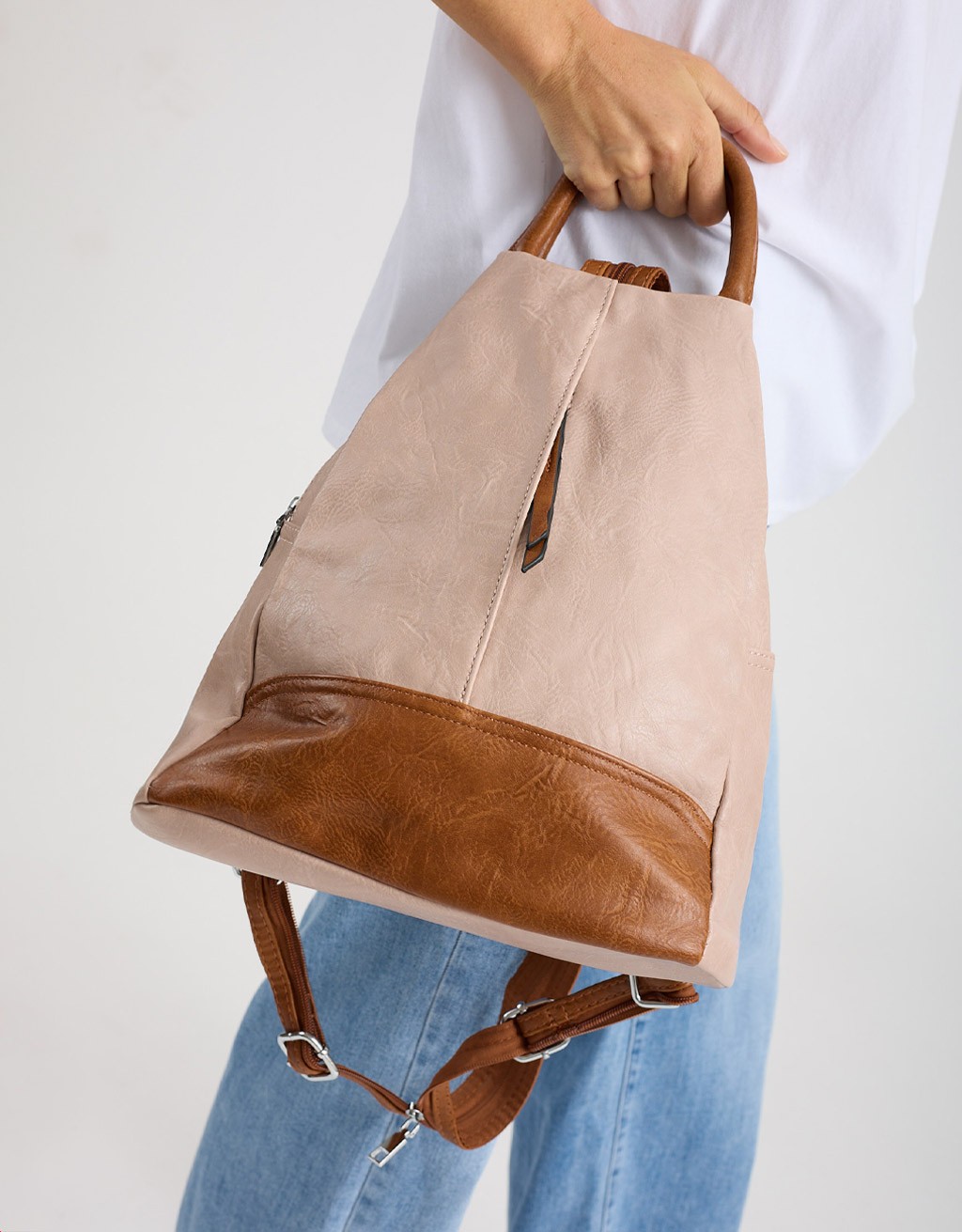 zaino dal design allungato e dalla caratteristica forma triangolare, impreziosito da inserti a contrasto d'ispirazione vintage. Le bretelle dello zaino si possono unire grazie una zip e diventare una pratica tracolla, rendendolo estremamente verstile.