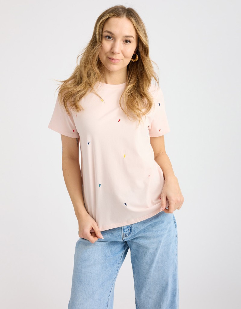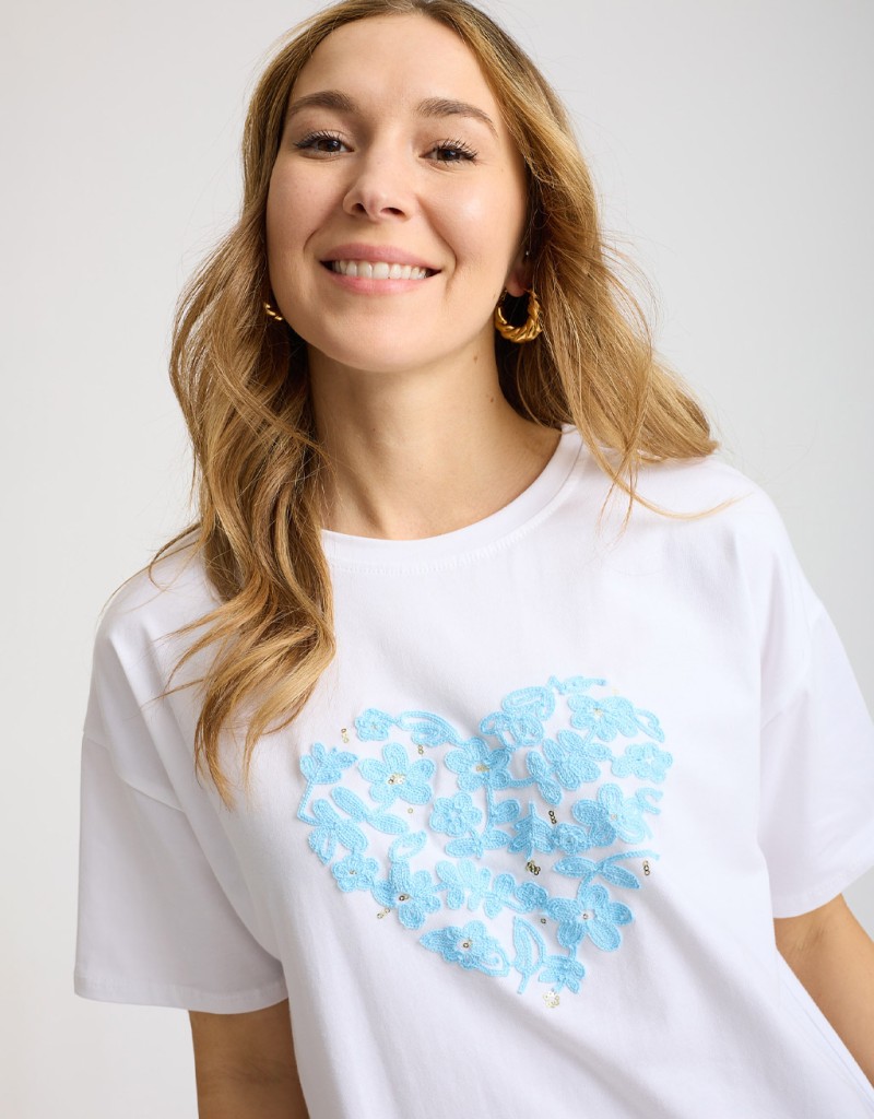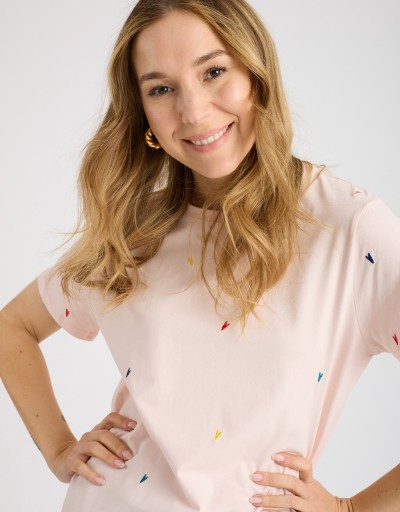 Maglietta basica in cotone elasticizzato, fresca e confortevole, arricchita da piccoli cuoricini multicolor ricamati che donano un tocco giocoso e femminile. Linea semplice e vestibilità morbida, perfetta per creare outfit quotidiani pratici ma sempre con stile, ideale da indossare in primavera o nelle giornate miti.