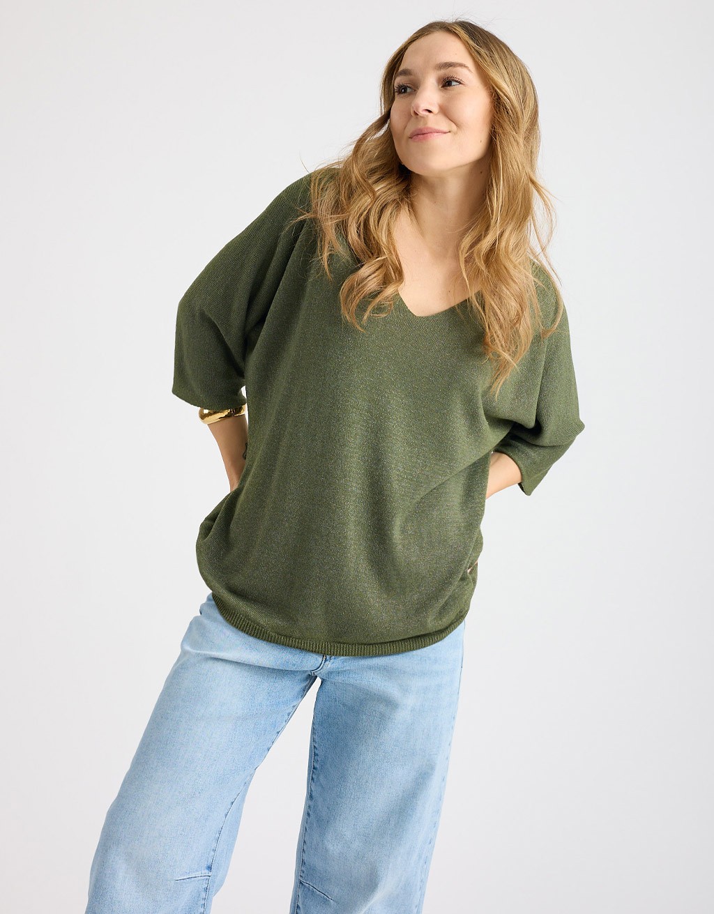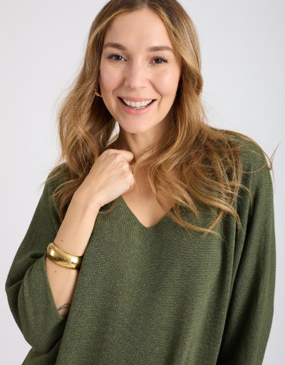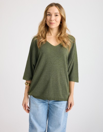 Maglioncino over in morbido e leggero tessuto tinta unita con fili lurex, che donano un delicato effetto brillante. L’ampia scollatura a V e le maniche a 3/4 rendono il capo femminile e versatile, perfetto da indossare sia da solo che sovrapposto a camicie o top per look moderni e luminosi.