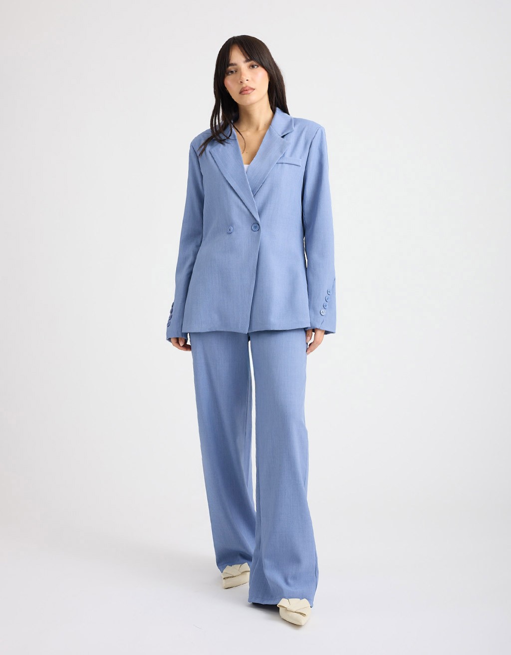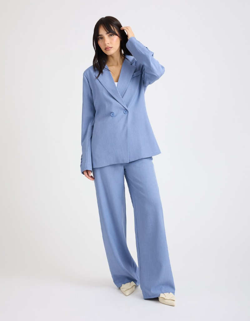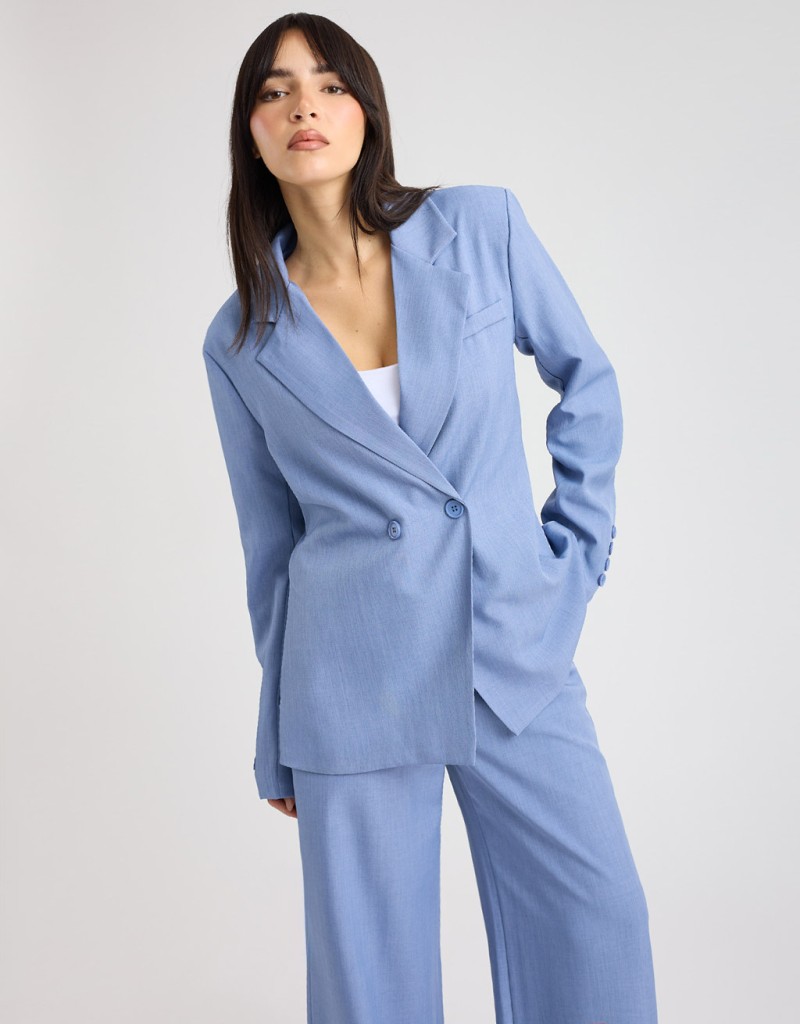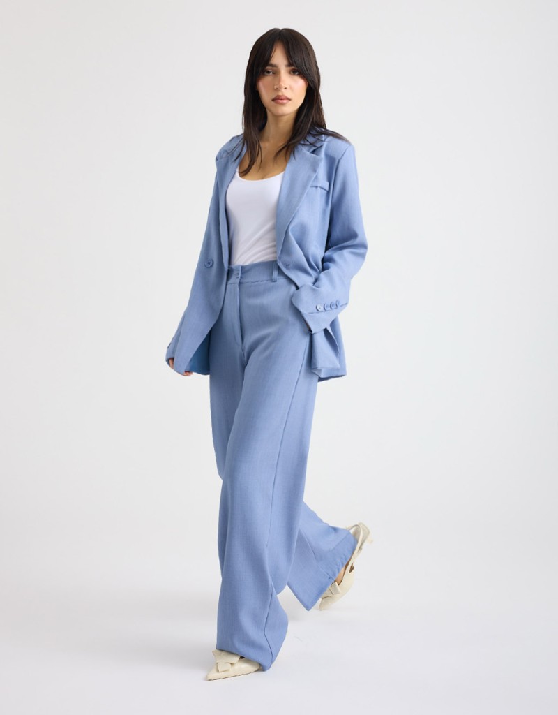 Completo in tessuto fresco e leggero. Il blazer over con ampio collo a revers e chiusura a doppio petto è arricchito da spalline e fodera interna. Taglio diagonale e bottoni ai polsi per un dettaglio sofisticato. Il pantalone a palazzo, con elastico sul retro, chiusura frontale e tasche oblique, garantisce comfort e vestibilità perfetta.
