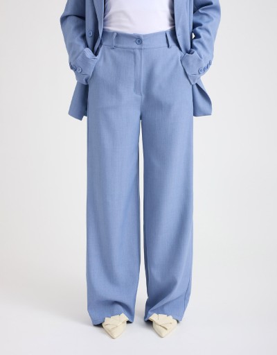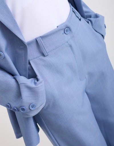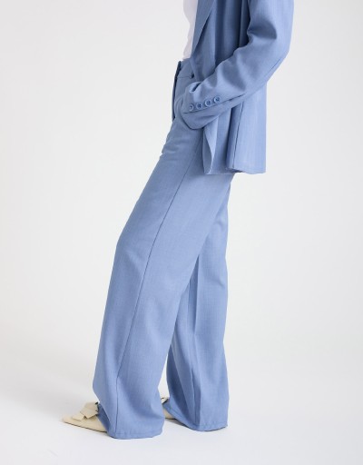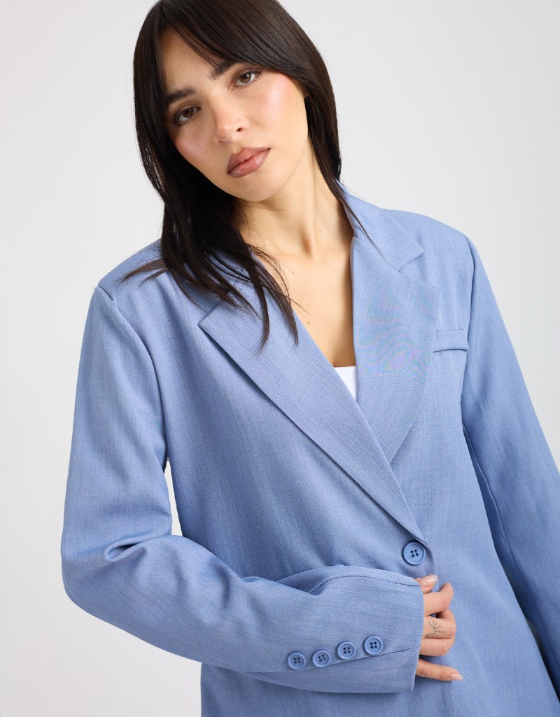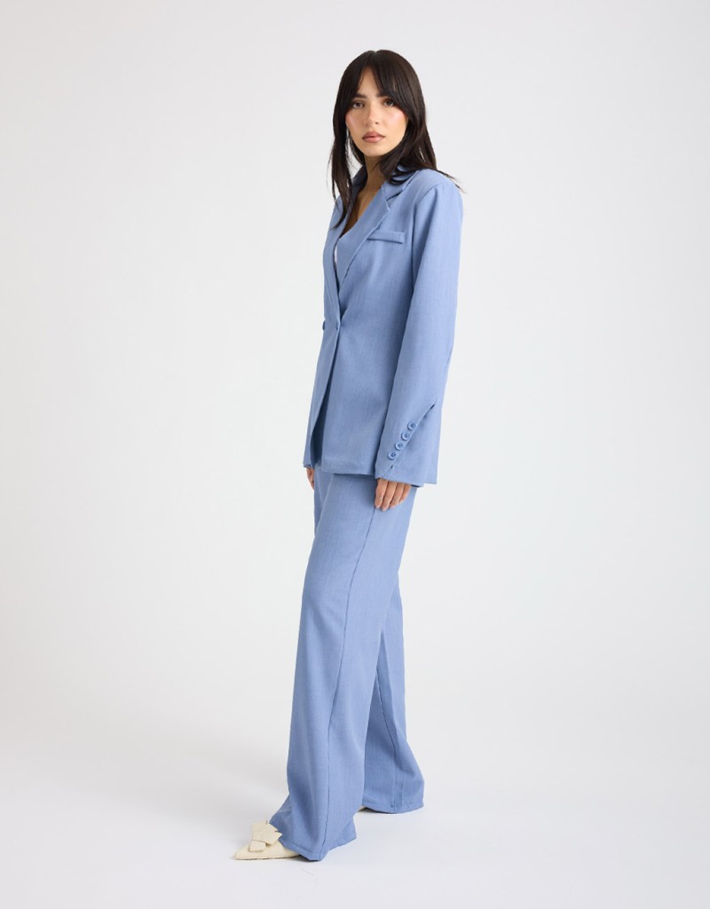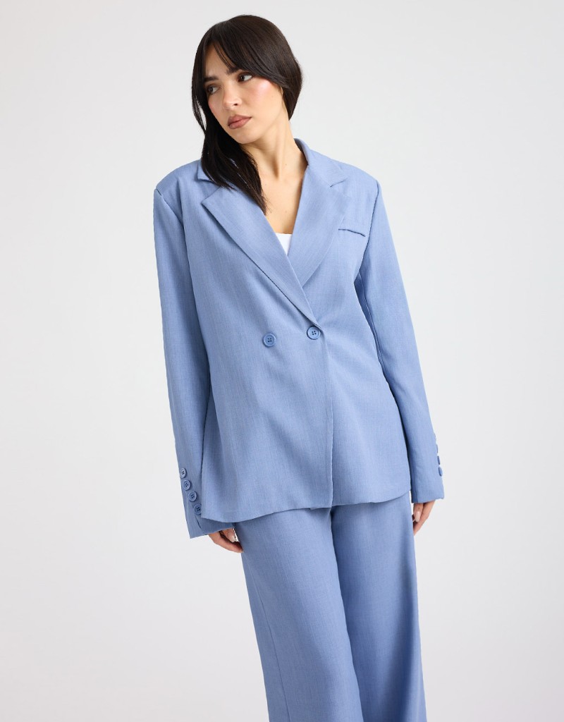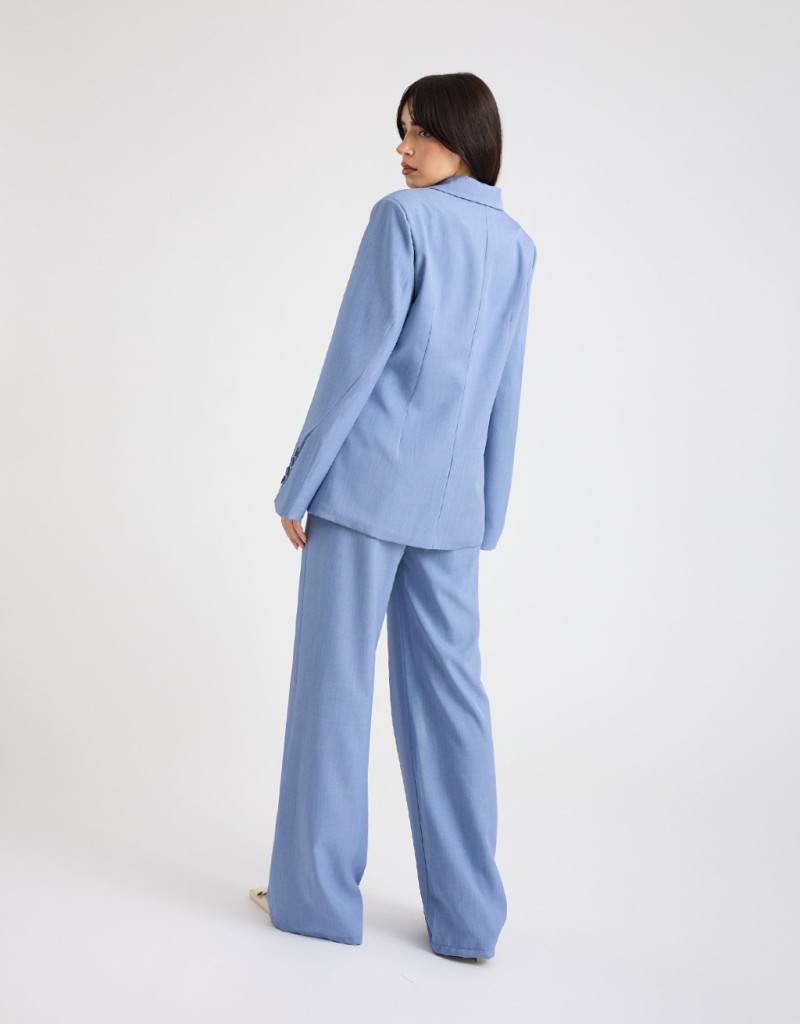 Completo in tessuto fresco e leggero. Il blazer over con ampio collo a revers e chiusura a doppio petto è arricchito da spalline e fodera interna. Taglio diagonale e bottoni ai polsi per un dettaglio sofisticato. Il pantalone a palazzo, con elastico sul retro, chiusura frontale e tasche oblique, garantisce comfort e vestibilità perfetta.