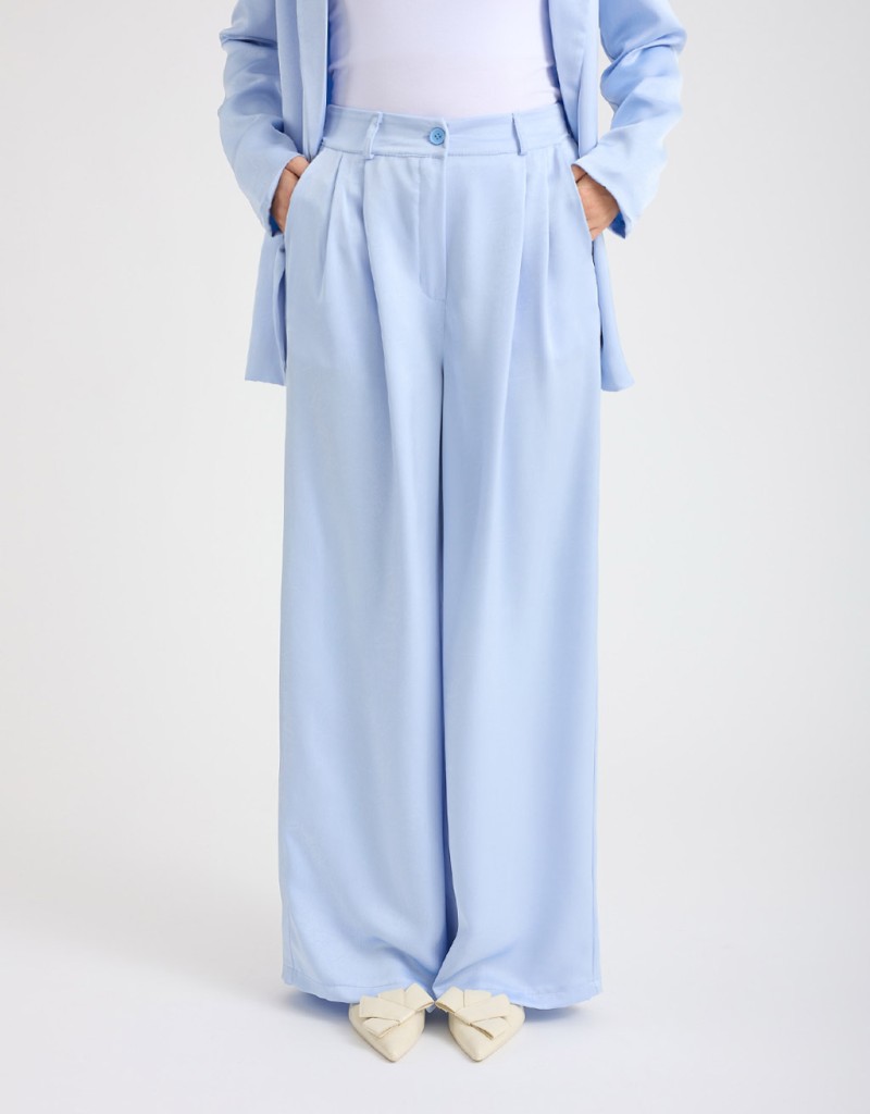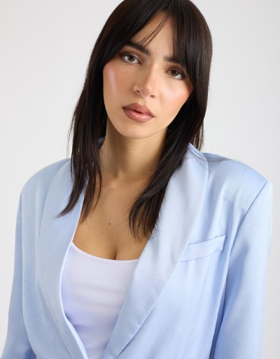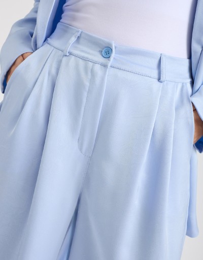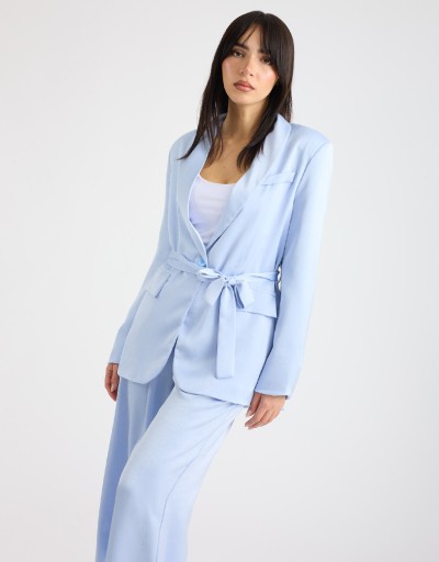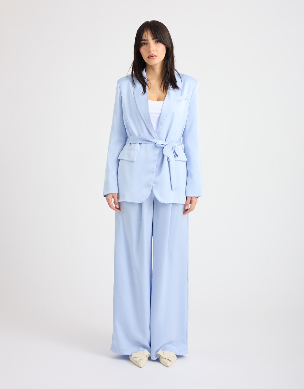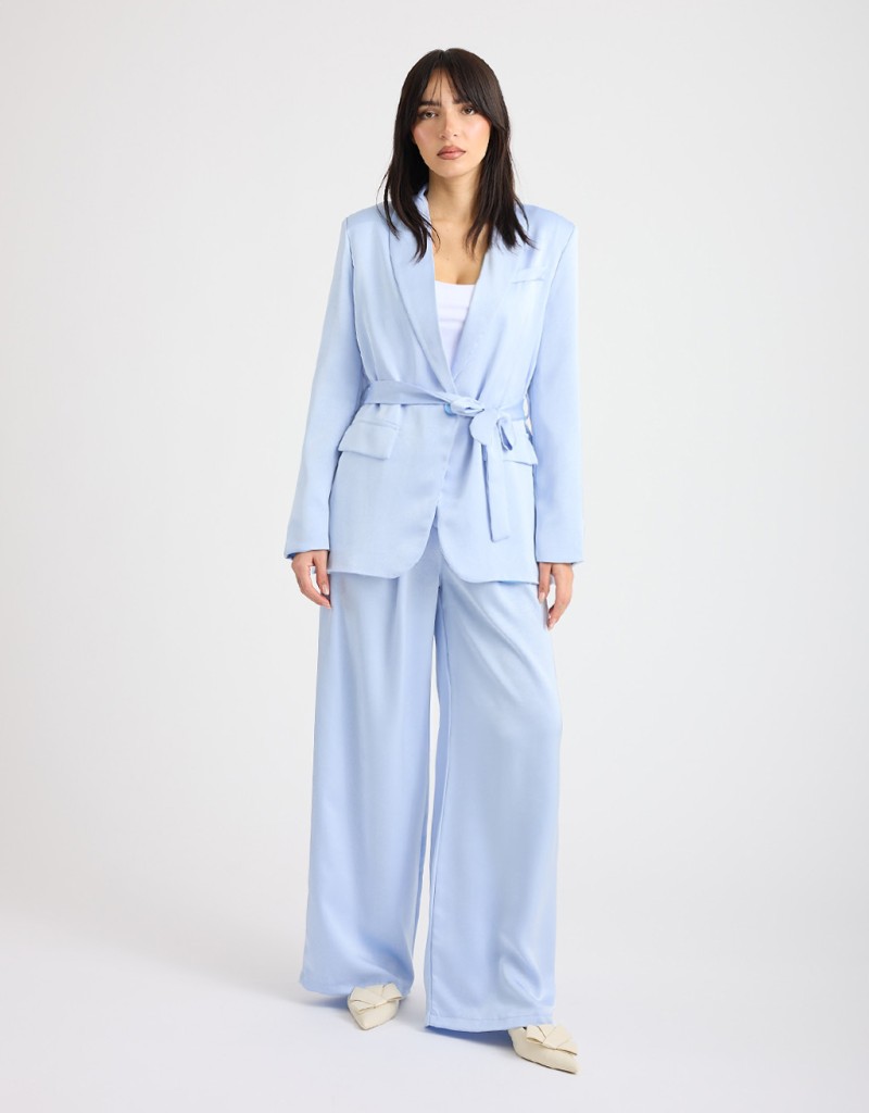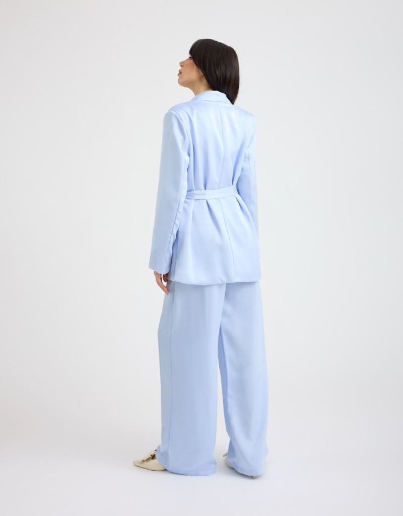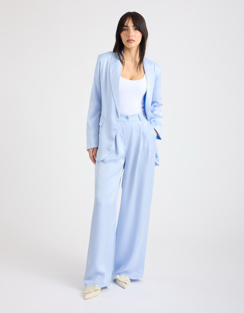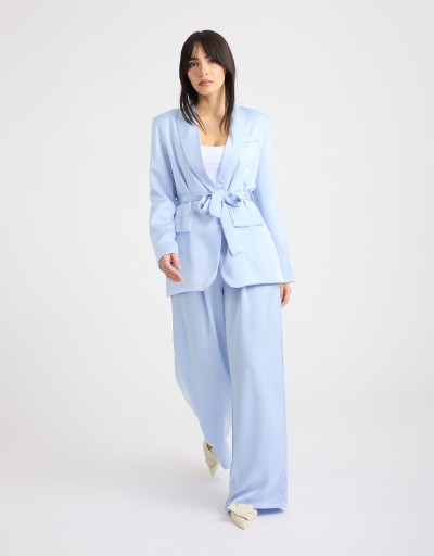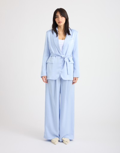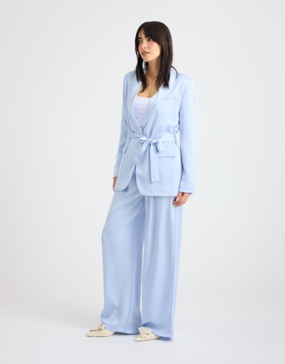 Completo in tessuto fresco e leggero dal delicato effetto lucido goffrato. Il blazer dal collo a scialle, chiusura frontale con bottone e fusciacca in vita valorizza la silhouette, mentre fodera e spalline interne assicurano struttura e comfort. Il pantalone a palazzo, con elastico posteriore, pinces frontali e tasche oblique, unisce stile e vestibilità.