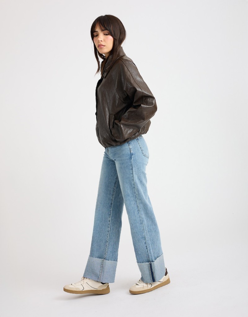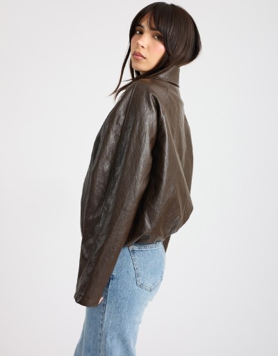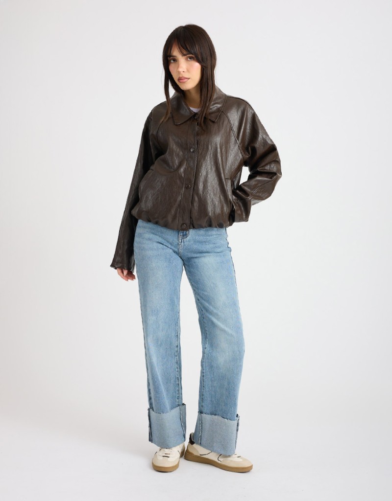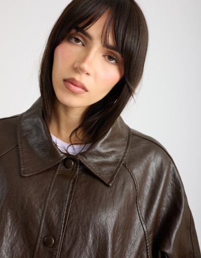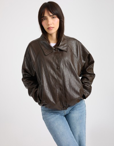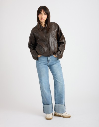 Bomber in finta pelle dal taglio moderno, con collo a revers e chiusura frontale con bottoni a pressione. Linea leggermente rimborsata grazie all’elastico sul fondo e fodera interna cucita, unisce stile e praticità per outfit primaverili ed estivi dal carattere deciso.