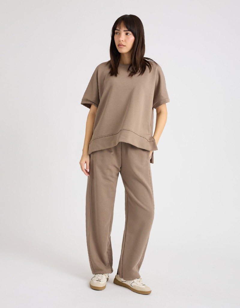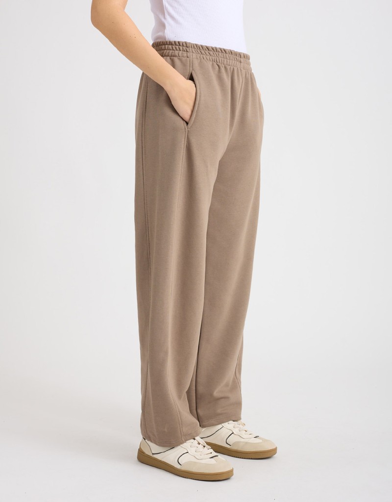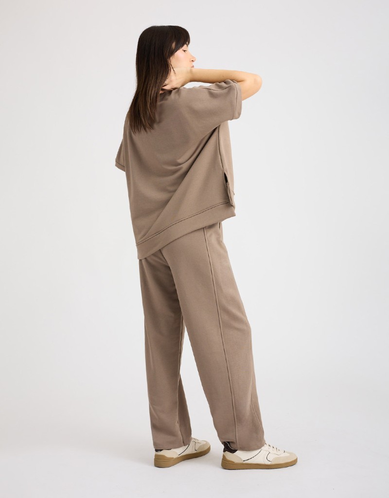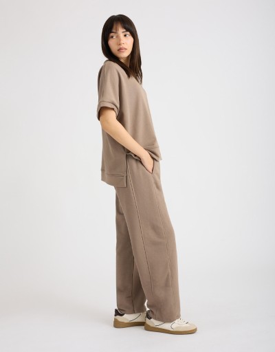 Pantalone in morbida felpa non garzata modello barrel, dal taglio comodo e moderno, con elastico in vita che ne adatta la vestibilità e tasche frontali laterali per praticità. Perfetto per outfit primaverili ed estivi casual, unisce comfort e stile in un capo versatile da giorno.