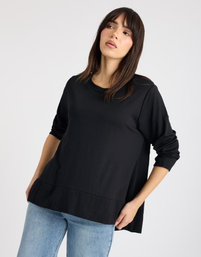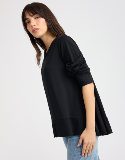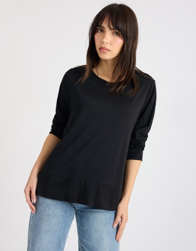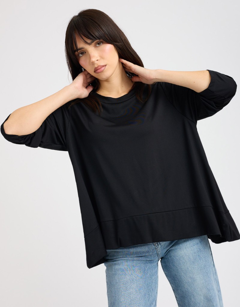Maglietta in fresco e leggero tessuto misto viscosa dal taglio over, con scollatura a giro e delicata balza sul fondo che crea movimento e femminilità. Ideale per outfit primaverili ed estivi, unisce comfort e leggerezza senza rinunciare allo stile.