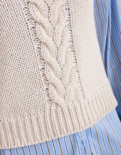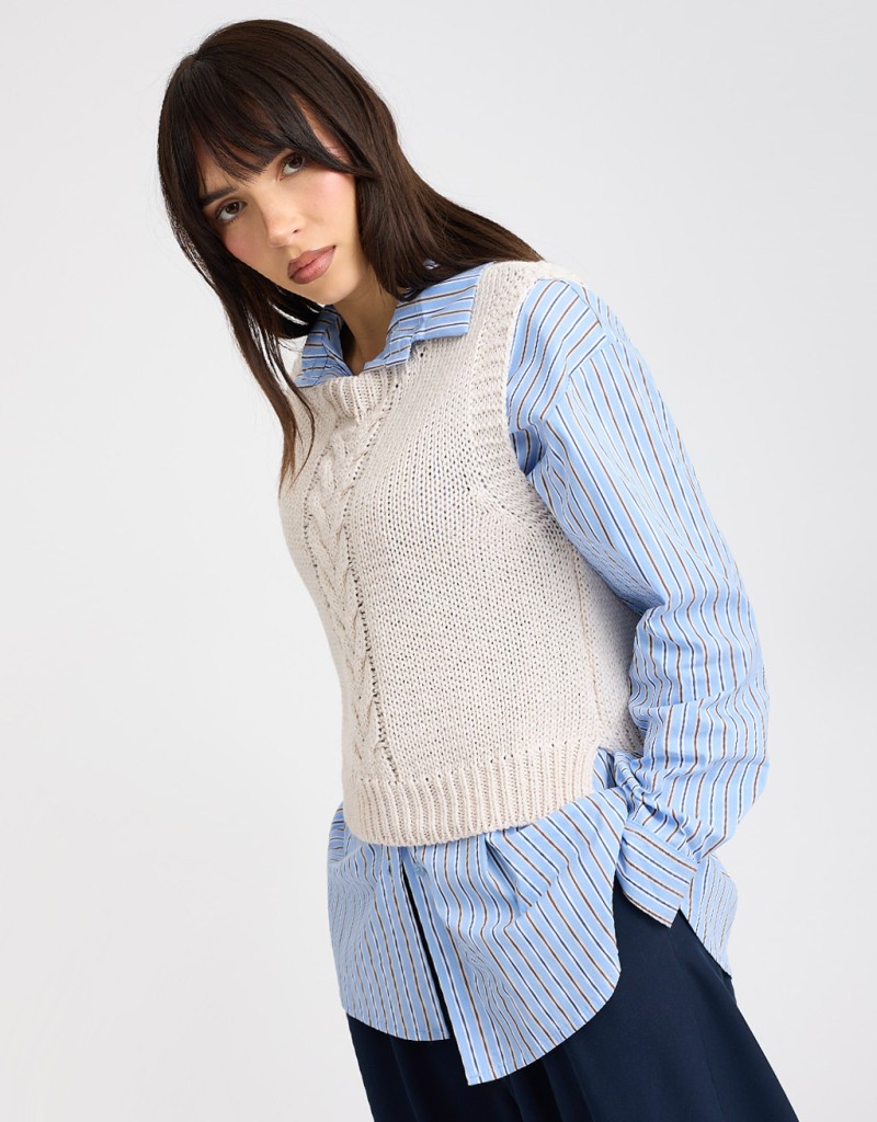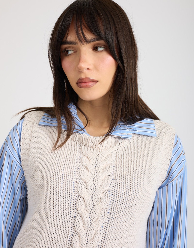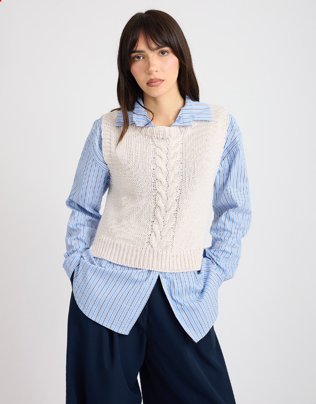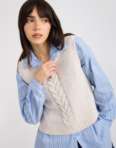 Gilet in filo leggero con scollatura a giro e raffinato dettaglio di lavorazione a treccia sulla parte frontale. Perfetto per outfit primaverili ed estivi, aggiunge un tocco di texture e originalità senza appesantire il look, rendendolo ideale da abbinare a top o camicie leggere.