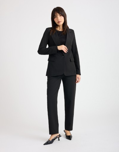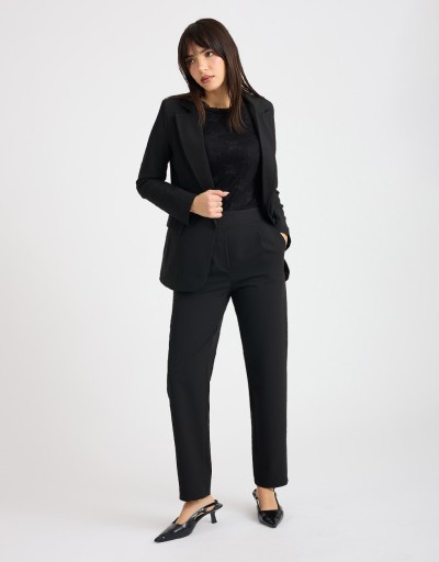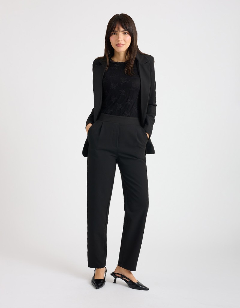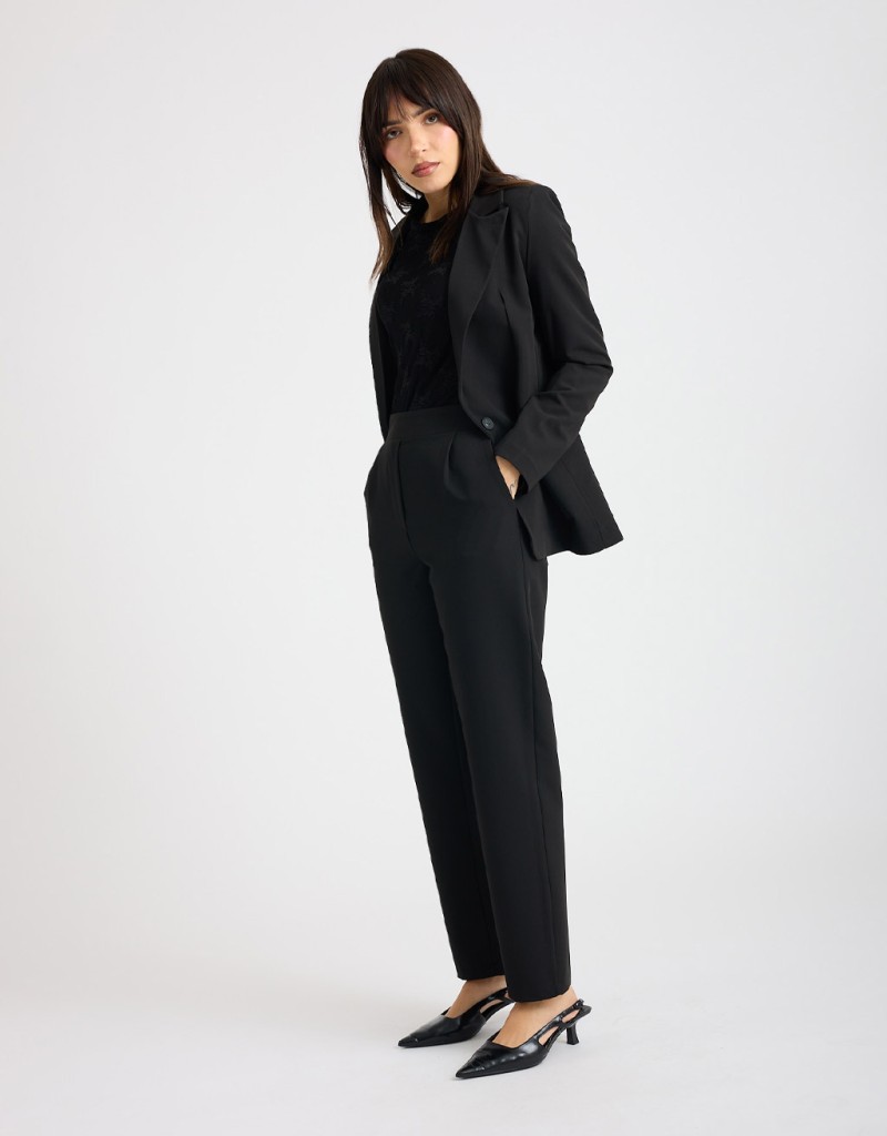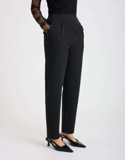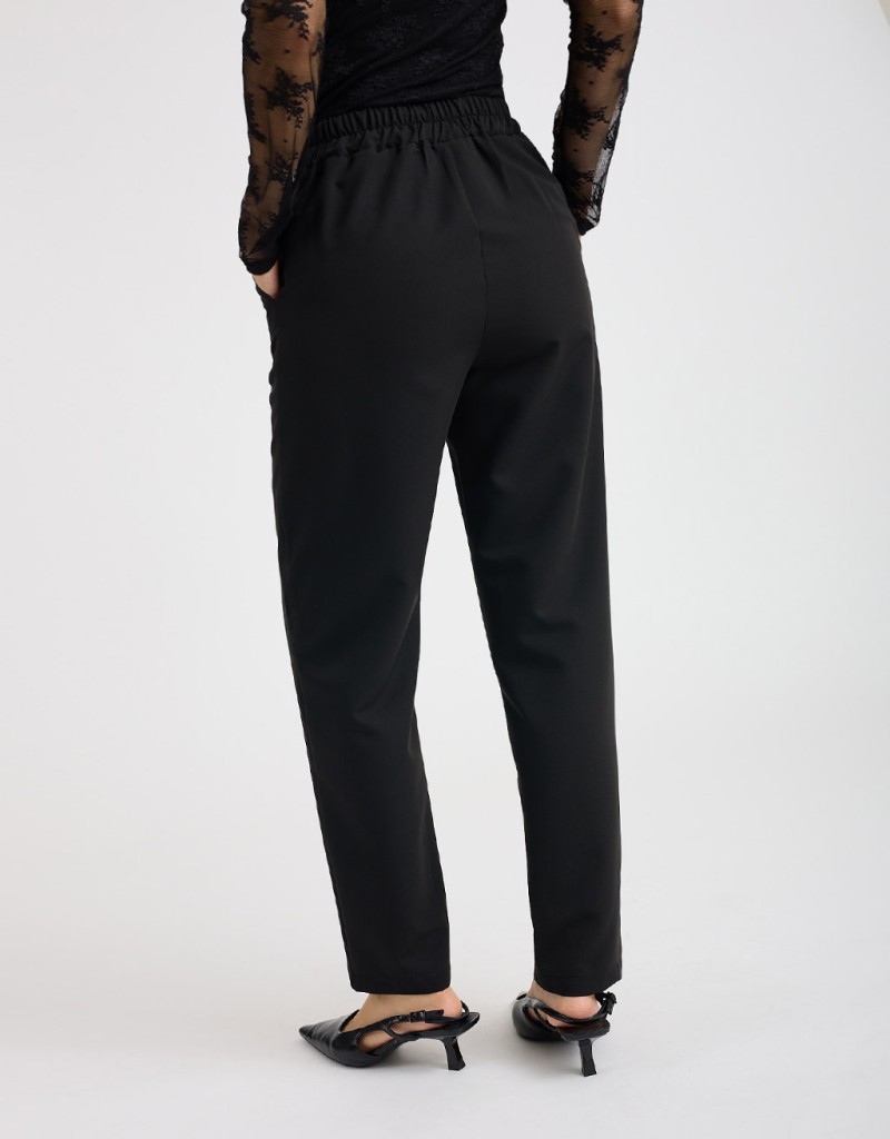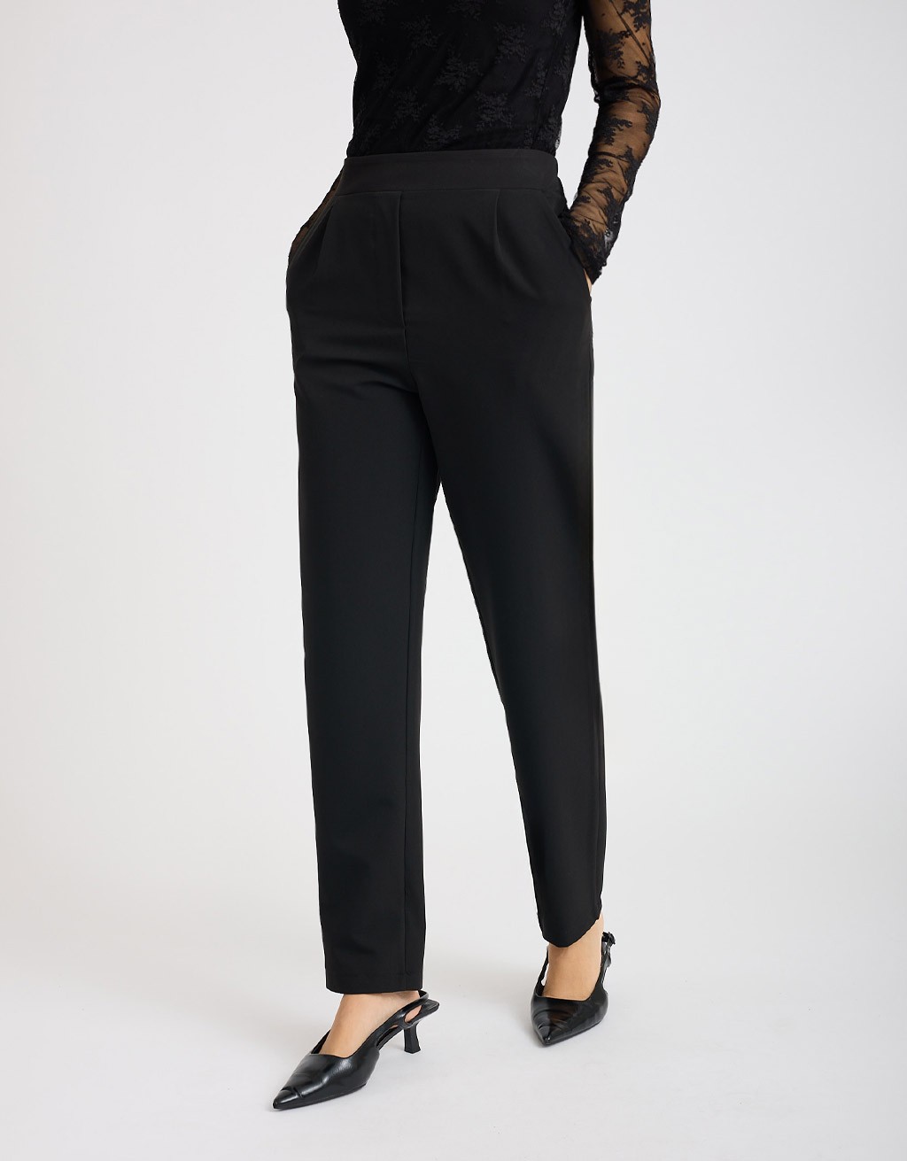 Pantalone in tessuto fresco e leggero a mano fredda, modello regular basico con elastico in vita e pinces frontali che valorizzano la silhouette. Linea comoda e versatile, perfetta per outfit primaverili ed estivi casual ma curati.