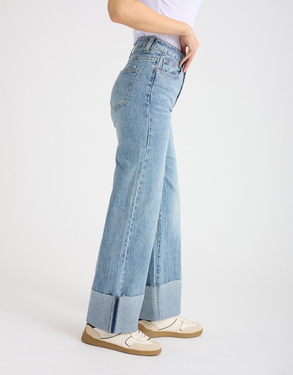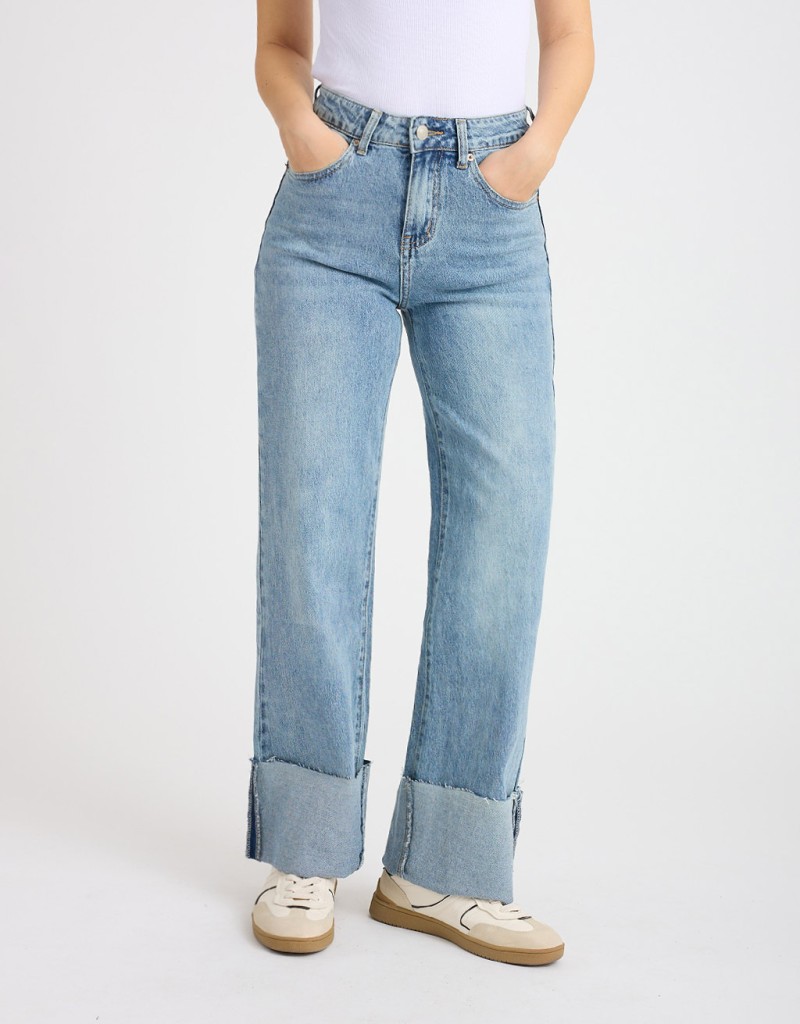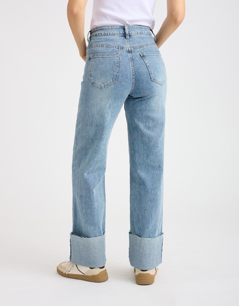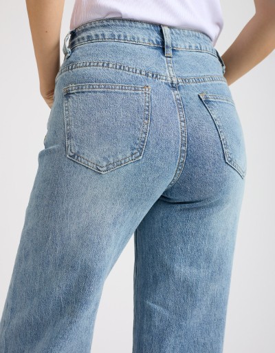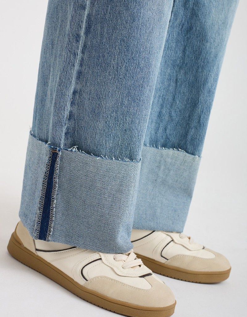 Jeans elasticizzati a palazzo, dal taglio ampio e fluido che valorizza ogni silhouette. Dotati di cinque tasche e chiusura frontale con bottone e cerniera, il modello è completato da un ampio risvolto sul fondo non cucito con orlo in taglio vivo, per un tocco casual e contemporaneo, perfetto per i look di mezza stagione.