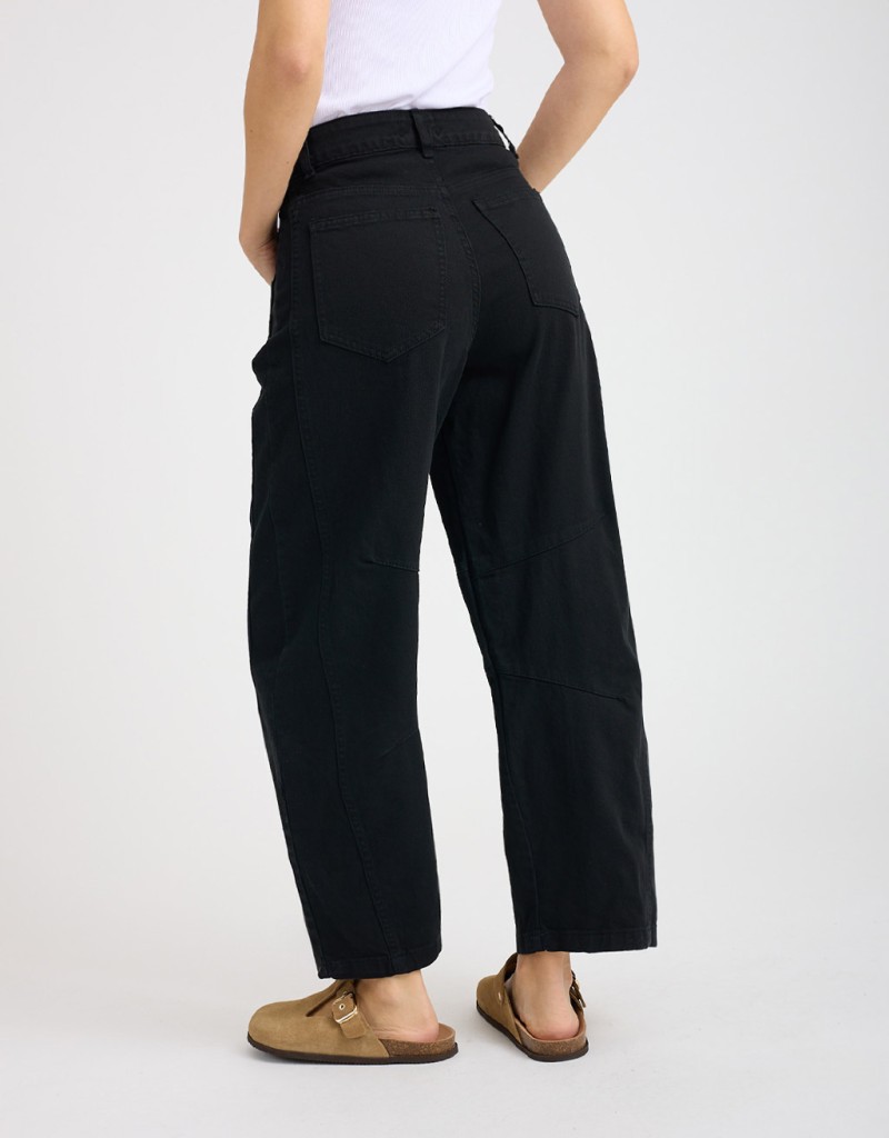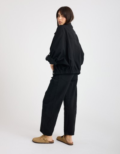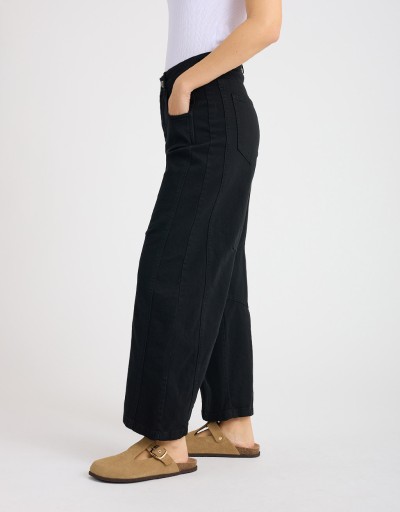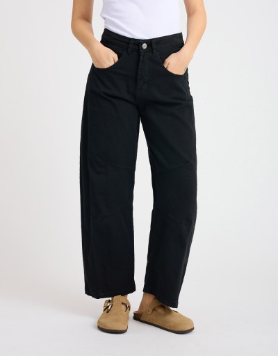 Pantalone in jeans elasticizzato colorato, modello barrel dal taglio morbido e moderno. La chiusura frontale con bottone e cerniera assicura praticità, mentre il tessuto elasticizzato garantisce comfort e libertà di movimento, perfetto per i look casual di tutti i giorni.