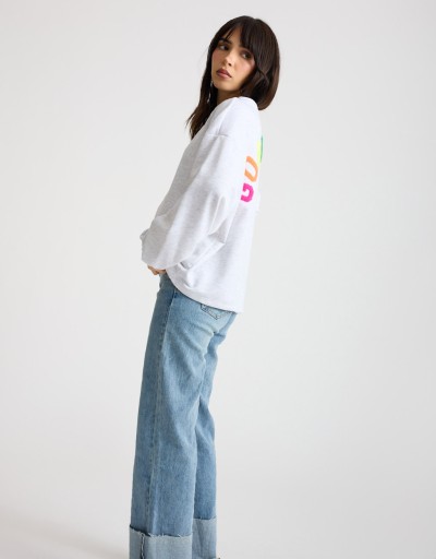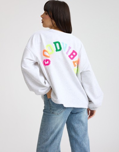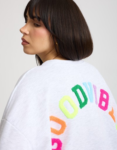 Felpa basica in morbido tessuto misto cotone, dal comfort assoluto e dalla vestibilità rilassata. La scollatura a giro è semplice e versatile, mentre la scritta multicolore “good vibes” cucita sulla schiena aggiunge un tocco allegro e contemporaneo. Perfetta per giornate casual o look sporty-chic con personalità.