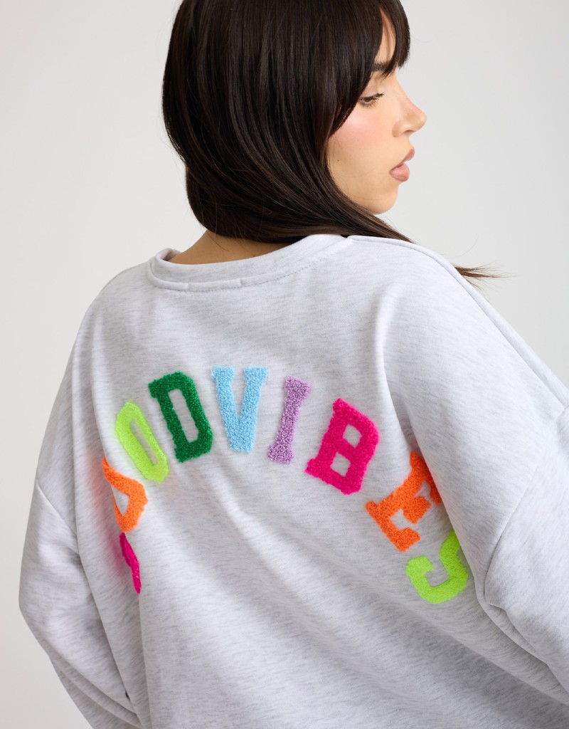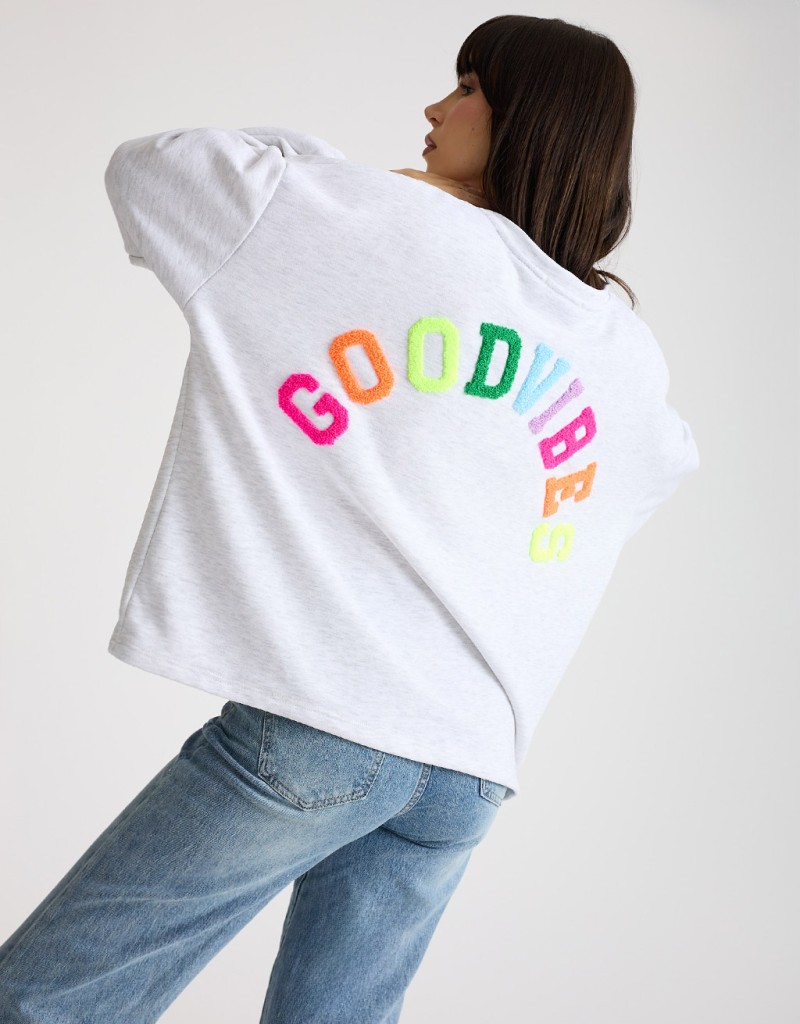 • Scritta multicolore “good vibes” cucita sulla schiena come dettaglio originale
