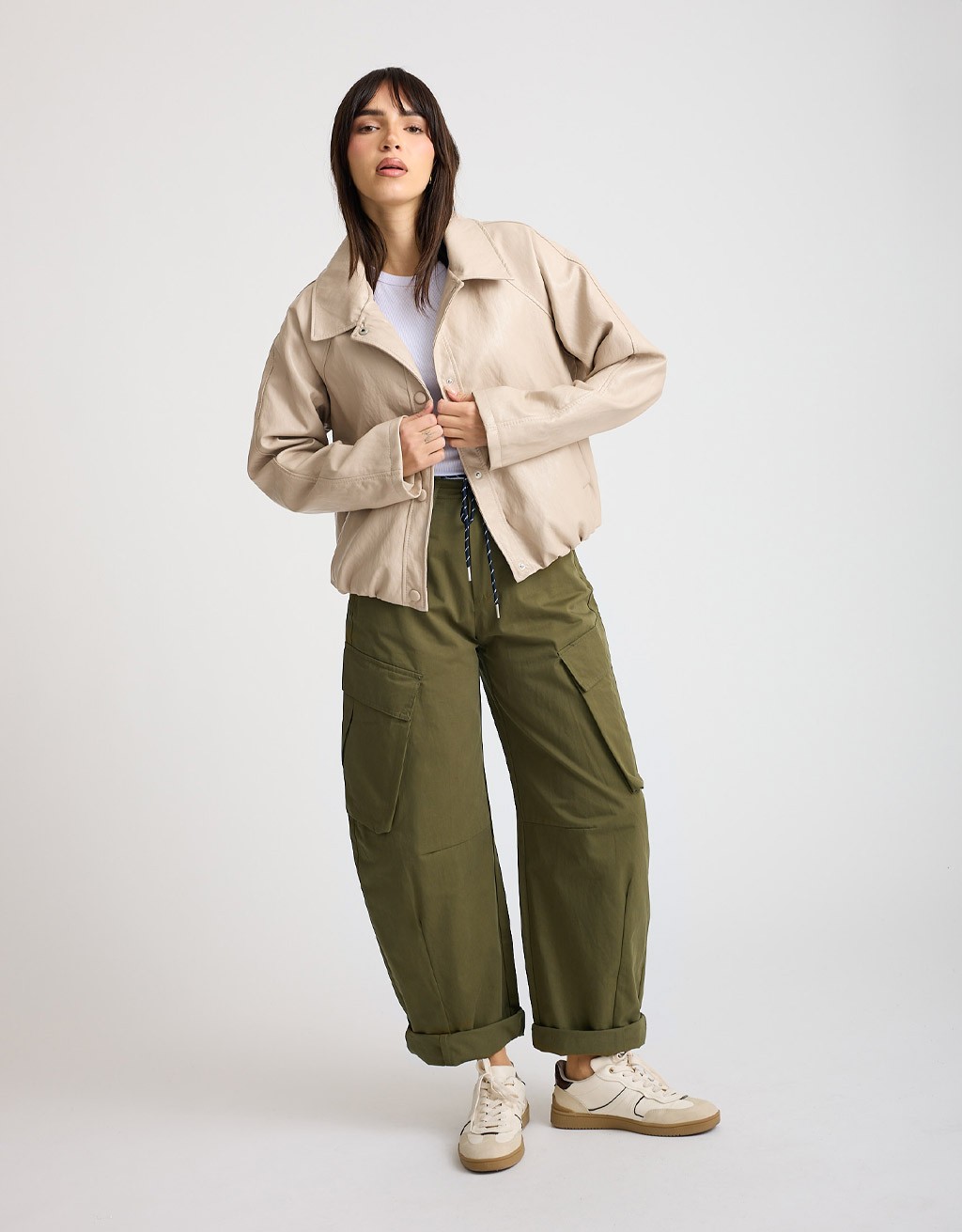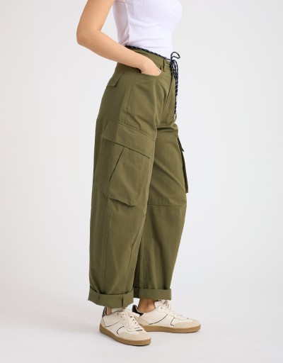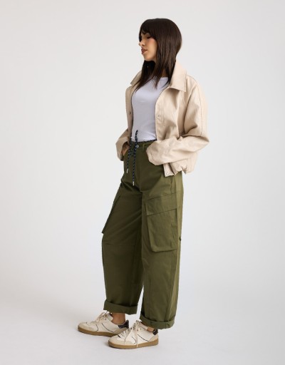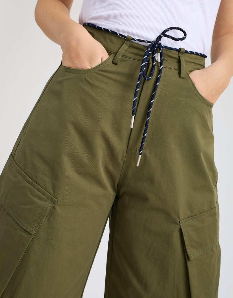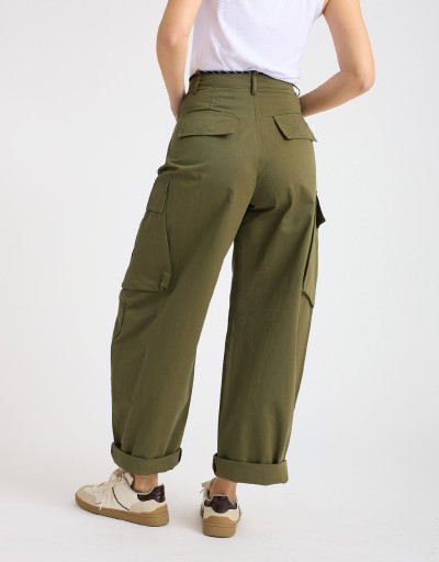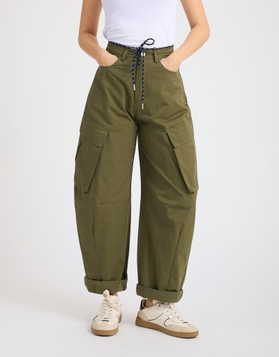 Pantalone in cotone fresco e leggero modello barrel, dal taglio morbido e contemporaneo. I tasconi con patta sulle gambe e le finte tasche dietro aggiungono un dettaglio funzionale e fashion, mentre la chiusura frontale con bottone e cerniera garantisce praticità. Ideale per look casual chic o giornate di relax con stile.