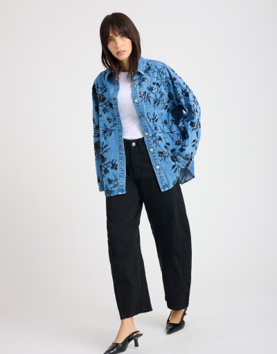Giacca camicia in jeans dal taglio leggero e versatile, con collo a revers e chiusura frontale con bottoni metallici. La tasca frontale e le decorazioni floreali con paillettes cucite donano un tocco femminile e brillante, rendendola perfetta per look casual chic o per arricchire outfit da giorno con stile e personalità.
