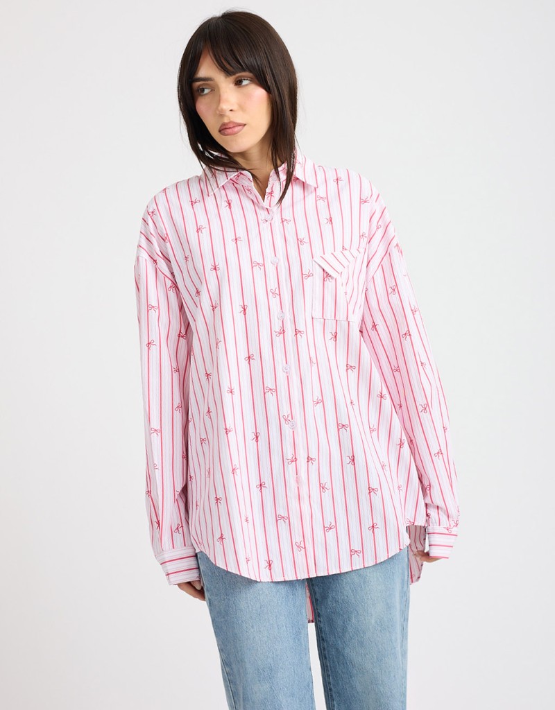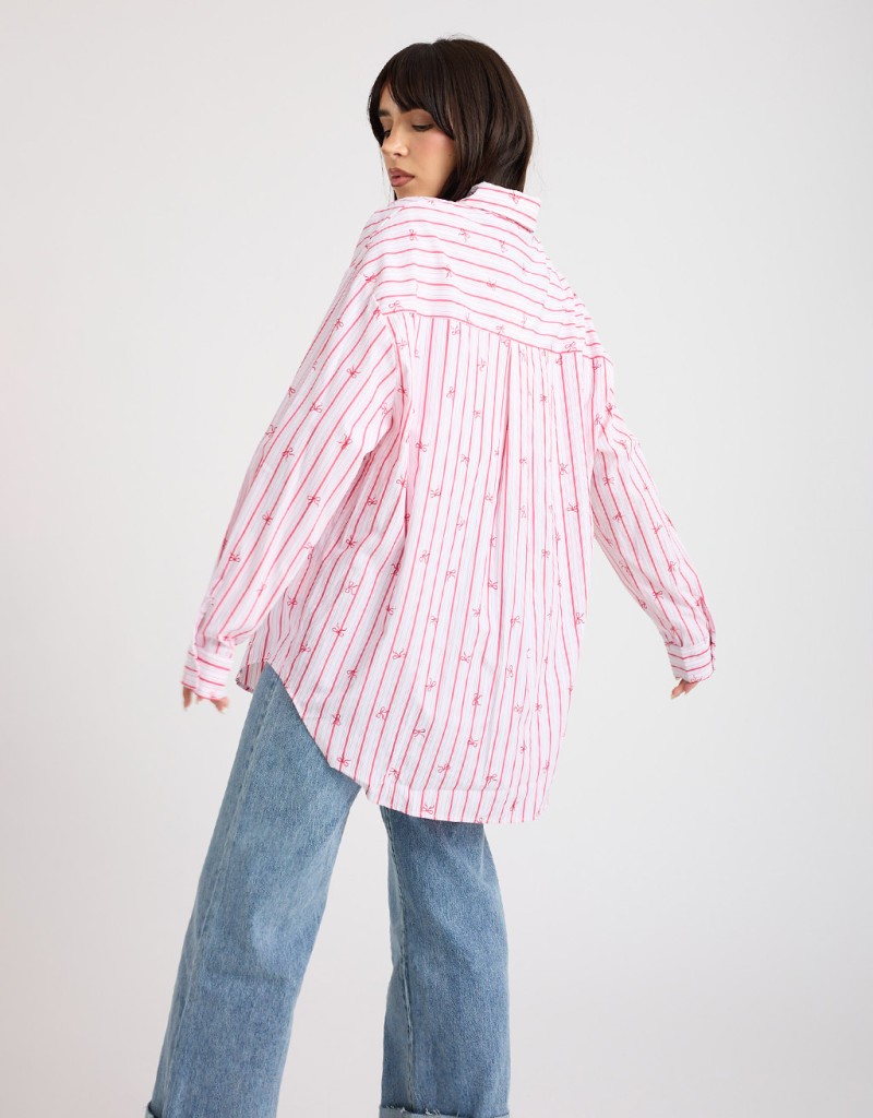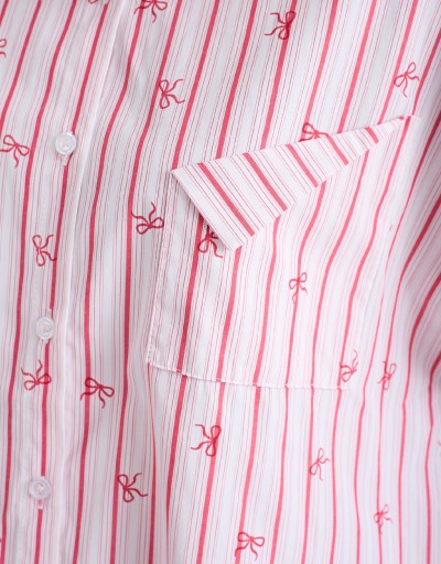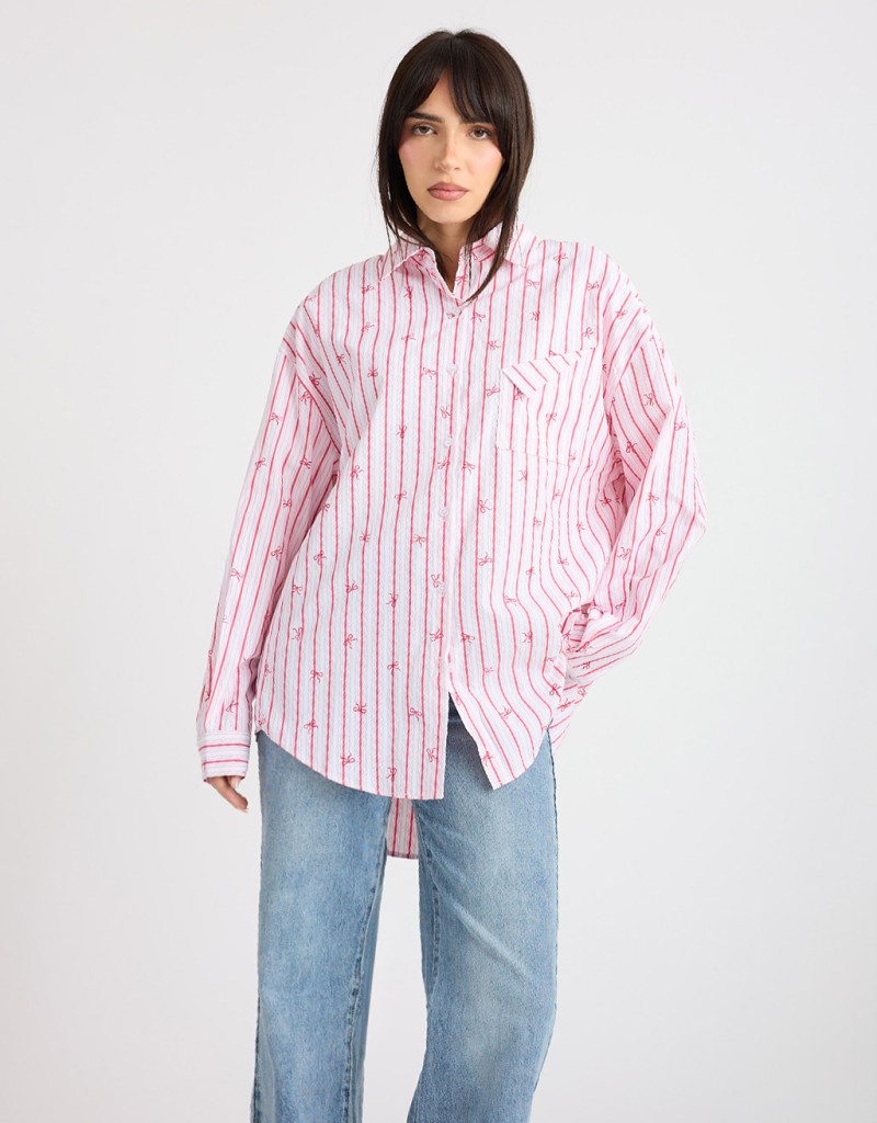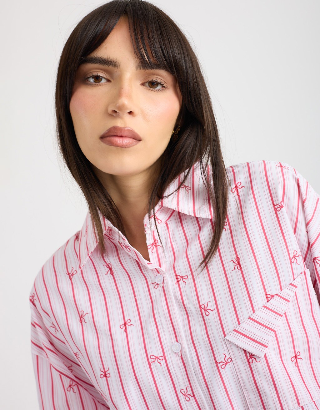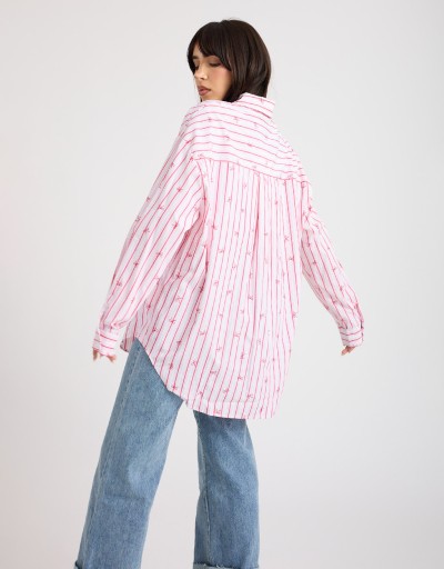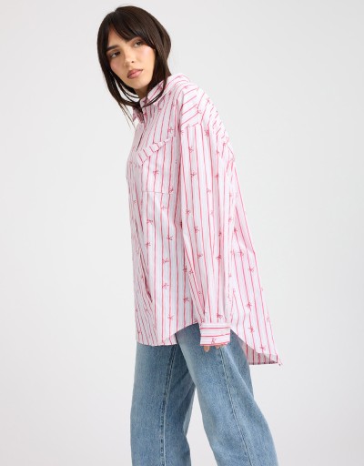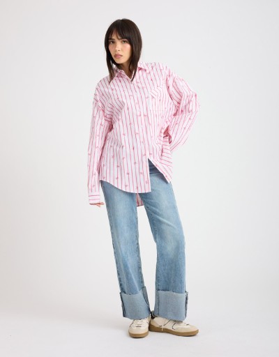 Camicia in misto cotone fresca e leggera, dal motivo a righe e stampa fiocchi che aggiungono un tocco femminile e raffinato. Il taschino con risvolto, il collo a revers e la chiusura frontale con bottoni completano il design, mentre la vestibilità morbida garantisce comfort e stile in ogni occasione. Perfetta per look da ufficio o casual chic.