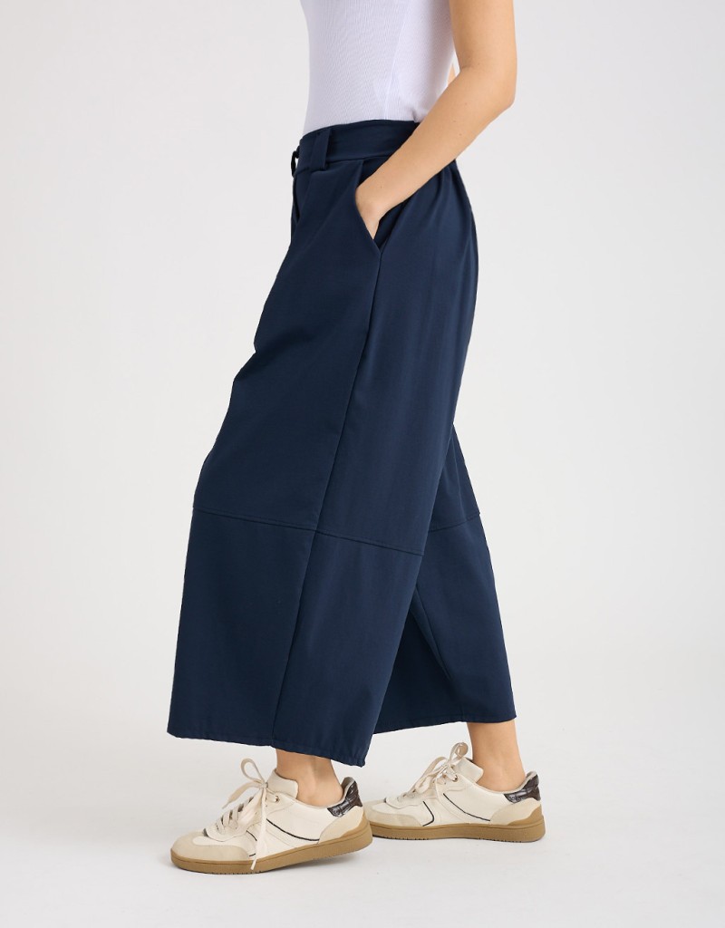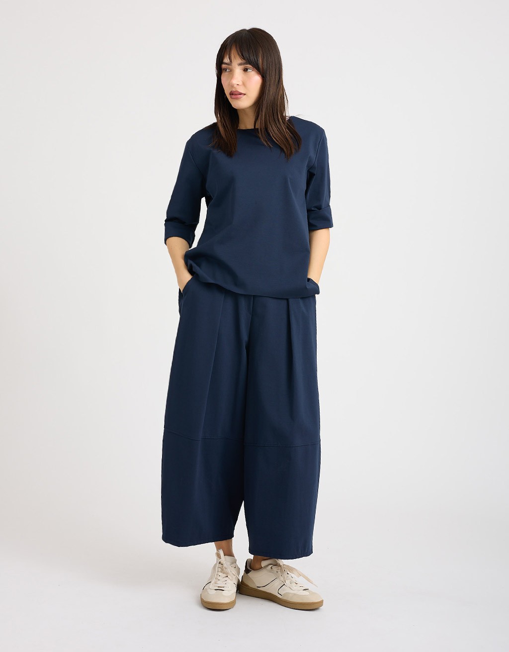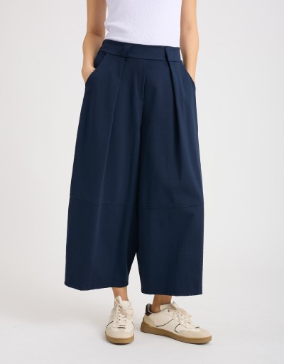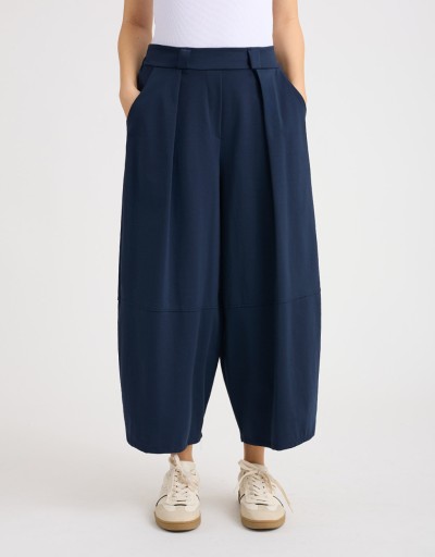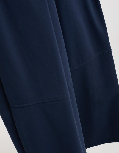 Pantalone in fresco tessuto elasticizzato modello balloon, dal taglio morbido e confortevole. L’elastico in vita adatta la vestibilità, mentre pinces frontali, tasche laterali e cuciture orizzontali alle ginocchia aggiungono dettagli di stile e movimento. Perfetto per look casual o per outfit coordinati con felpe e giacche morbide.