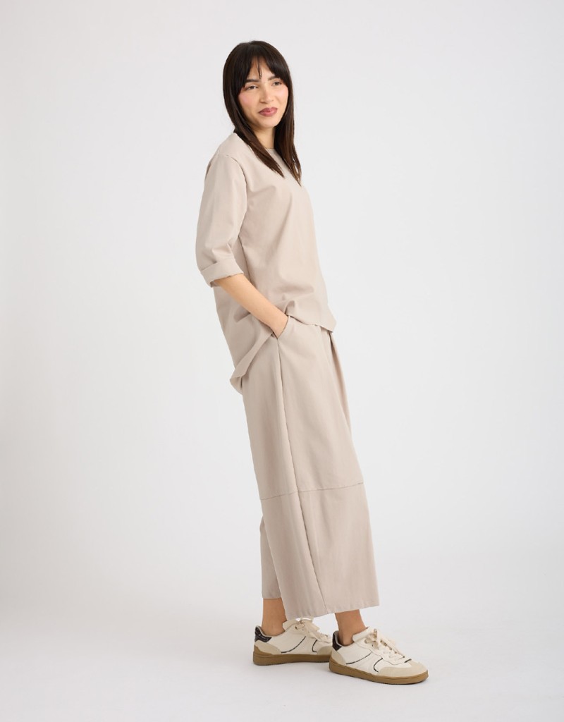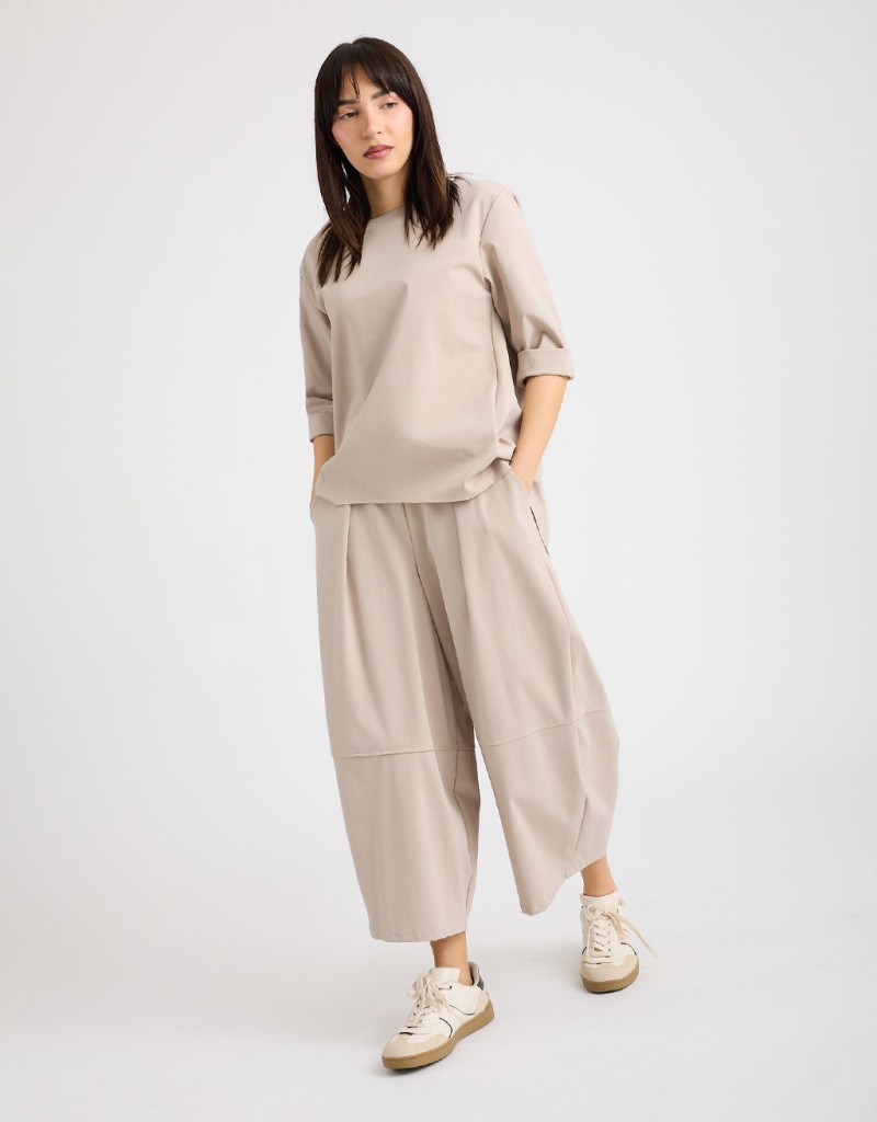 Pantalone in fresco tessuto elasticizzato modello balloon, dal taglio morbido e confortevole. L’elastico in vita adatta la vestibilità, mentre pinces frontali, tasche laterali e cuciture orizzontali alle ginocchia aggiungono dettagli di stile e movimento. Perfetto per look casual o per outfit coordinati con felpe e giacche morbide.