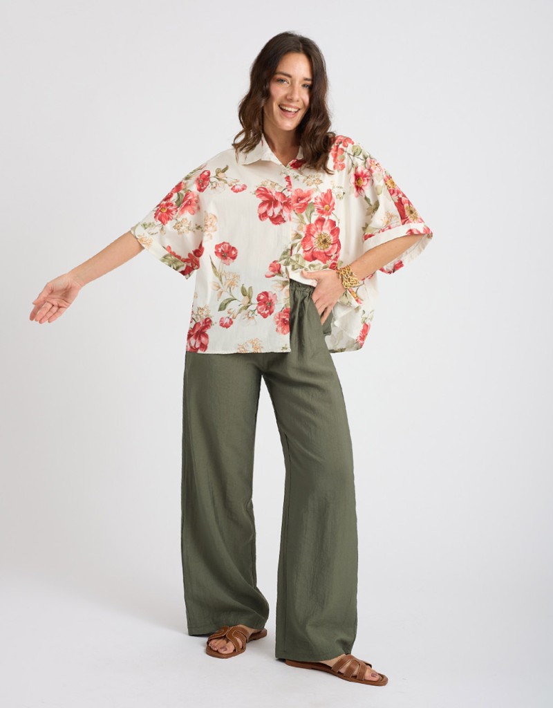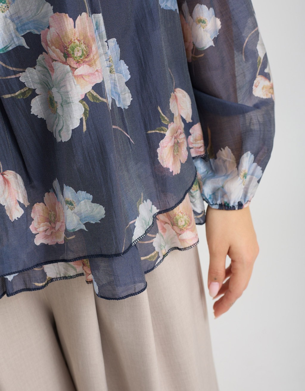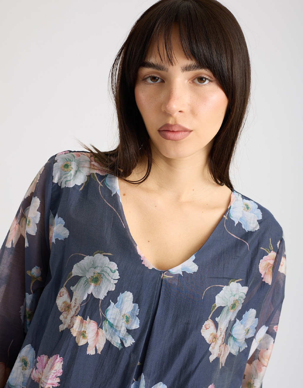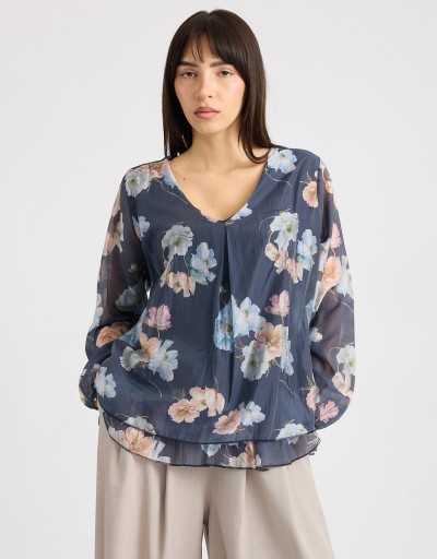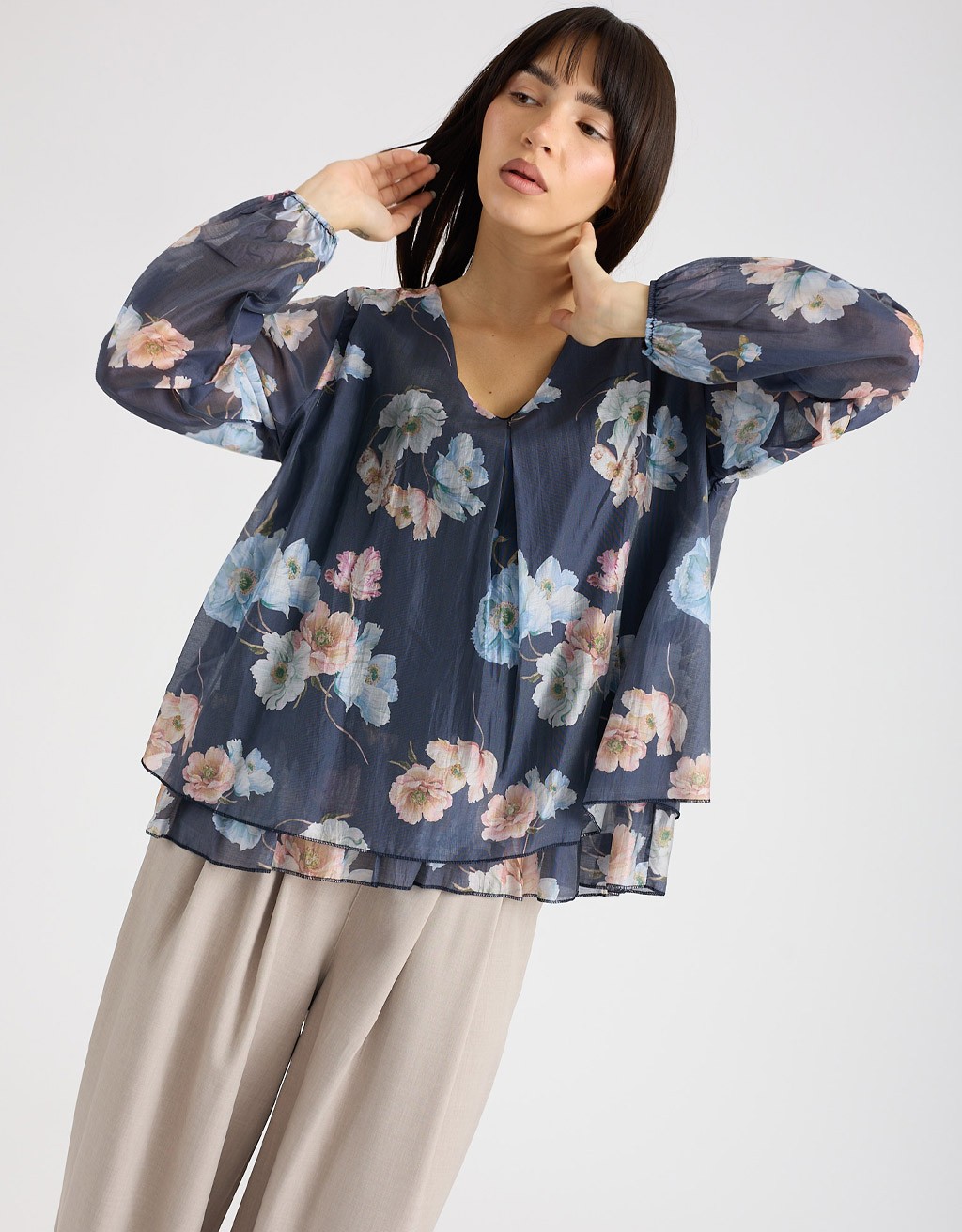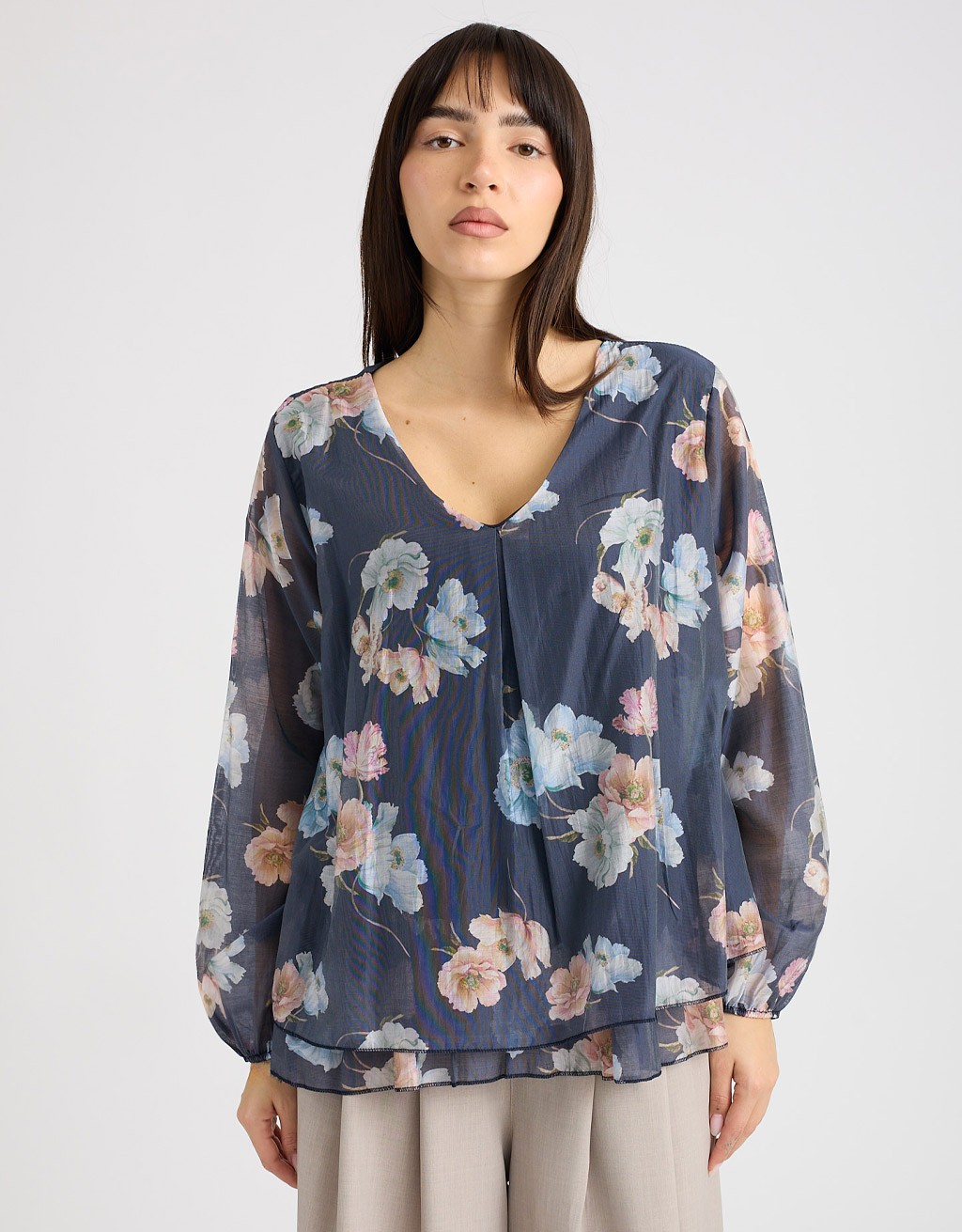 Blusa in lyocell fantasia floreale dal mood femminile e contemporaneo. I due strati sovrapposti, con quello interno più lungo, creano una leggera balza che dona movimento e copre con discrezione le trasparenze. La vestibilità over scivola morbida sulla silhouette, mentre la scollatura a V slancia e illumina il décolleté: perfetta per look curati ma rilassati di stagione.